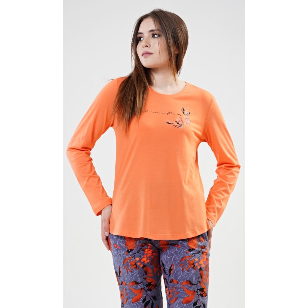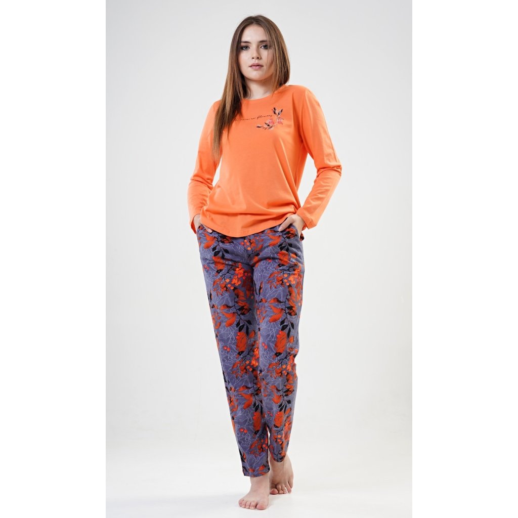 Dámské bavlněné pyžamo dlouhé Nicol. Dámské pyžamo se skládá z trička s dlouhým rukávem a dlouhých kalhot. Triko je jednobarevné, zdobené drobným nápisem a kvítky. Kalhoty jsou tmavě šedé, s potiskem větviček a lístků. Kalhoty mají gumu, šňůrku na stáhnutí a praktické kapsy. Použitý bavlněný materiál je poddajný a příjemný na dotek.