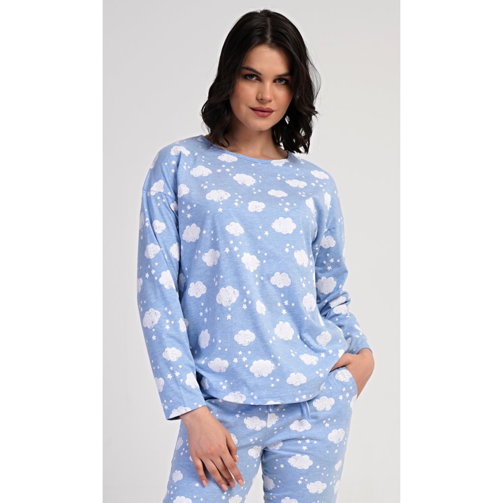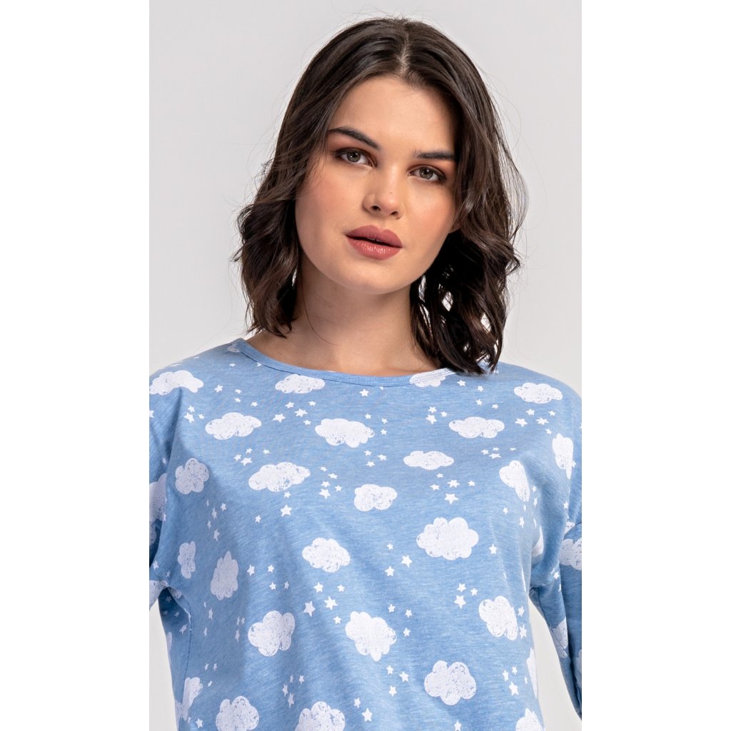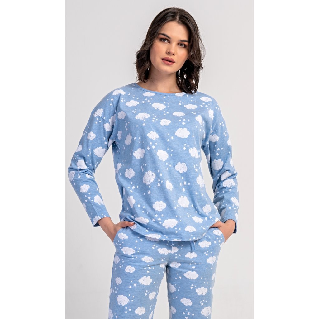 Dámské dlouhé pyžamo Obláček. Dámské pyžamo se skládá z trika s dlouhým rukávem a dlouhých kalhot. Triko je potištěno obláčky a hvězdičkami. Tento potisk se opakuje i na kalhotách, které mají v pase gumu a šňůrku na stažení, nemají kapsy. Použitý materiál s obsahem bavlny 70% je poddajný a příjemný na dotek.