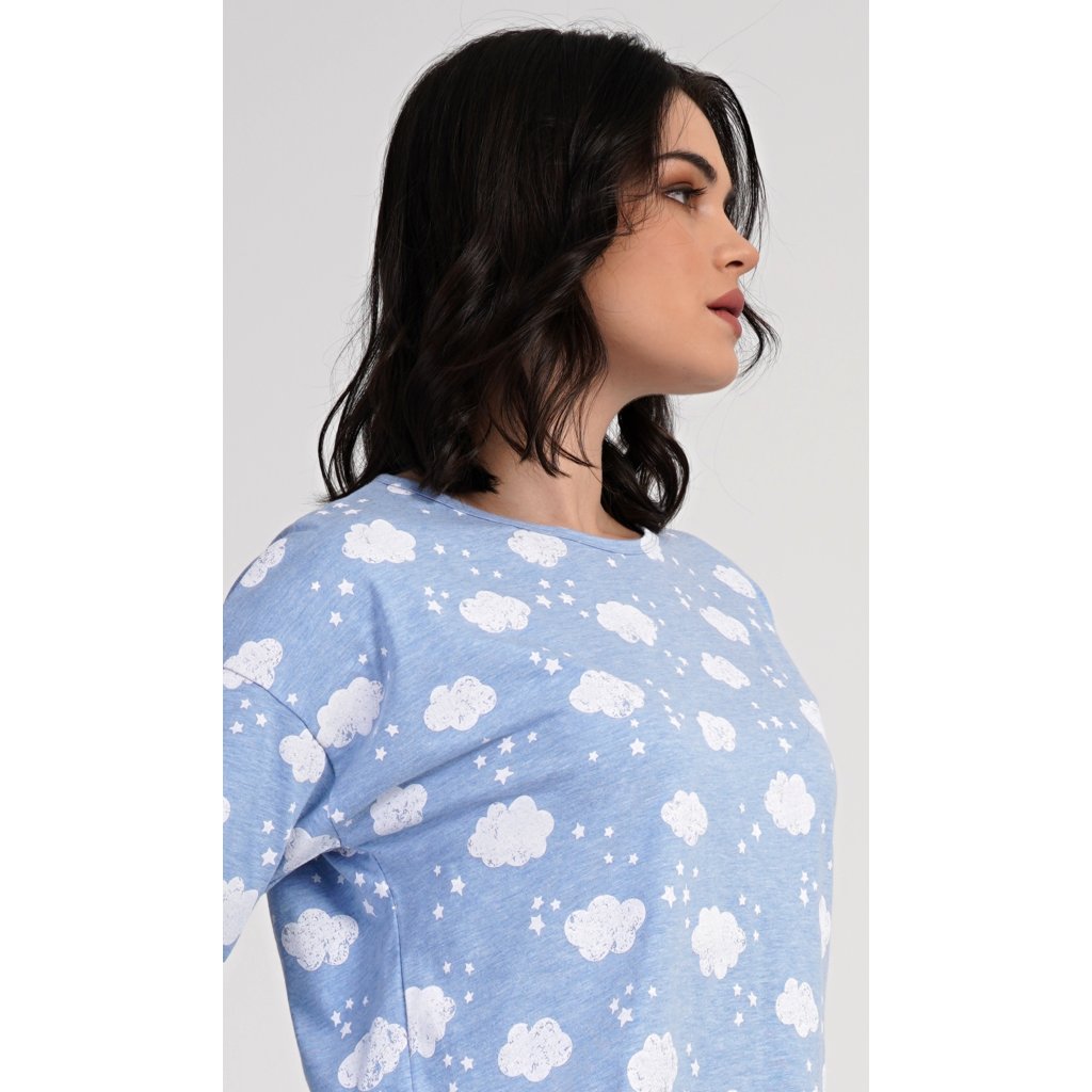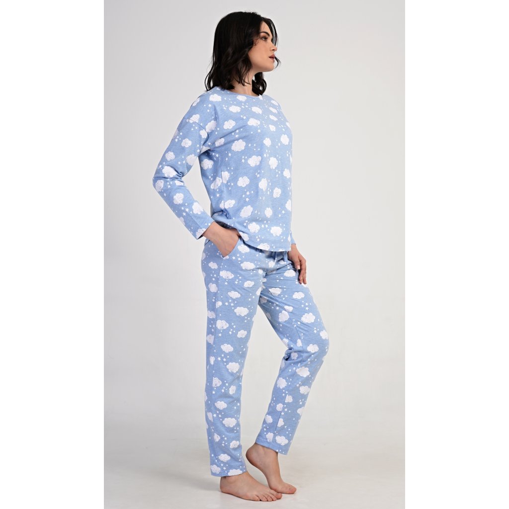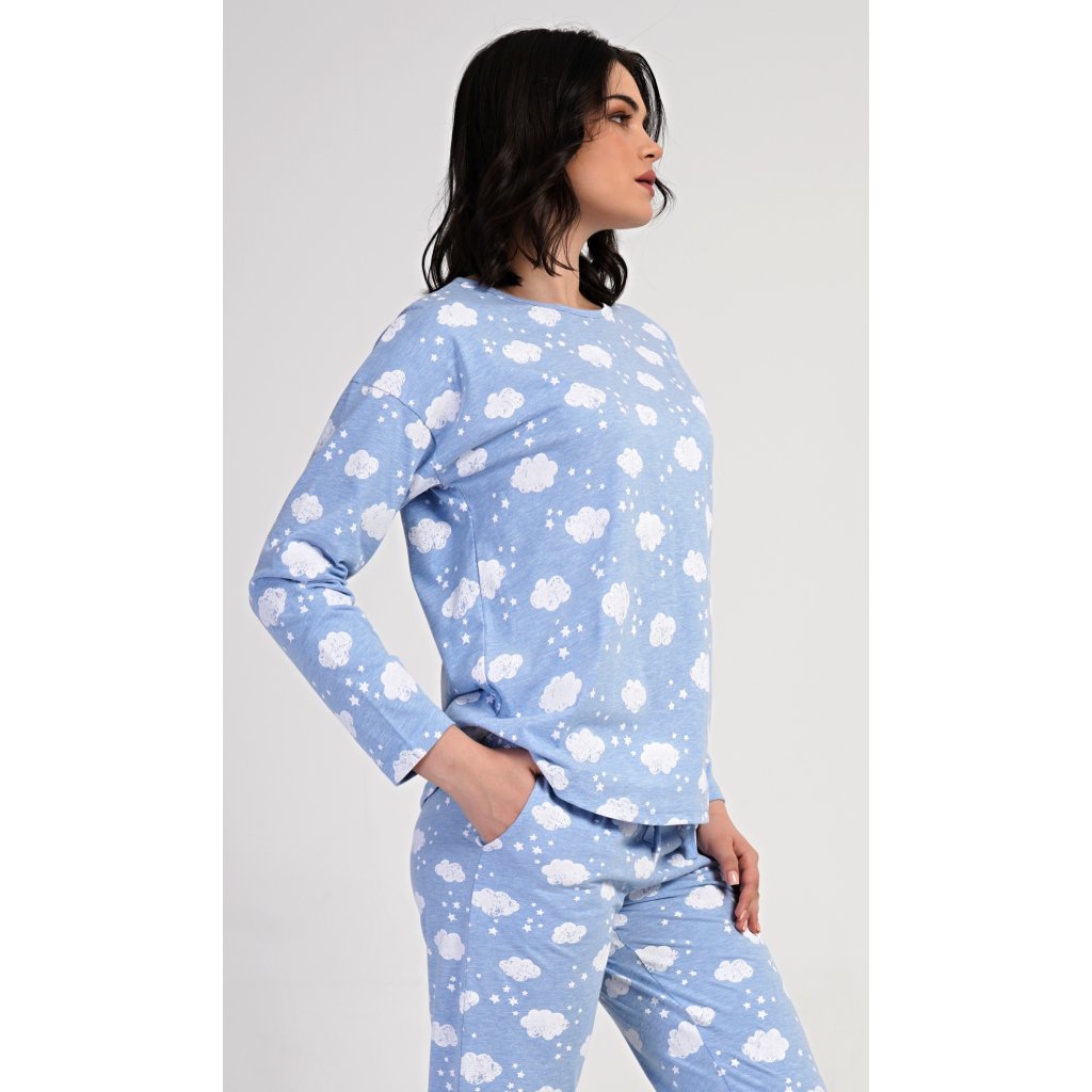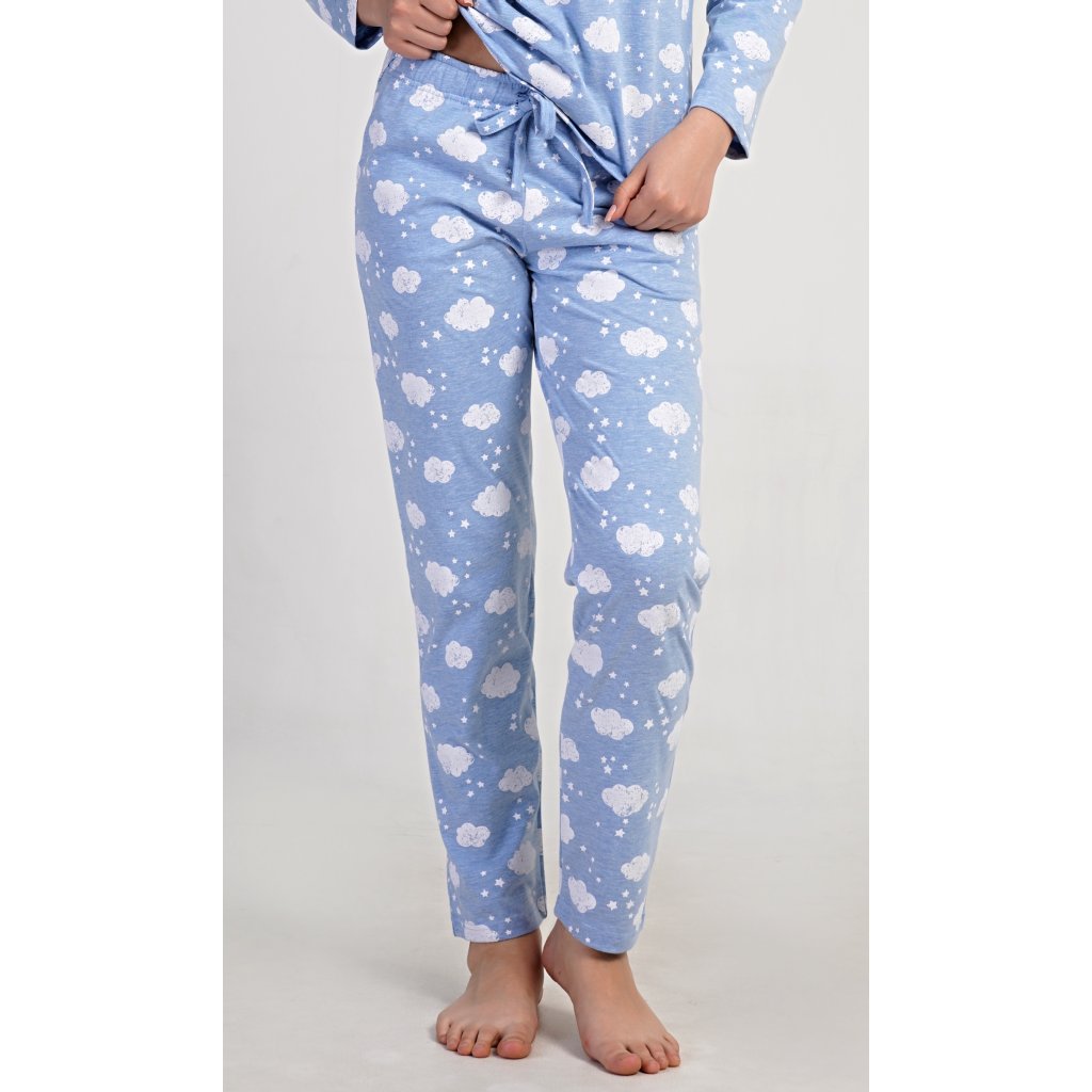 Dámské dlouhé pyžamo Obláček. Dámské pyžamo se skládá z trika s dlouhým rukávem a dlouhých kalhot. Triko je potištěno obláčky a hvězdičkami. Tento potisk se opakuje i na kalhotách, které mají v pase gumu a šňůrku na stažení, nemají kapsy. Použitý materiál s obsahem bavlny 70% je poddajný a příjemný na dotek.
