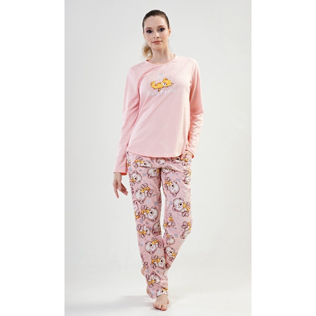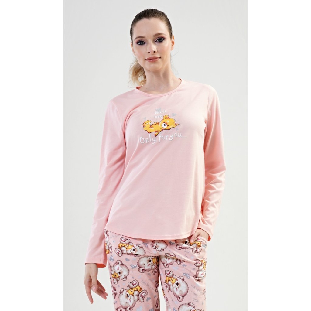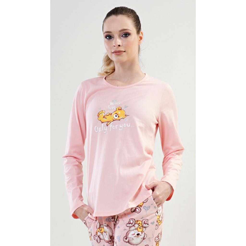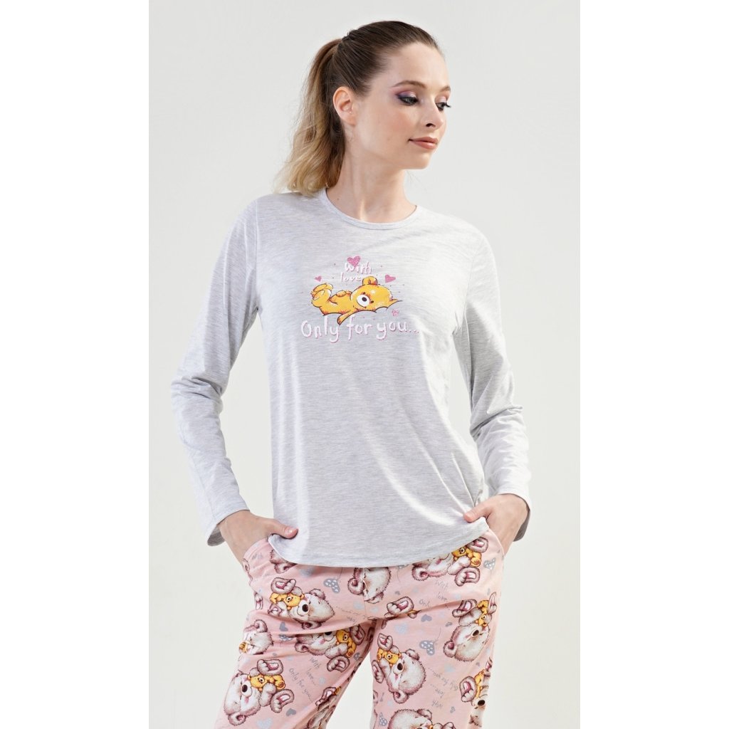 Dámské pyžamo dlouhé Only for you. Dámské pyžamo se skládá z trička s dlouhým rukávem a dlouhých kalhot. Triko je jednobarevné, zdobené potiskem ležícího plyšového medvěda a nápisem 'Only for you'. Kalhoty jsou světle lososové, potištěné plyšovými medvědy. Kalhoty mají v pase gumu, šňůrku na stažení a praktické kapsy. Použitý materiál je poddajný a příjemný na dotek. Triko je složeno ze 100% bavlnou u lososové barvy a ze 70% u šedé barvy, kalhoty mají obsah bavlny 100%.