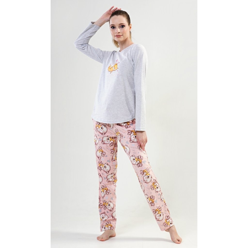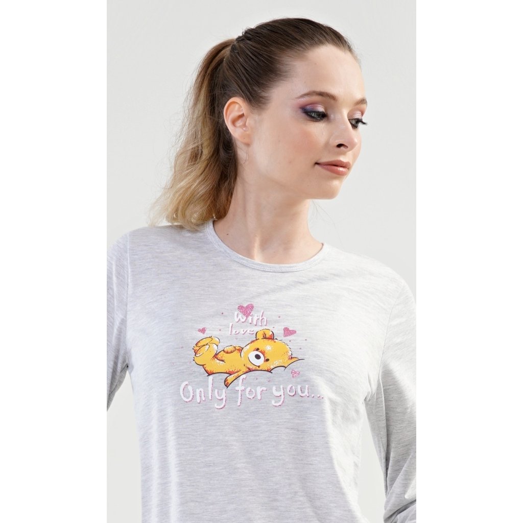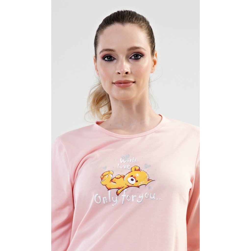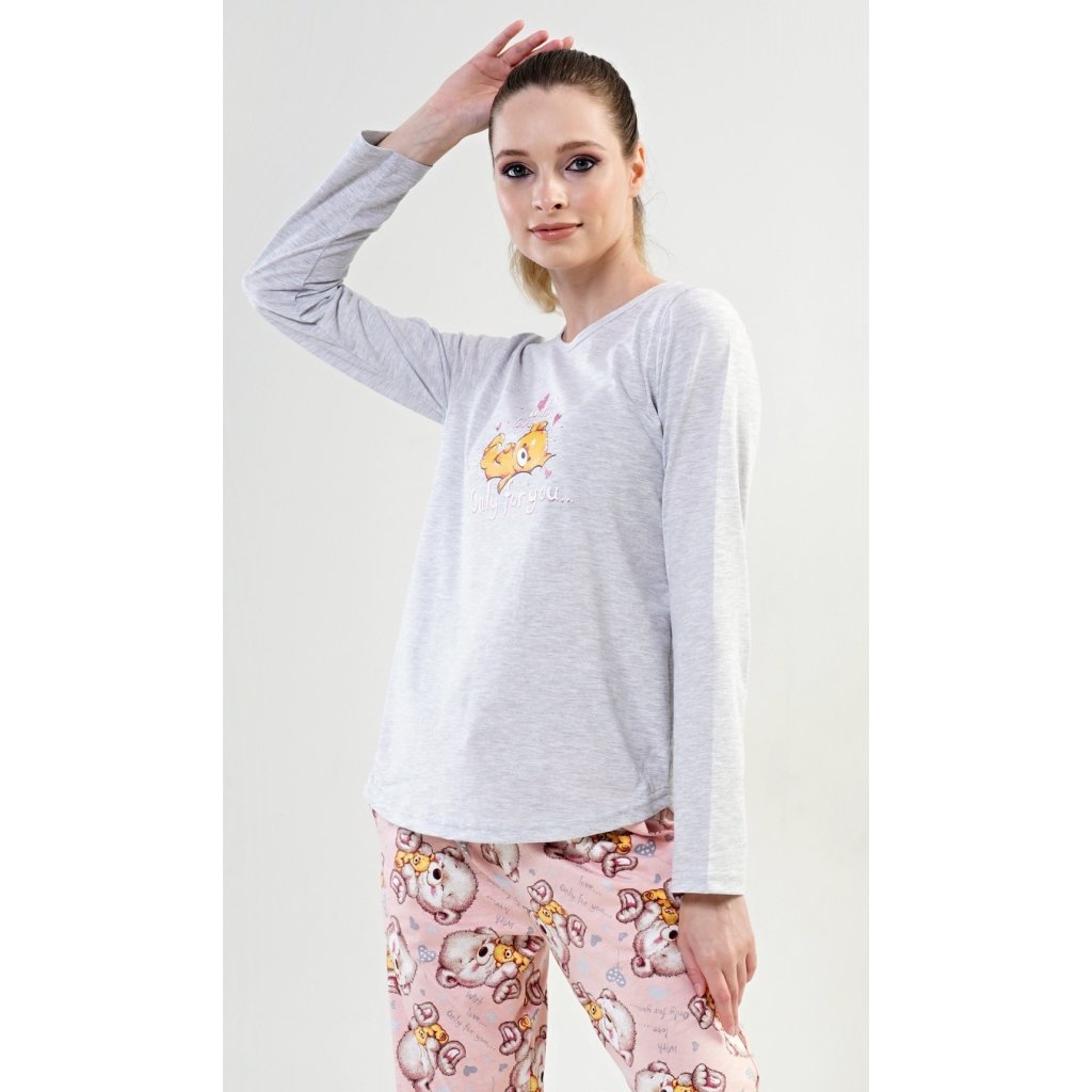Dámské pyžamo dlouhé Only for you. Dámské pyžamo se skládá z trička s dlouhým rukávem a dlouhých kalhot. Triko je jednobarevné, zdobené potiskem ležícího plyšového medvěda a nápisem 'Only for you'. Kalhoty jsou světle lososové, potištěné plyšovými medvědy. Kalhoty mají v pase gumu, šňůrku na stažení a praktické kapsy. Použitý materiál je poddajný a příjemný na dotek. Triko je složeno ze 100% bavlnou u lososové barvy a ze 70% u šedé barvy, kalhoty mají obsah bavlny 100%.