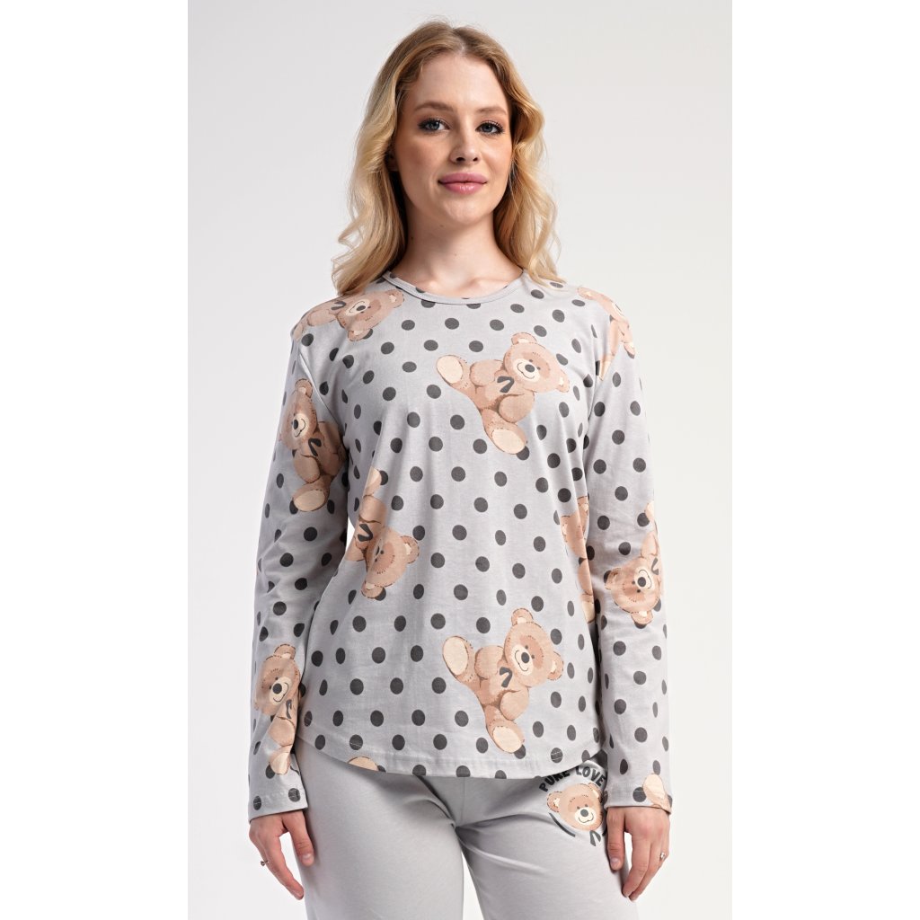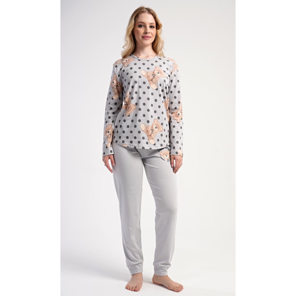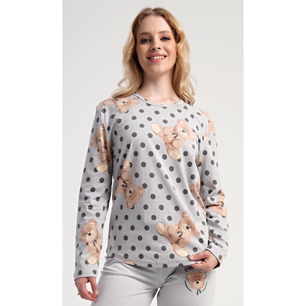 Dámské bavlněné dlouhé pyžamo Paula. Dámské pyžamo se skládá z trika s dlouhým rukávem a dlouhých kalhot. Jednobarevné triko je ozdobeno obrázkem medvědů. Tento motiv se opakuje i na kalhotách, které mají v pase gumu a šňůrku na stažení, nemají kapsy. Použitý bavlněný materiál je poddajný a příjemný na dotek.