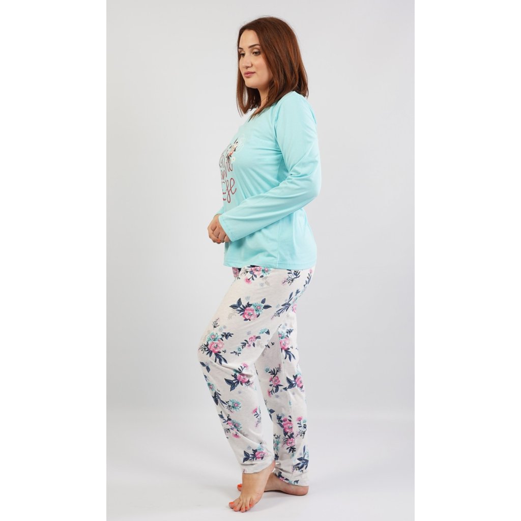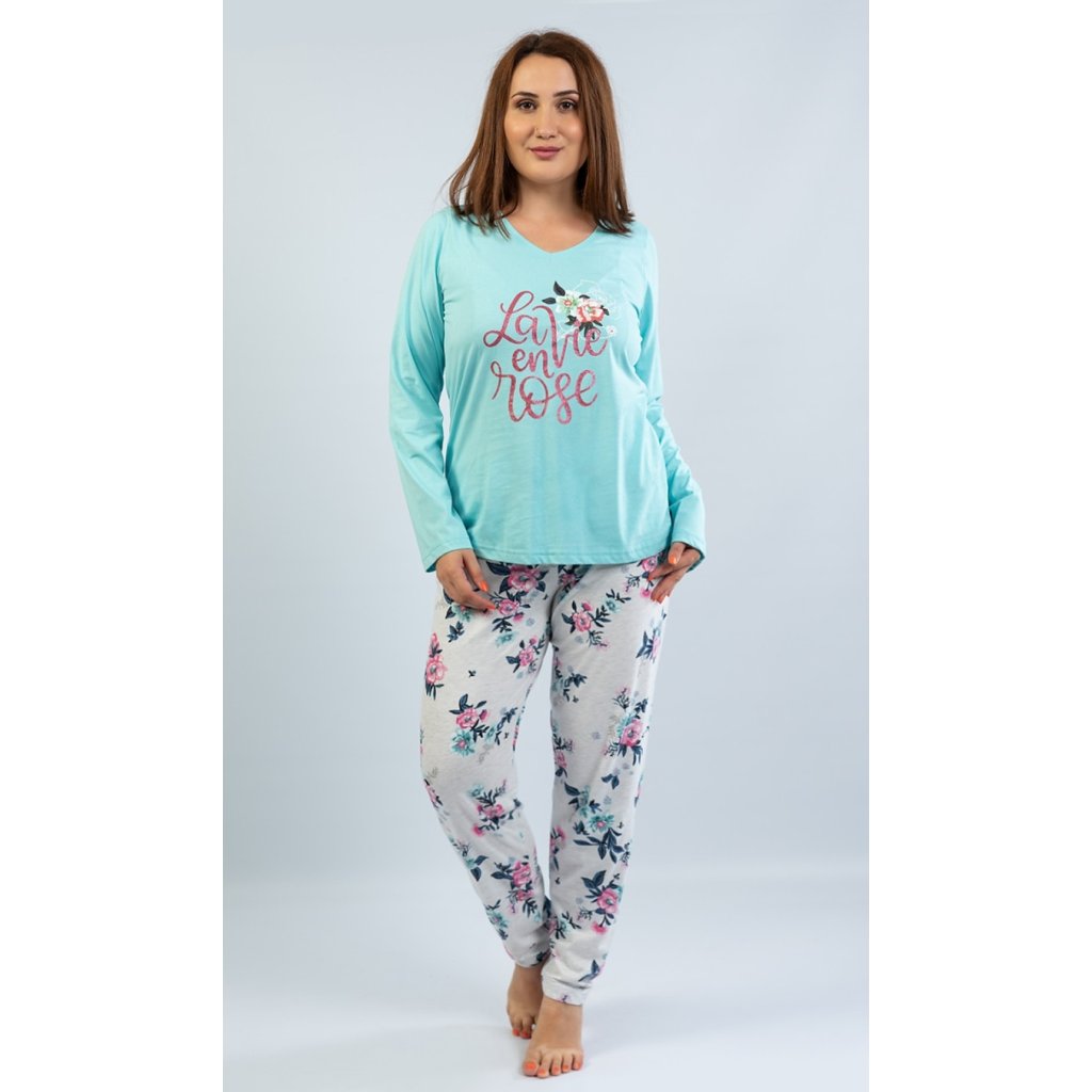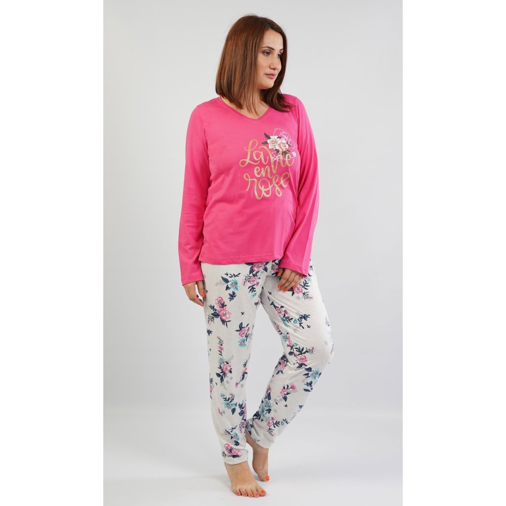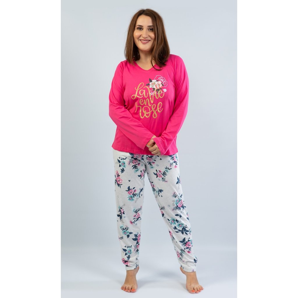 Dámské pyžamo dlouhé Rose. Dámské pyžamo se skládá z trika s dlouhým rukávem a dlouhých kalhot. Na jednobarevném triku je zlatý nápis 'La Vie en Rose' doplněný obrázkem růže. Motiv růže se opakuje i na dlouhých kalhotách, které mají v pase gumu a šňůrku na stažení, nemají kapsy. Použitý materiál je poddajný a příjemný na dotek. Triko je složeno ze 100% bavlnou, kalhoty mají obsah bavlny 100%.