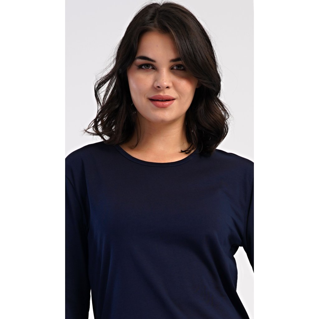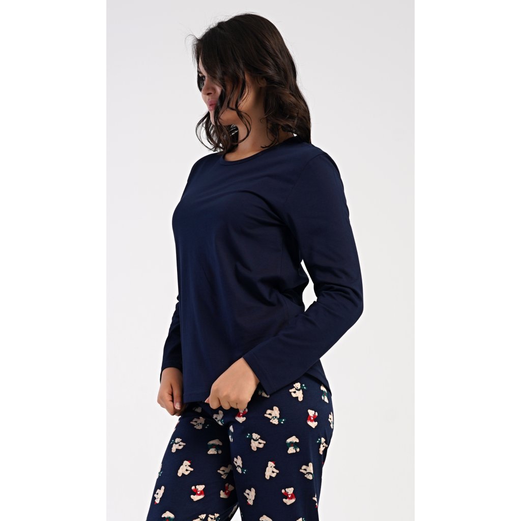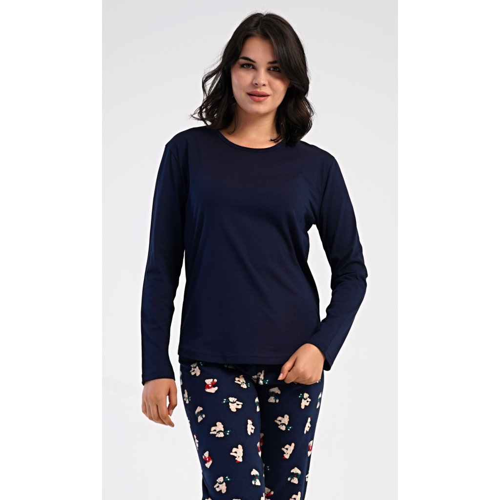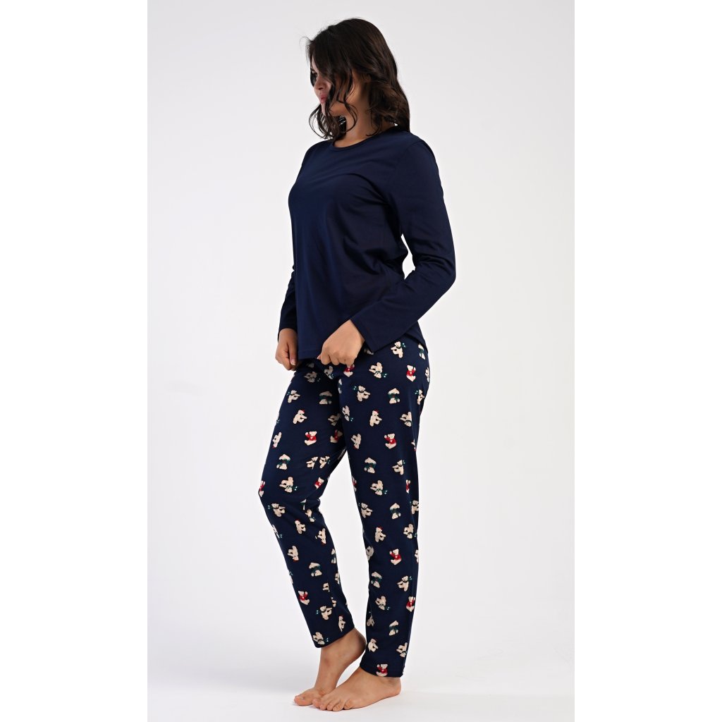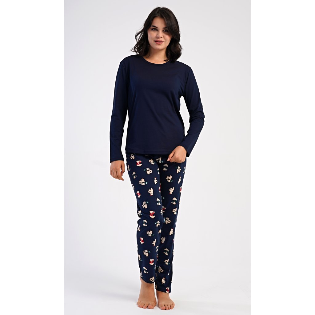Dámské bavlněné dlouhé pyžamo Sabrina. Dámské pyžamo se skládá z trika s dlouhým rukávem a dlouhých kalhot. Triko je jednobarevné, bez potisku, má kulatý výstřih. Kalhoty s potiskem medvídků mají v pase gumu a šňůrku na stažení, nemají kapsy. Použitý bavlněný materiál je poddajný a příjemný na dotek.