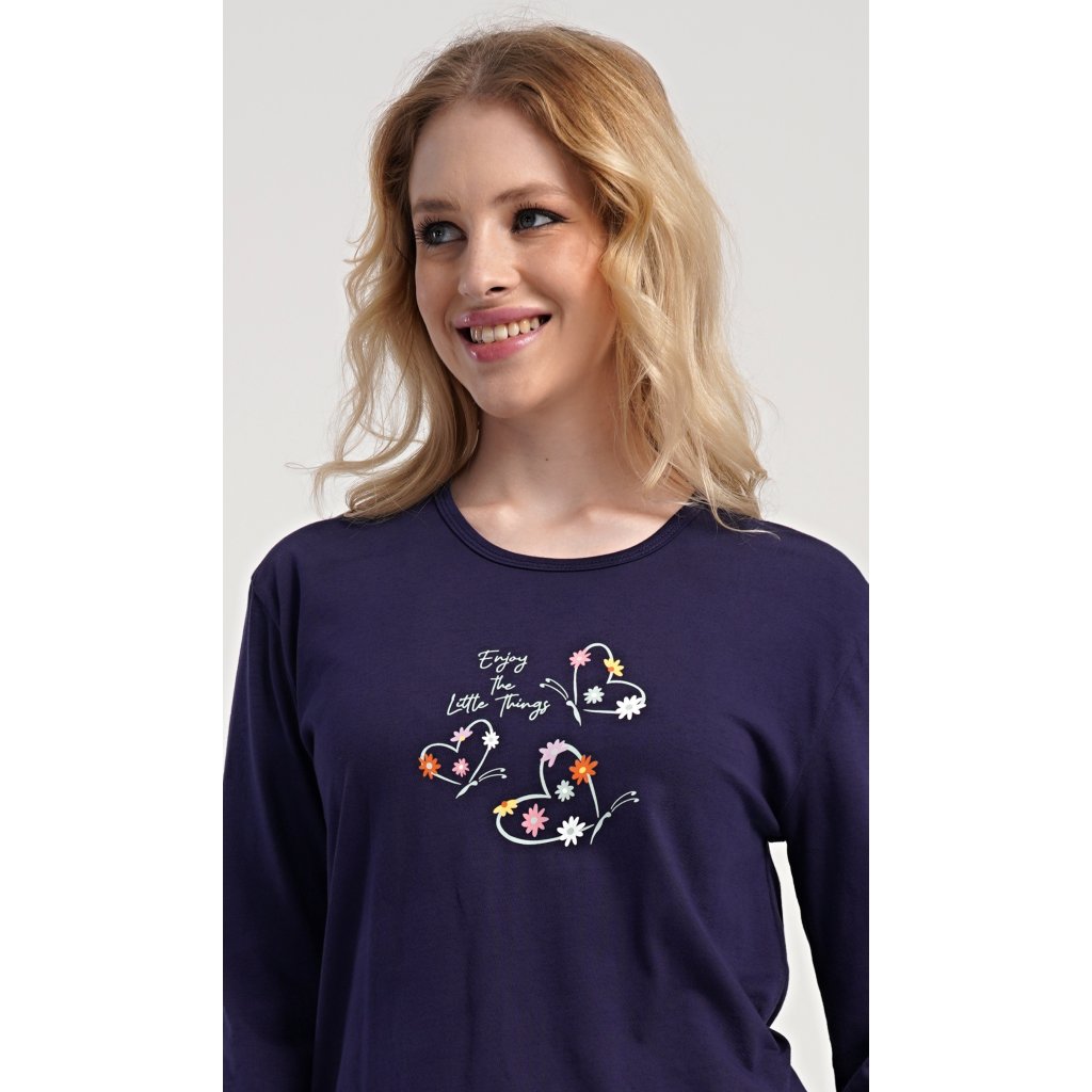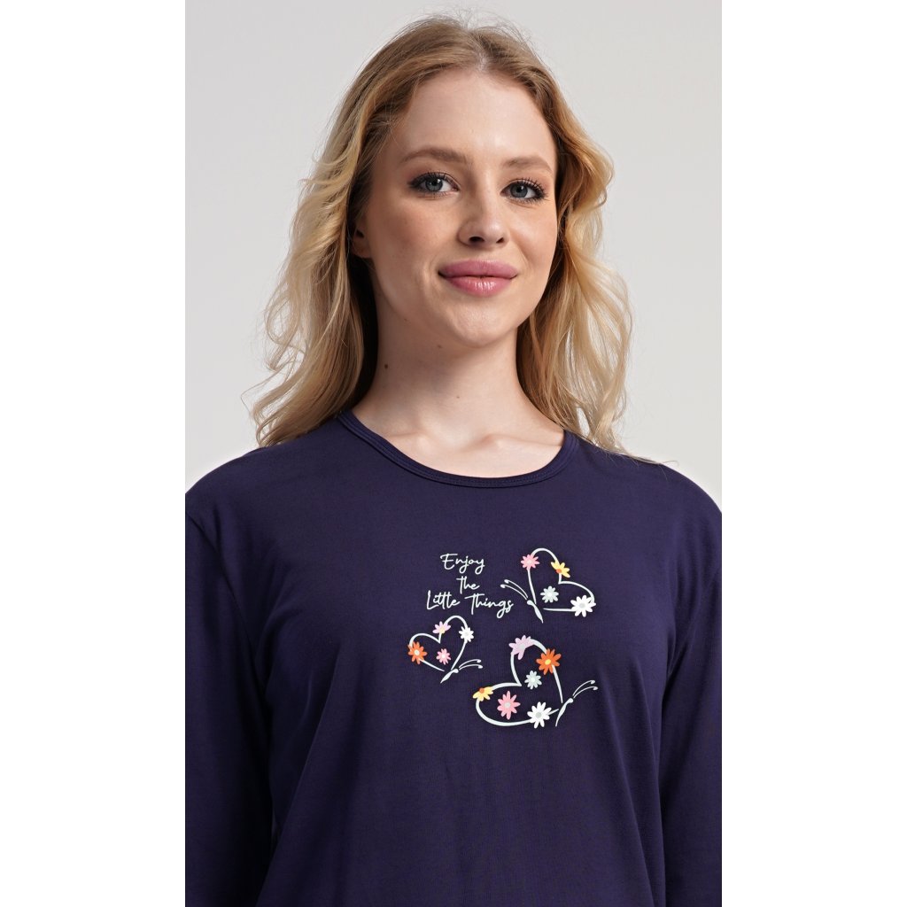 Dámské bavlněné dlouhé pyžamo Sarah. Dámské pyžamo se skládá z trika s dlouhým rukávem a dlouhých kalhot. Jednobarevné triko je ozdobeno obrázkem květů a motýlů. Květinový motiv se opakuje i na kalhotách, které mají v pase gumu a šňůrku na stažení, nemají kapsy. Použitý bavlněný materiál je poddajný a příjemný na dotek.