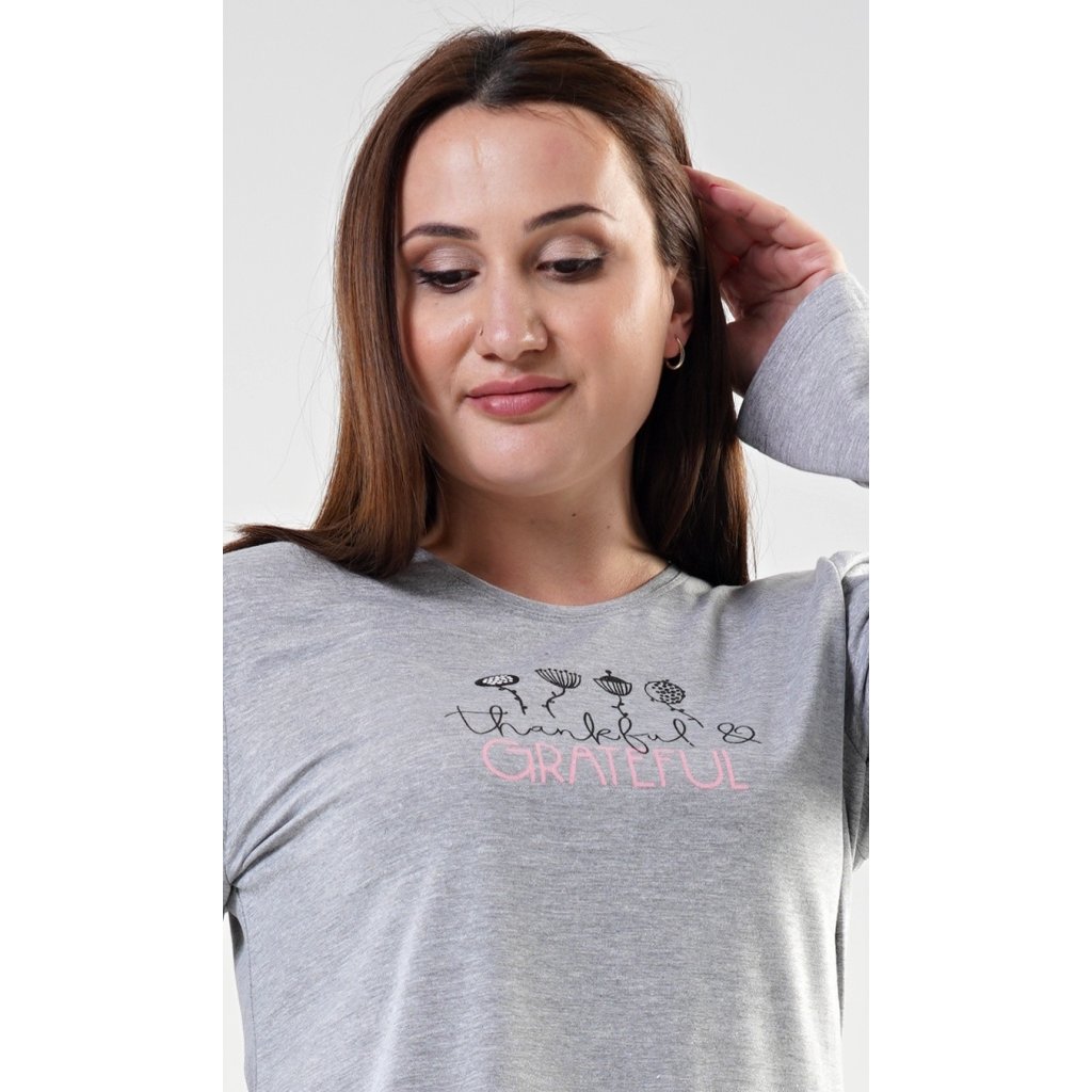 Dámské pyžamo dlouhé Simona. Dámské pyžamo se skládá z trička s dlouhým rukávem a dlouhých kalhot. Triko je jednobarevné, zdobené potiskem květů a nápisem 'Thankful and grateful'. Kalhoty jsou světle lososové, potištěné černými puntíky. Kalhoty jsou do gumy, na stažení šňůrkou a mají kapsy. Použitý materiál je poddajný a jemný na dotek.