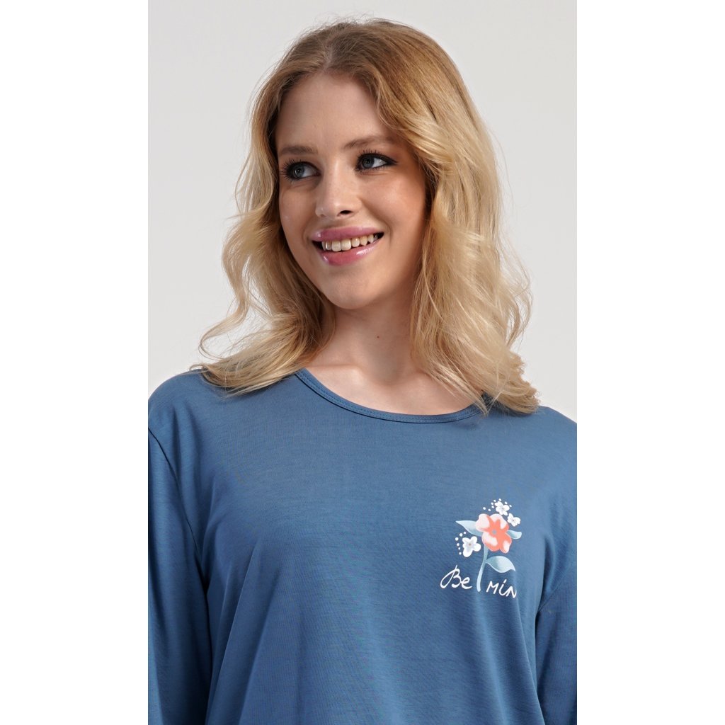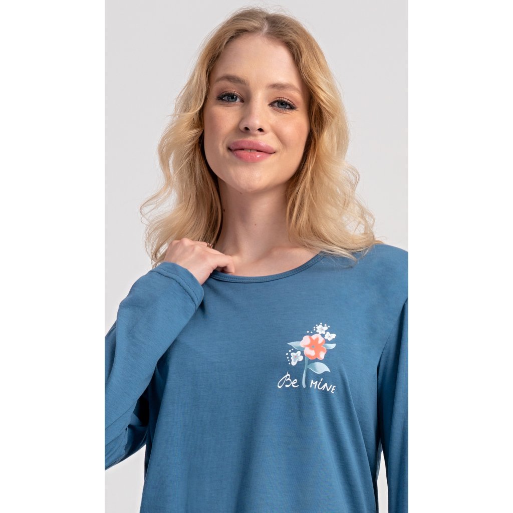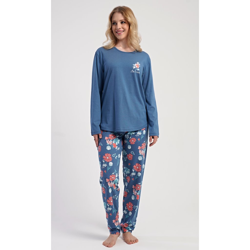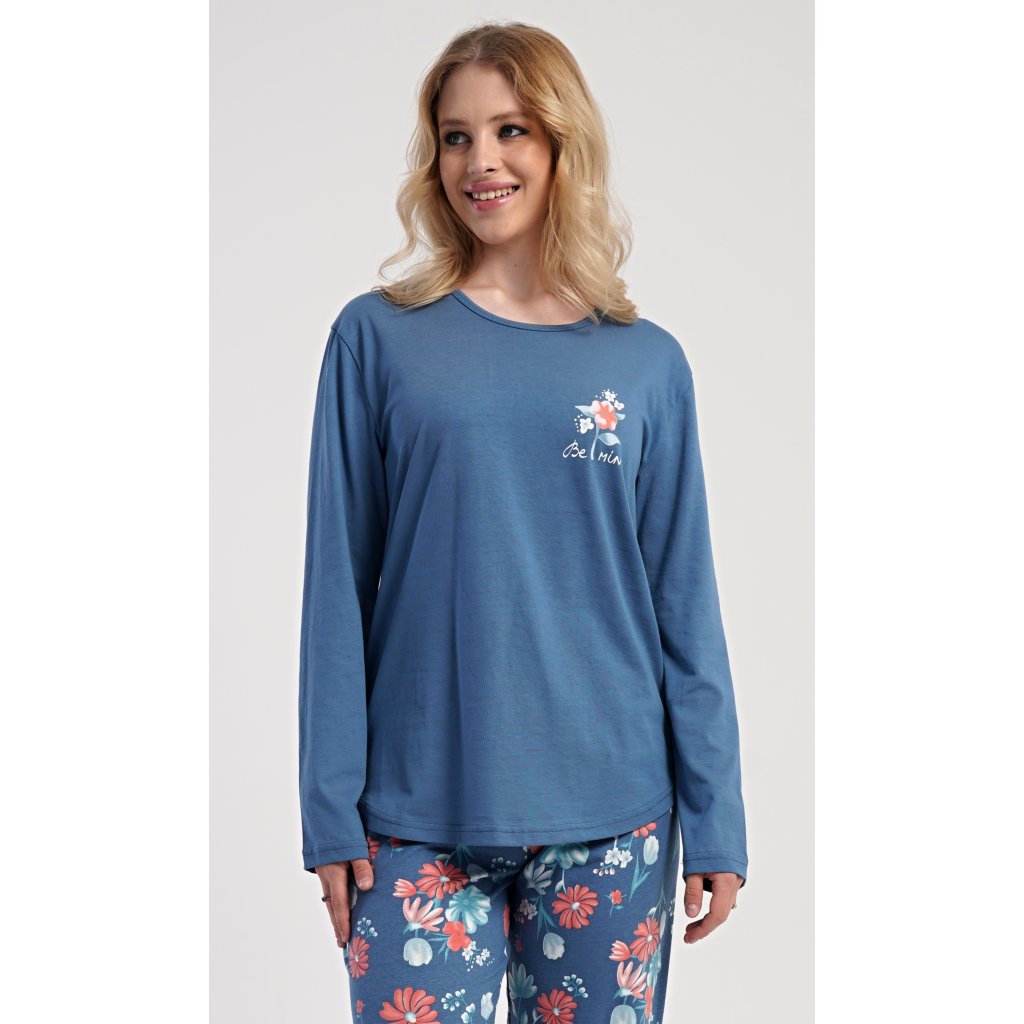 Dámské bavlněné dlouhé pyžamo Tracy. Dámské pyžamo se skládá z trika s dlouhým rukávem a dlouhých kalhot. Triko s kulatým výstřihem je na hrudi zdobeno obrázkem květu. Květinový motiv se opakuje i na kalhotách, které mají v pase gumu a šňůrku na stažení, nemají kapsy. Použitý bavlněný materiál je poddajný a příjemný na dotek.