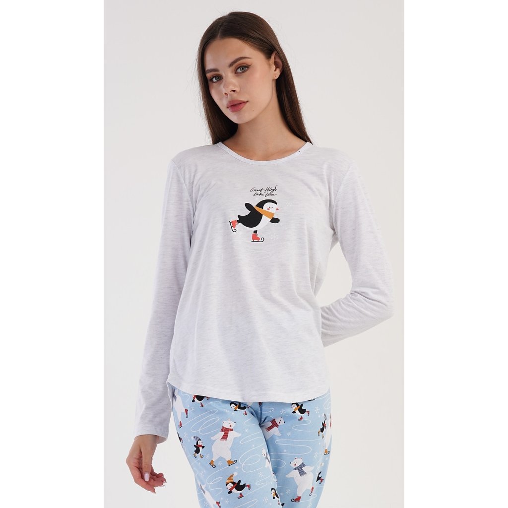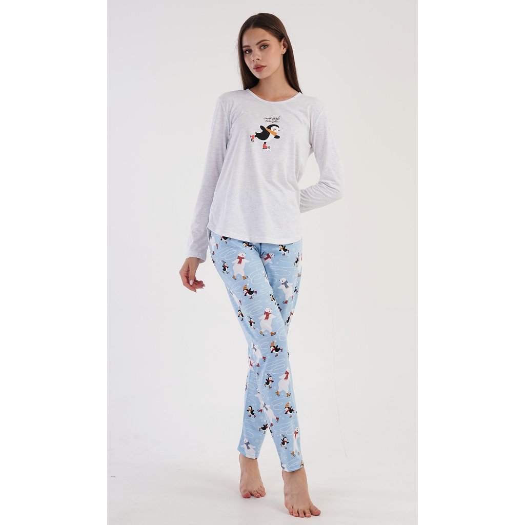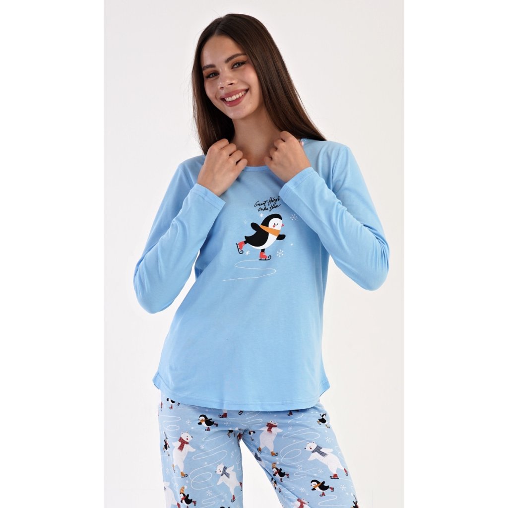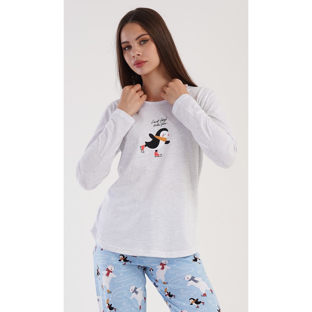Dámské pyžamo dlouhé Tučňák na ledě. Dámské pyžamo se skládá z trika s dlouhým rukávem a dlouhých kalhot. Triko je jednobarevné, zdobené drobným nápisem a obrázkem tučňáka. Kalhoty jsou světle modré, potištěné bruslícími tučňáky a medvědy. Kalhoty mají v pase gumu a šňůrku na stažení. Modré triko je složeno ze 100% bavlnou, šedé má obsah bavlny 70%. Kalhoty jsou čistě bavlněné. Použitý materiál je poddajný a jemný na dotek.