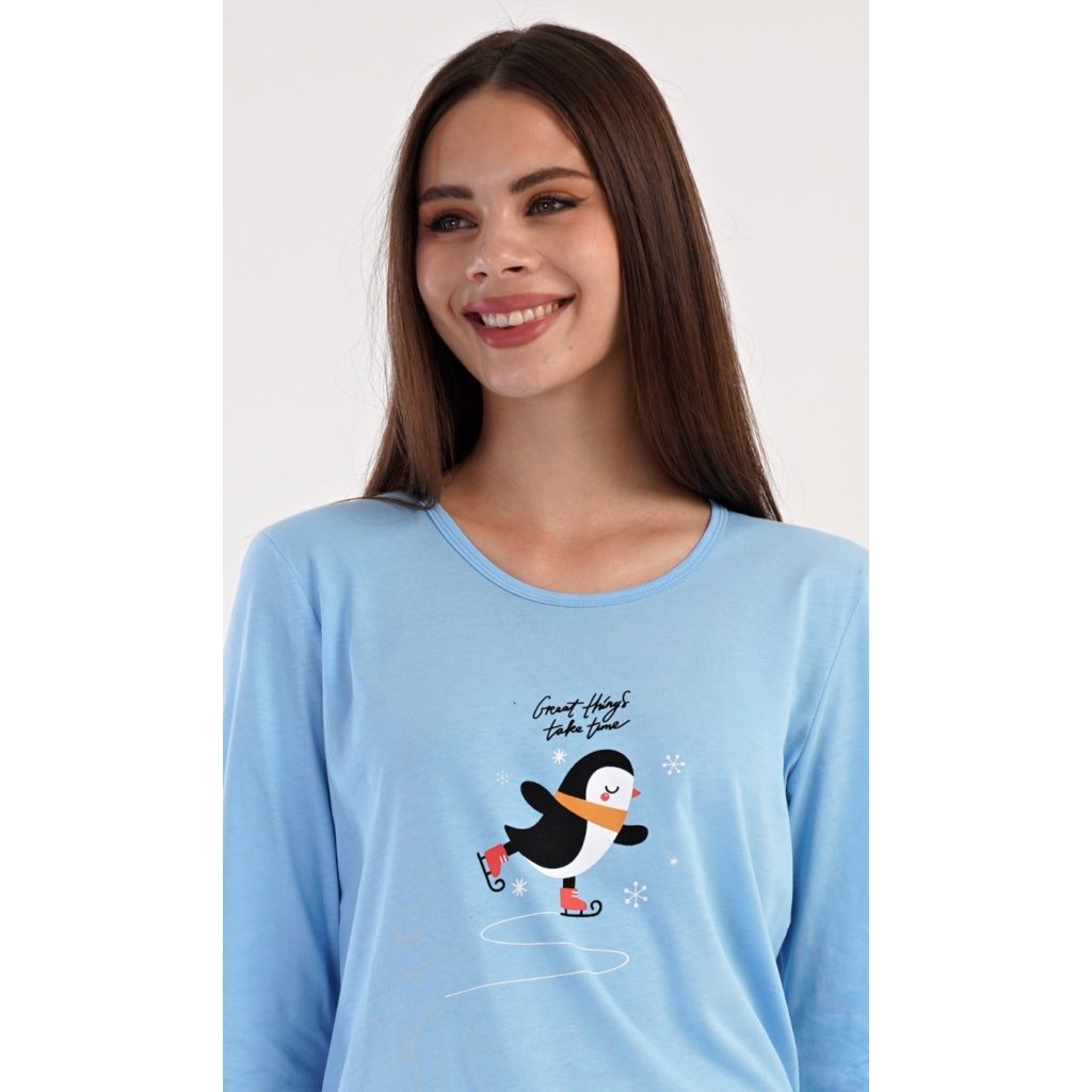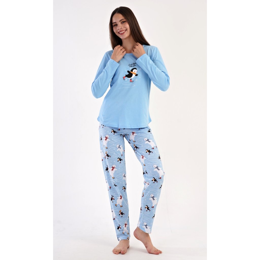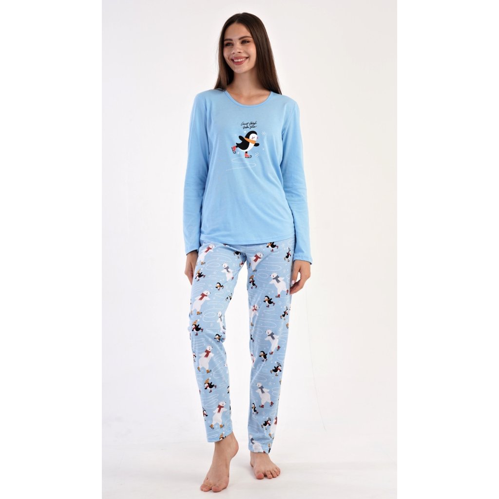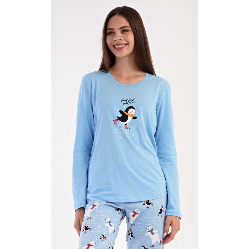 Dámské pyžamo dlouhé Tučňák na ledě. Dámské pyžamo se skládá z trika s dlouhým rukávem a dlouhých kalhot. Triko je jednobarevné, zdobené drobným nápisem a obrázkem tučňáka. Kalhoty jsou světle modré, potištěné bruslícími tučňáky a medvědy. Kalhoty mají v pase gumu a šňůrku na stažení. Modré triko je složeno ze 100% bavlnou, šedé má obsah bavlny 70%. Kalhoty jsou čistě bavlněné. Použitý materiál je poddajný a jemný na dotek.
