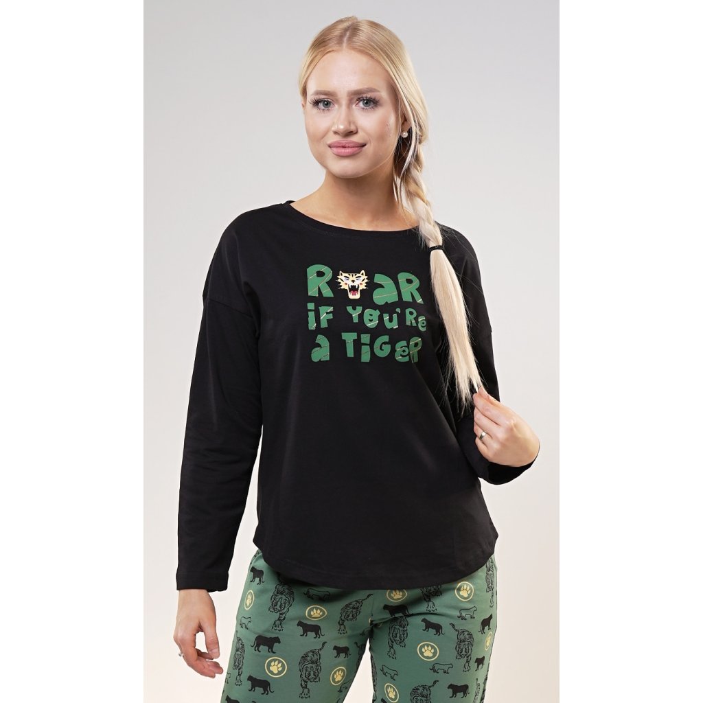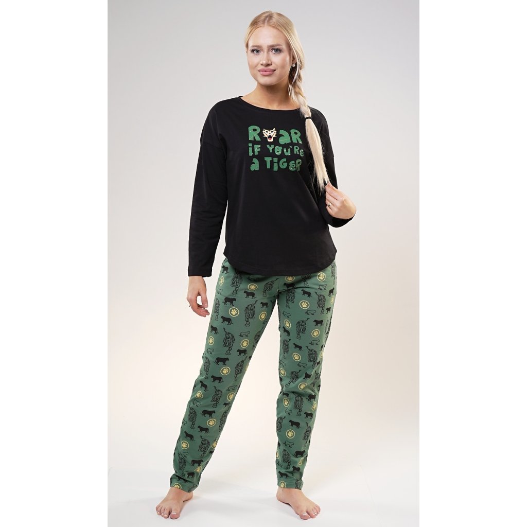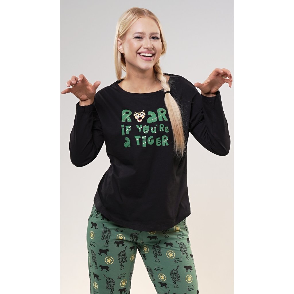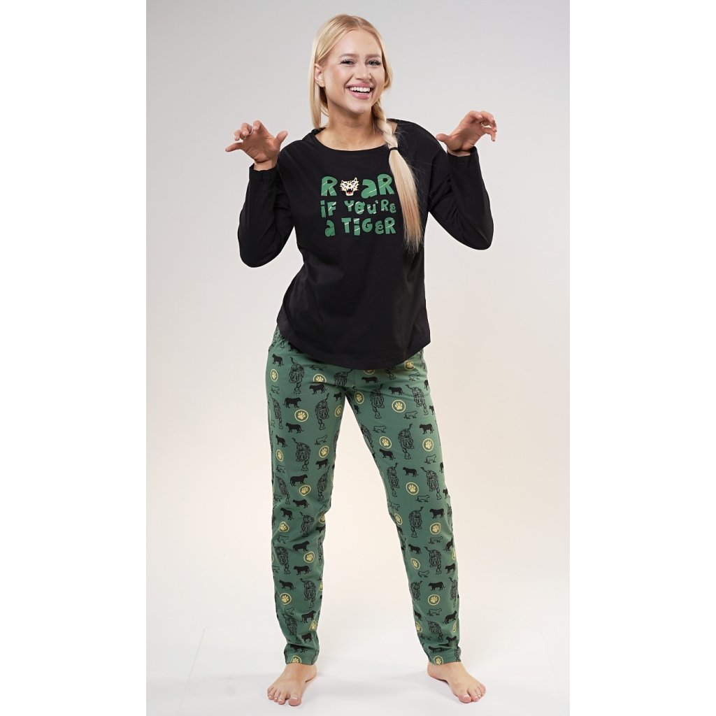 Dámské bavlněné pyžamo dlouhé Tygr. Dámské pyžamo se skládá z trika s dlouhým rukávem a dlouhých kalhot. Triko je jednobarevné, zdobené obrázkem tygra a nápisem. Tygří motiv se opakuje i na kalhotách, které mají v pase gumu, šňůrku na stáhnutí a praktické kapsy. Použitý bavlněný materiál je poddajný a příjemný na dotek.