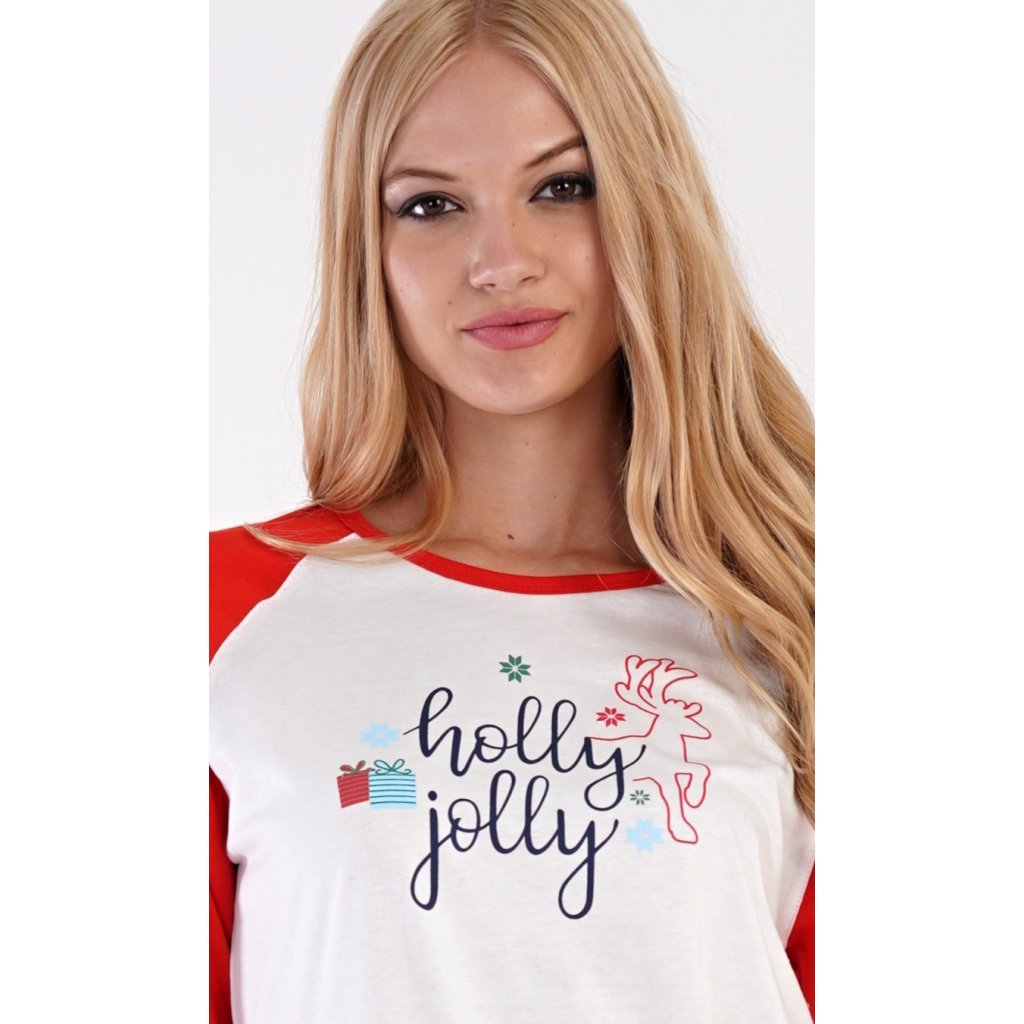 Dámské bavlněné pyžamo dlouhé Vánoční dárek. Dámské pyžamo se skládá z trika s dlouhým rukávem a dlouhých kalhot. Triko je ozdobené nápisem HOLLY JOLLY a obrázky vánočních dárků. Kalhoty jsou potištěné vánočními motivy. Kalhoty mají v pase gumu, šňůrku na stažení a jsou zakončené lemy. Použitý materiál je poddajný a jemný na dotek. Kalhoty i triko je složeno ze 100% bavlnou.