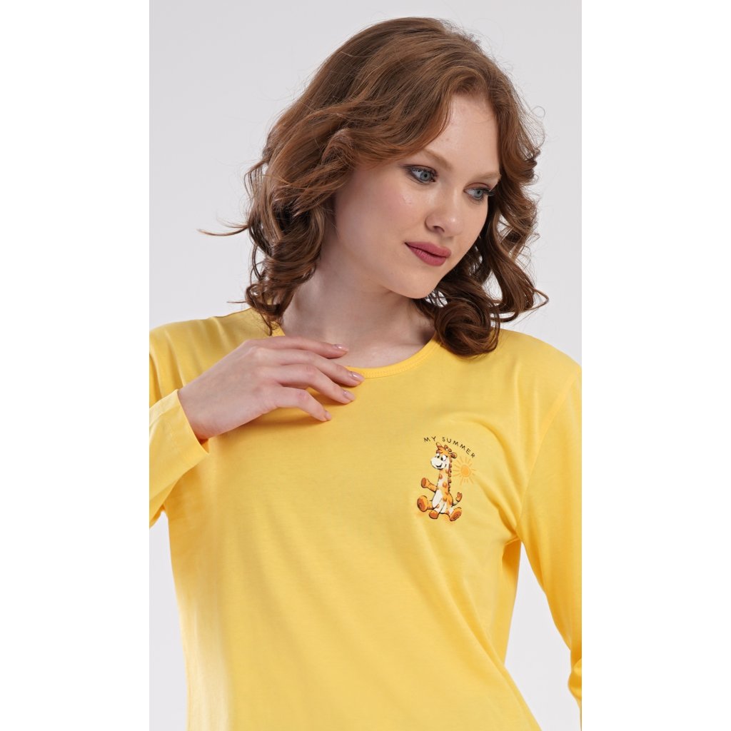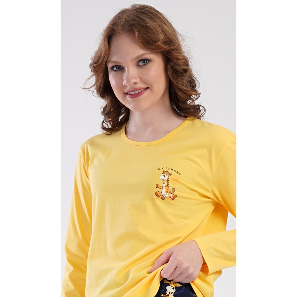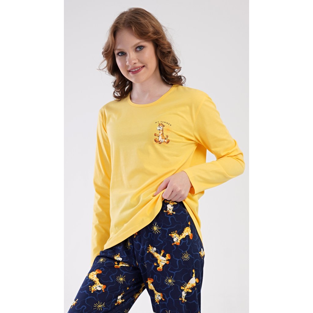 Dámské bavlněné dlouhé pyžamo Žirafy. Dámské pyžamo se skládá z trika s dlouhým rukávem a dlouhých kalhot. Triko je jednobarevné, zdobené obrázkem malé žirafy a nápisem MY SUMMER. Obrázky žiraf se opakují i na kalhotách, které mají v pase gumu a šňůrku na stažení, nemají kapsy. Použitý bavlněný materiál je poddajný a příjemný na dotek.