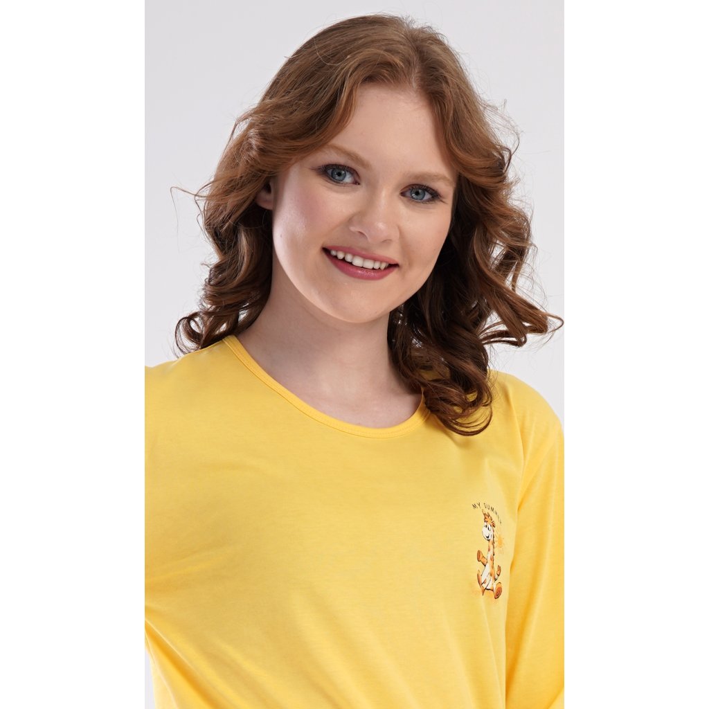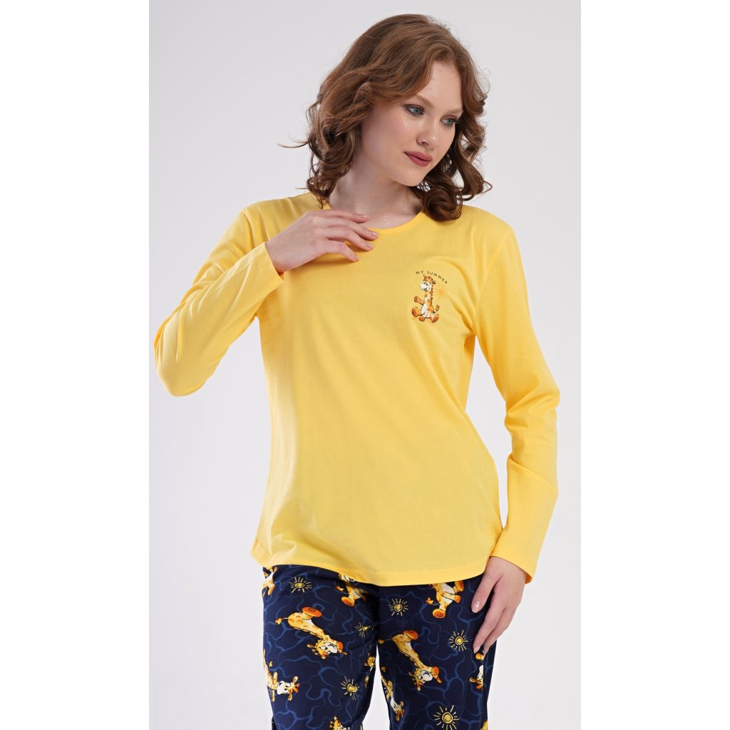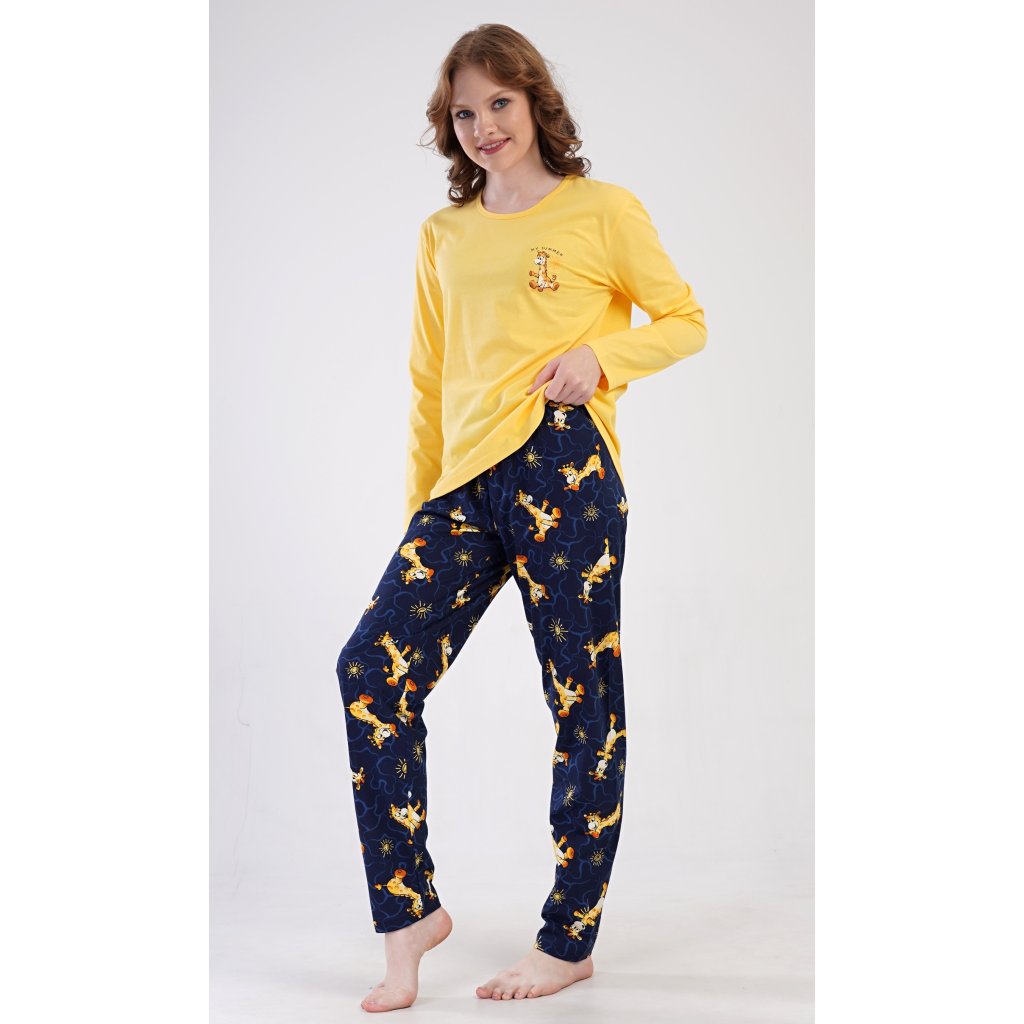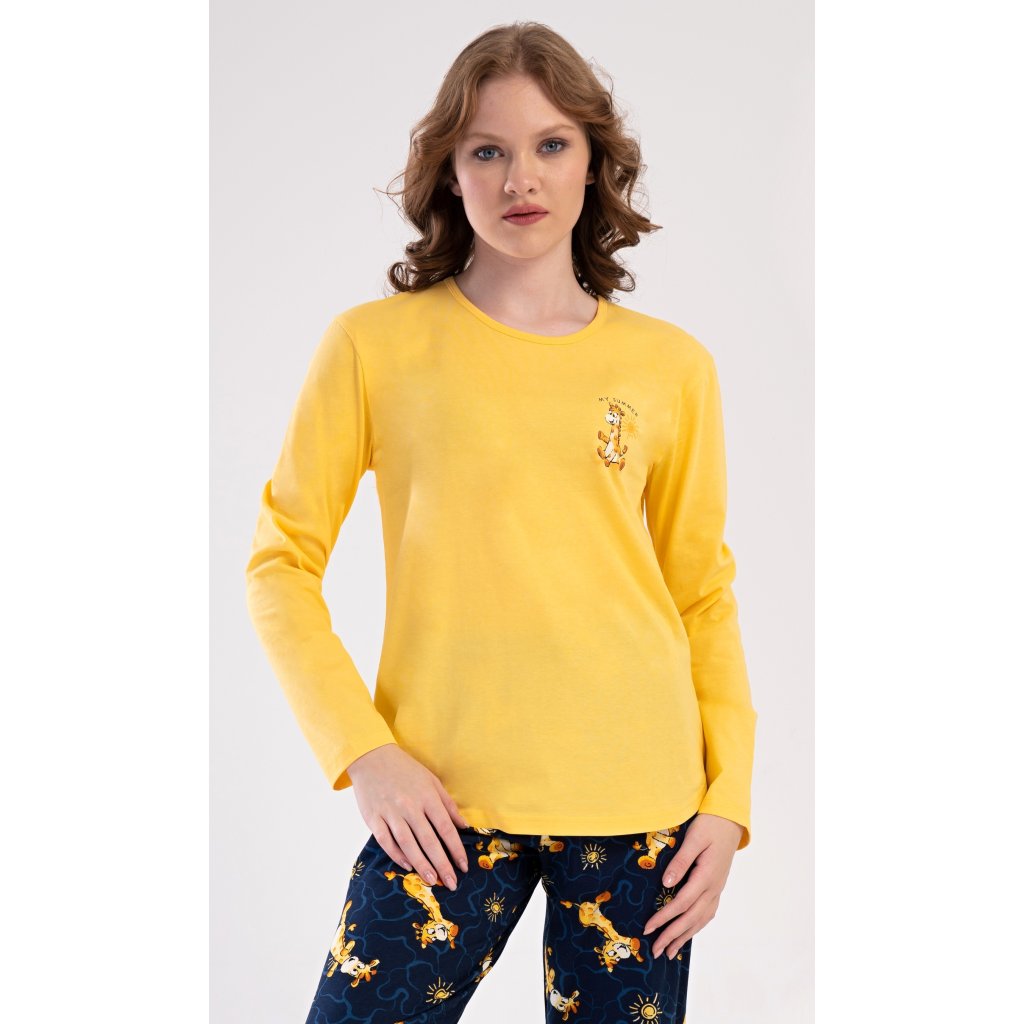 Dámské bavlněné dlouhé pyžamo Žirafy. Dámské pyžamo se skládá z trika s dlouhým rukávem a dlouhých kalhot. Triko je jednobarevné, zdobené obrázkem malé žirafy a nápisem MY SUMMER. Obrázky žiraf se opakují i na kalhotách, které mají v pase gumu a šňůrku na stažení, nemají kapsy. Použitý bavlněný materiál je poddajný a příjemný na dotek.