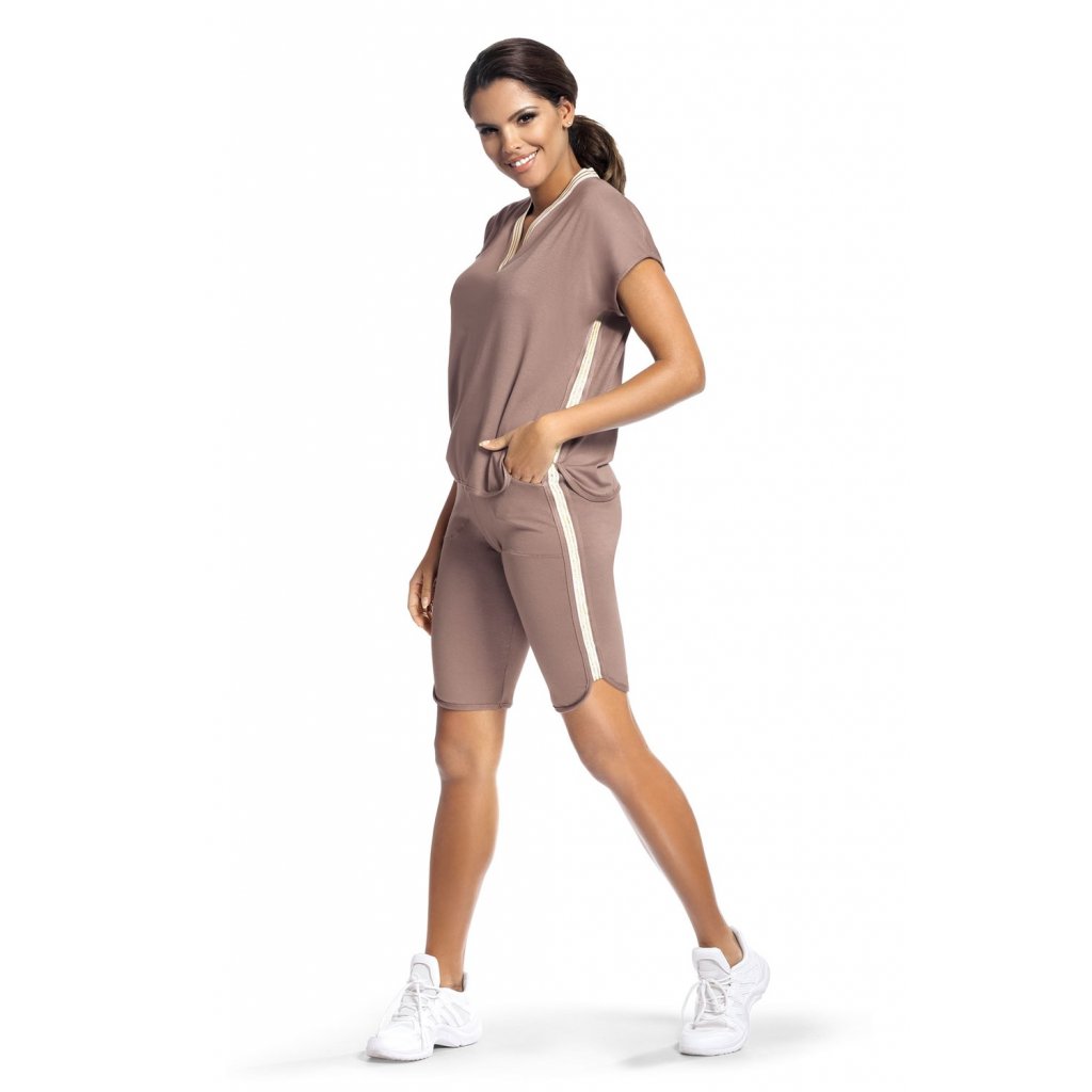 Pohodlné dámské pyžamo Hamana Argo Komplet v hnědé barvě je vyrobeno z hebkého a elastického materiálu, který je velmi příjemný na těle. Vrchní část je s krátkými rukávy má dekolt zdobený bílou gumkou se zlatou aplikací. Kalhoty mají tutéž aplikaci na boku.Materiálové složení: 94% viskóza, 6% elastan.
