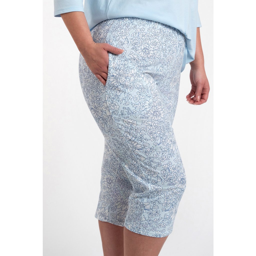 Stylové pyžamo Salli. - jednotná halenka s krátkým rukávem - kulatý výstřih s ozdobnou mašličkou - ¾ kalhoty se vzorem - kapsy na bocích - pohodlná elastická guma v pase - příjemná na dotek pletenina Složení: 90% viskóza, 10% elastan.