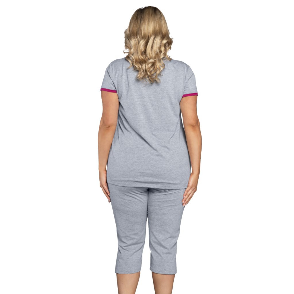 Pohodlné dámské pyžamo Tabata klasického střihu je ušité z příjemné bavlny. Tričko s barevným potiskem má kulatý výstřih a krátké rukávy. Výstřih i rukávy jsou zakončené kontrastním lemem. 3/4 kalhoty mají v pase pohodlnou gumu a na bocích kapsy.Složení: 100% bavlna.Doplňkové parametry