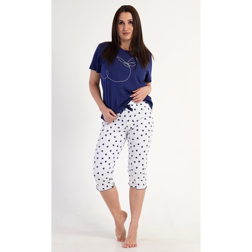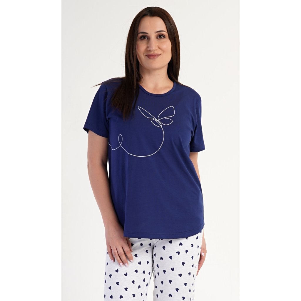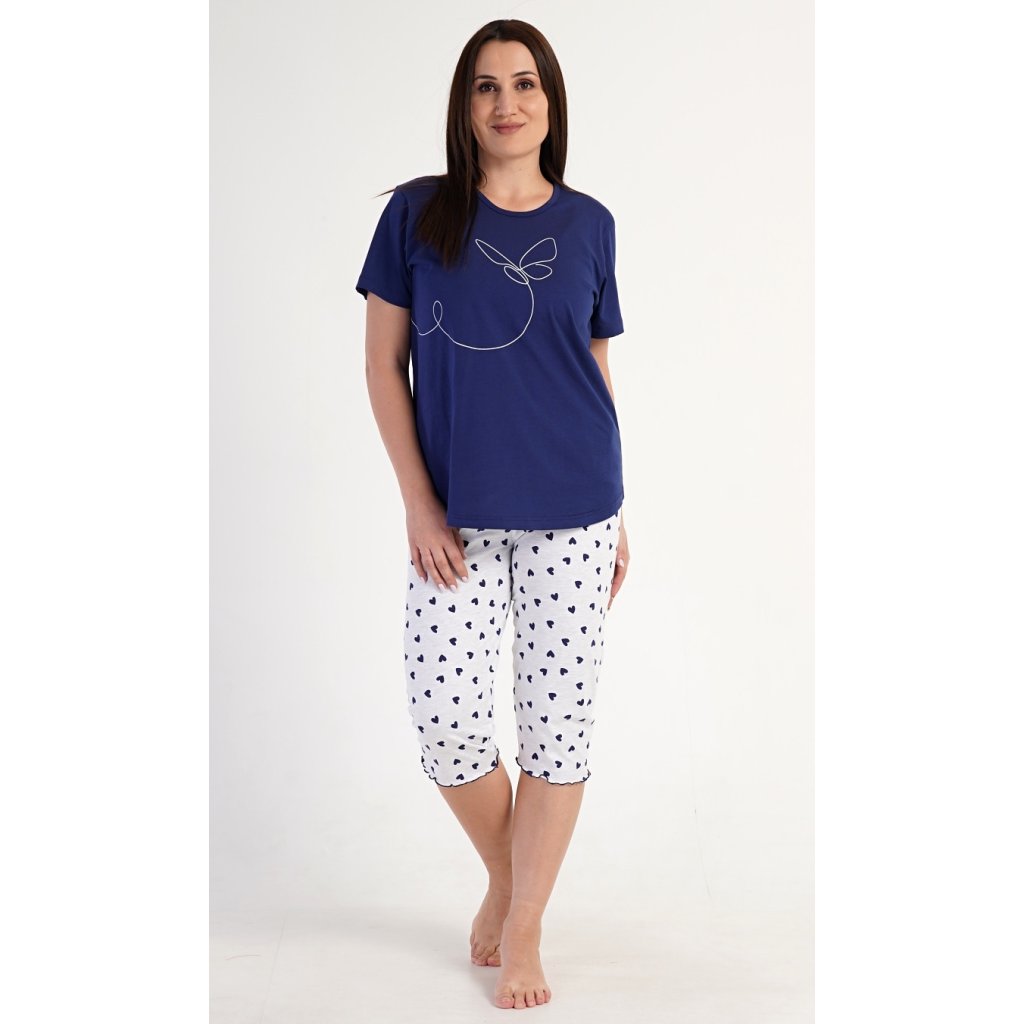Dámské kapri pyžamo Butterfly. Dámské pyžamo se skládá z trička s krátkým rukávem a tříčtvrtečních kalhot. Jednobarevné tričko s kulatým výstřihem má na hrudi konturu motýla. Tříčtvrteční kalhoty s potiskem srdíček mají v pase gumu na stažení a jsou bez kapes. Použitý materiál je příjemný a poddajný na dotek. Obsah bavlny u kalhot je 70% a u trička 100%.