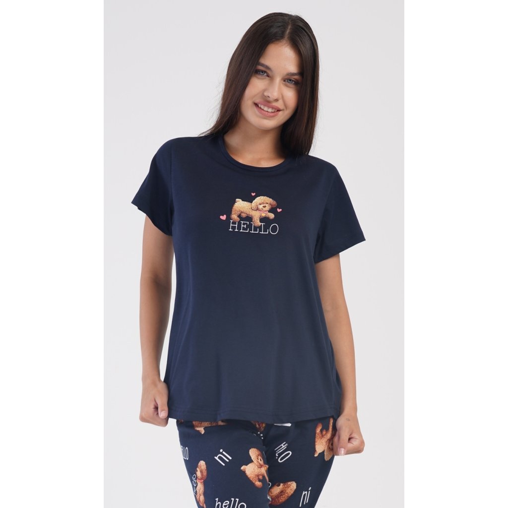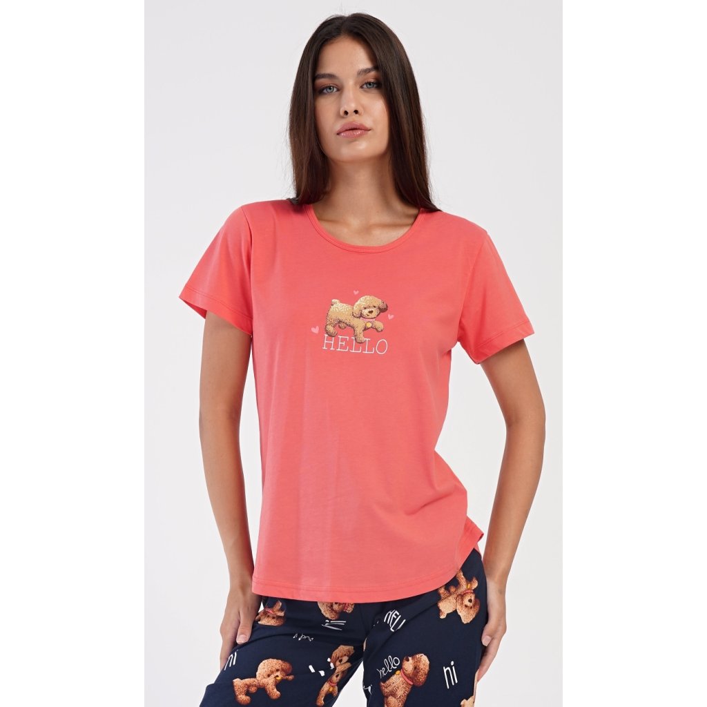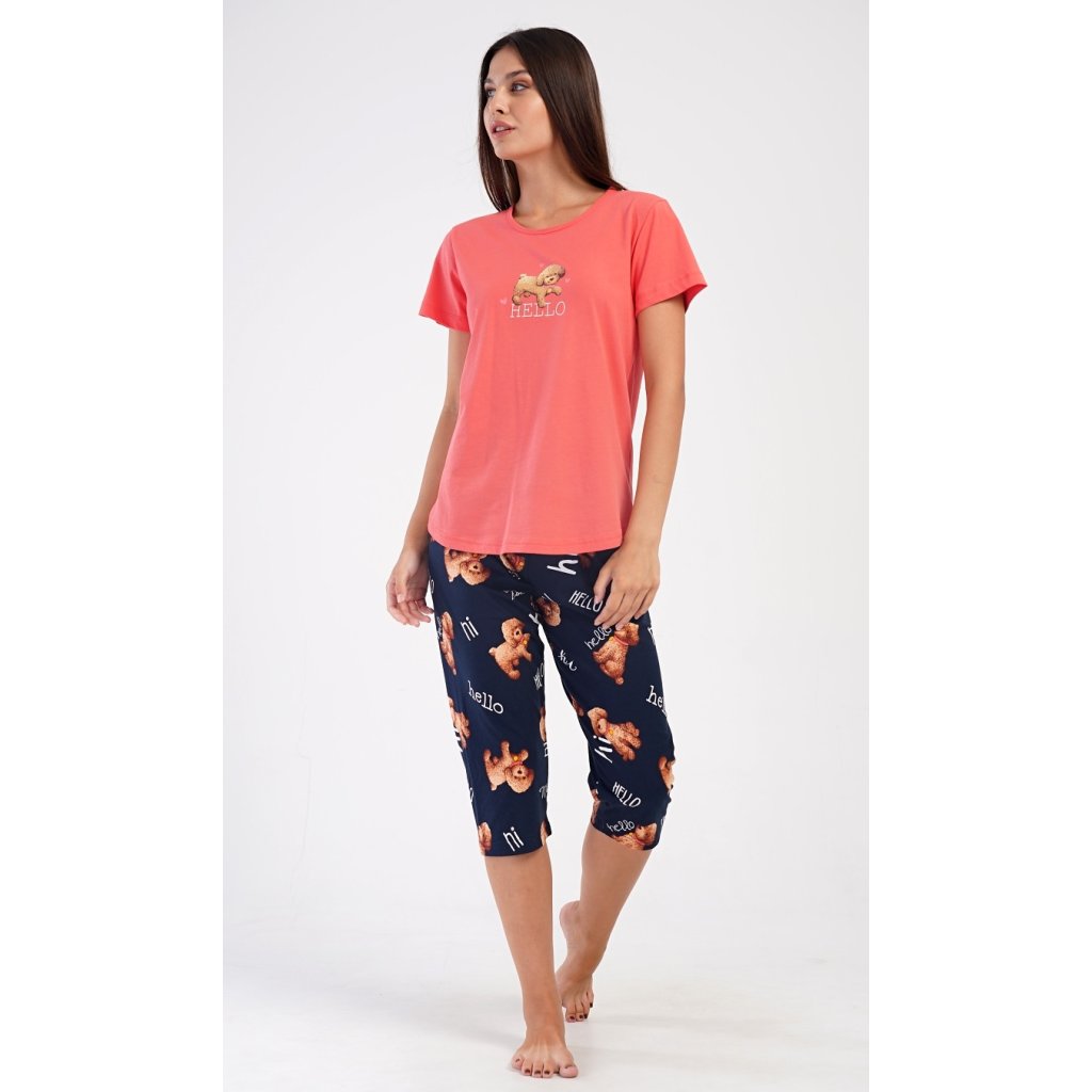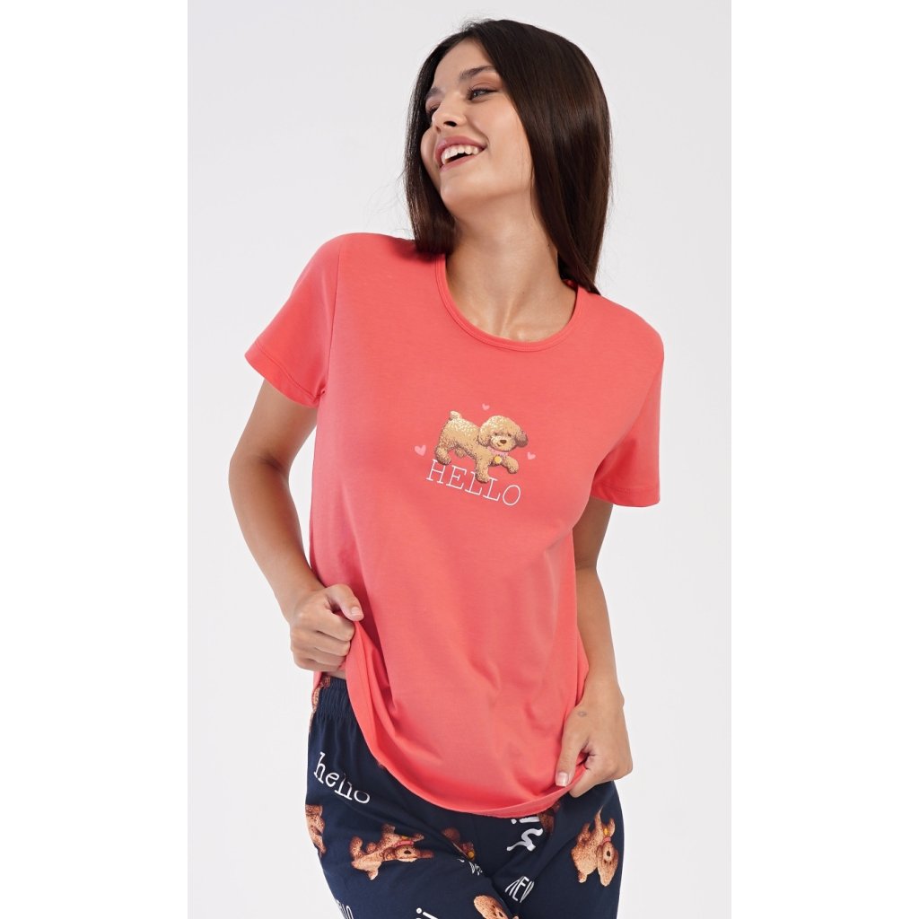 Dámské bavlněné kapri pyžamo Dominika. Dámské pyžamo se skládá z trička s krátkým rukávem a tříčtvrtečních kalhot. Tričko s kulatým výstřihem má na hrudi obrázek pejska a nápis HELLO. Tento motiv se opakuje i na kalhotách, které mají v pase gumu a šňůrku na stažení, jsou bez kapes. Použitý bavlněný materiál je příjemný a poddajný na dotek.