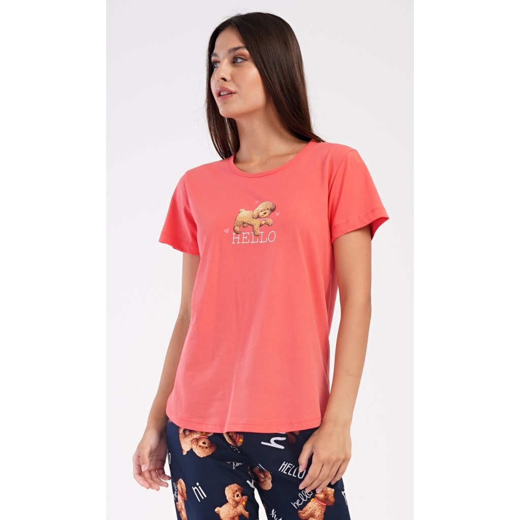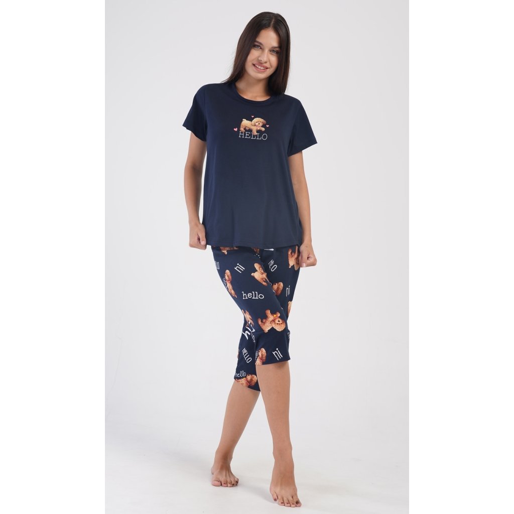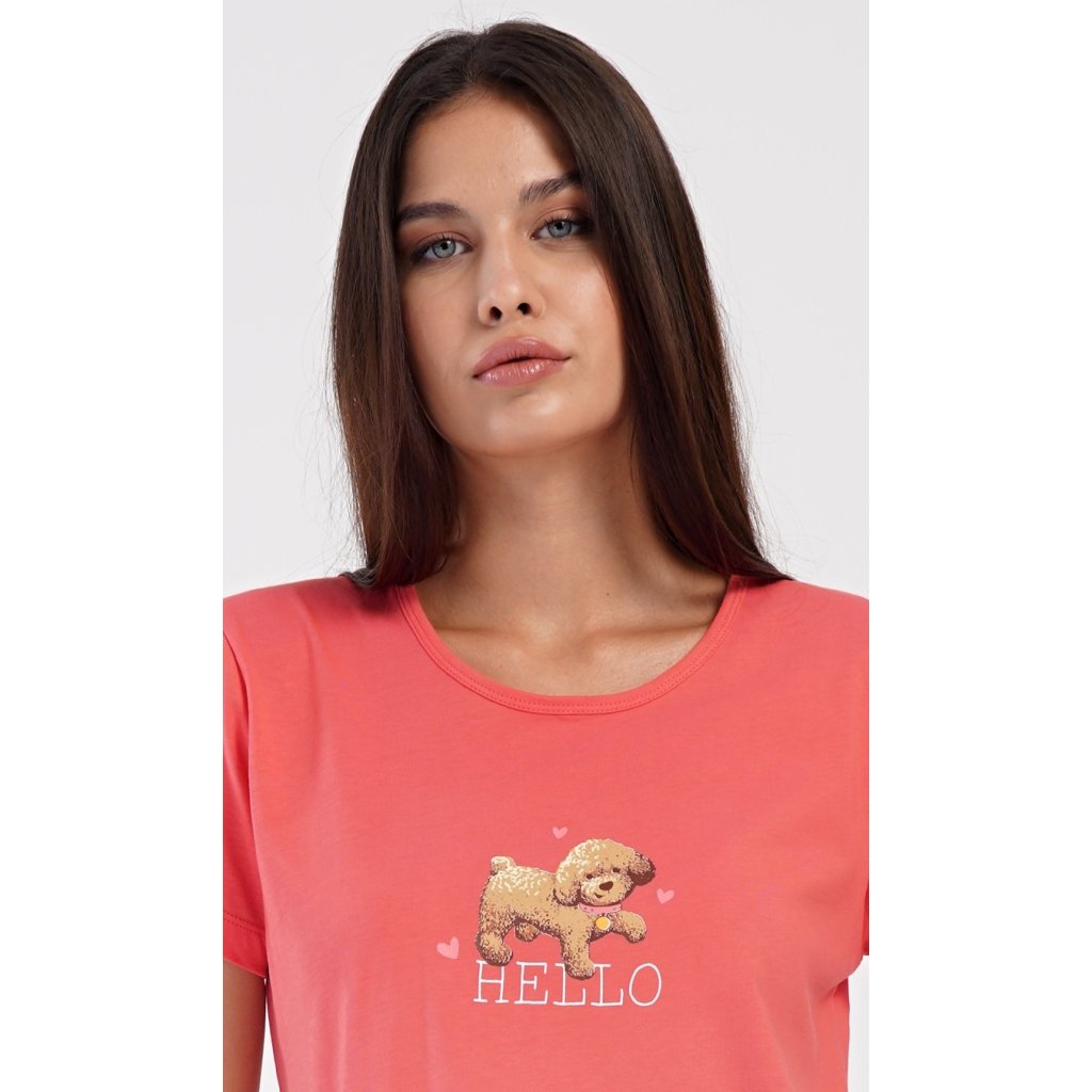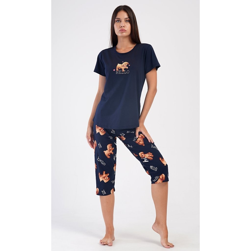 Dámské bavlněné kapri pyžamo Dominika. Dámské pyžamo se skládá z trička s krátkým rukávem a tříčtvrtečních kalhot. Tričko s kulatým výstřihem má na hrudi obrázek pejska a nápis HELLO. Tento motiv se opakuje i na kalhotách, které mají v pase gumu a šňůrku na stažení, jsou bez kapes. Použitý bavlněný materiál je příjemný a poddajný na dotek.