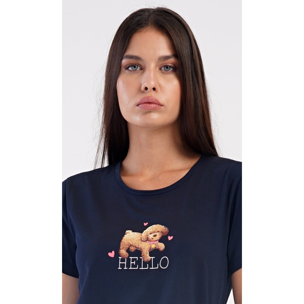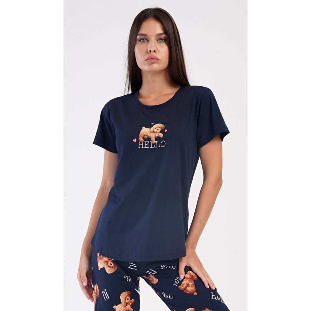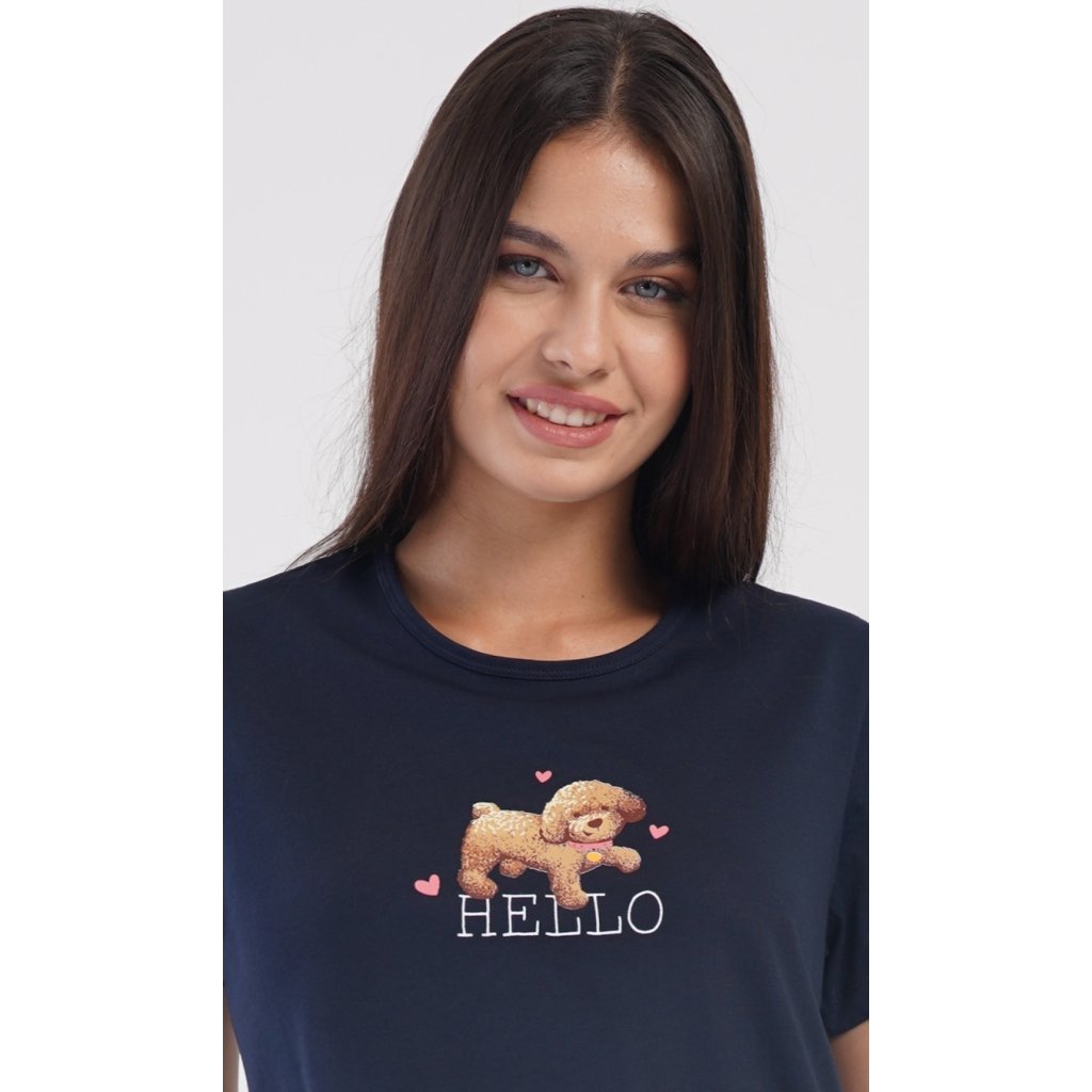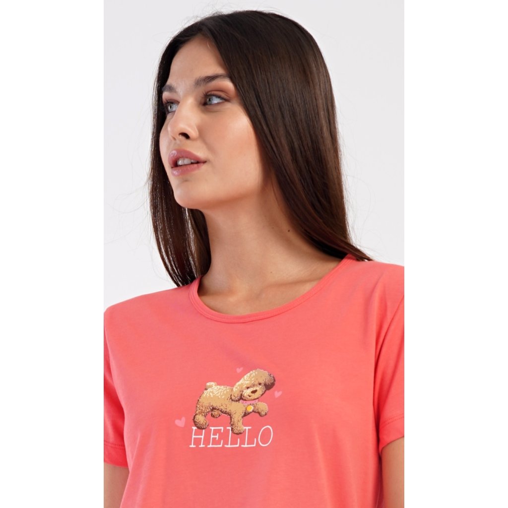 Dámské bavlněné kapri pyžamo Dominika. Dámské pyžamo se skládá z trička s krátkým rukávem a tříčtvrtečních kalhot. Tričko s kulatým výstřihem má na hrudi obrázek pejska a nápis HELLO. Tento motiv se opakuje i na kalhotách, které mají v pase gumu a šňůrku na stažení, jsou bez kapes. Použitý bavlněný materiál je příjemný a poddajný na dotek.