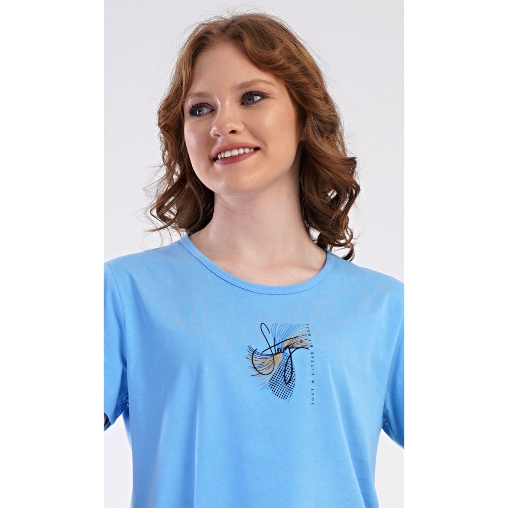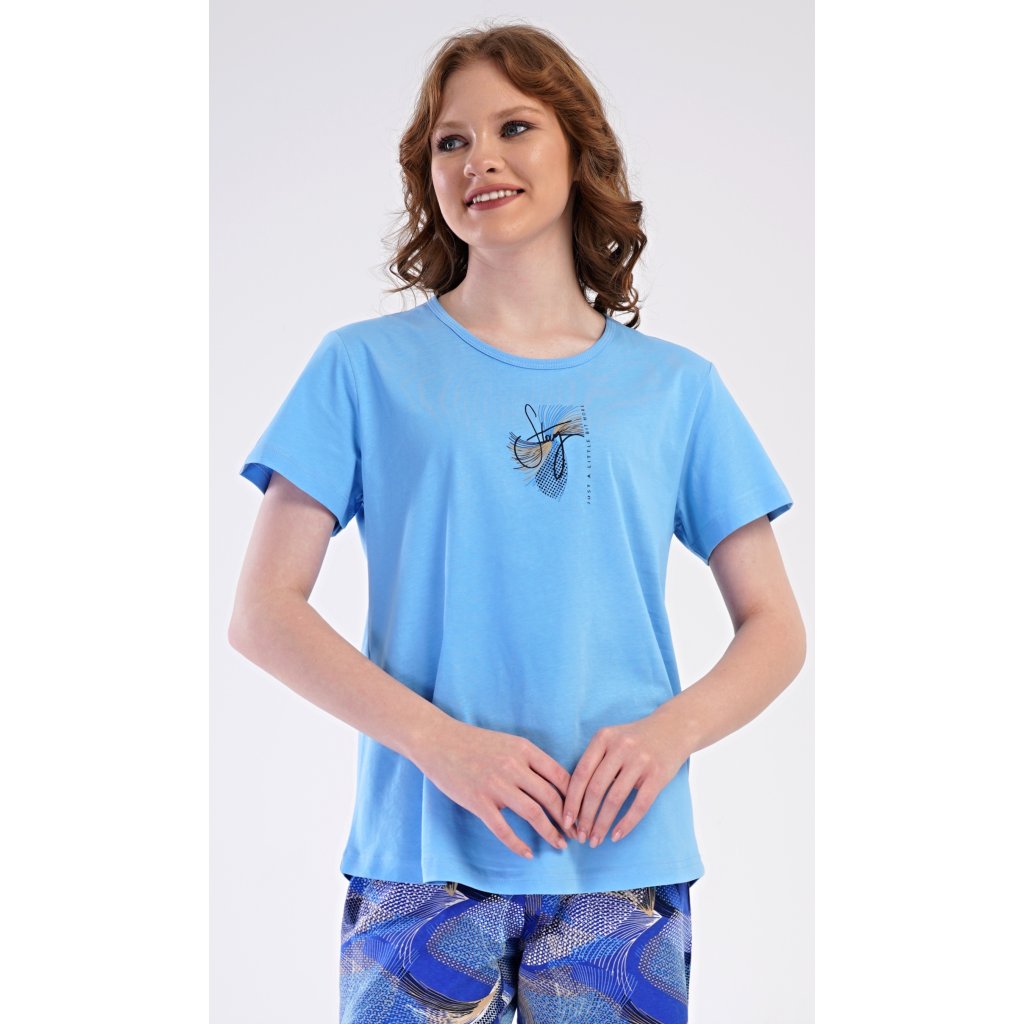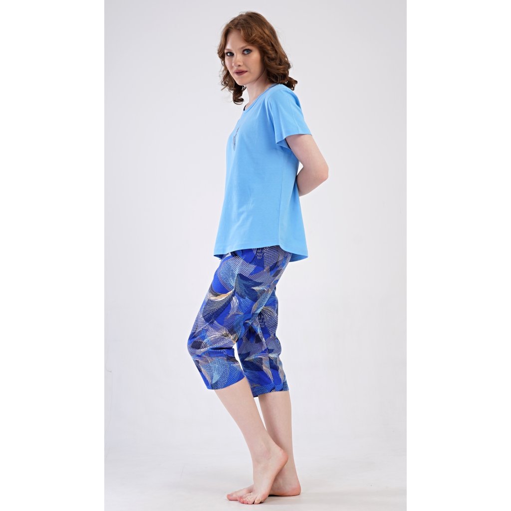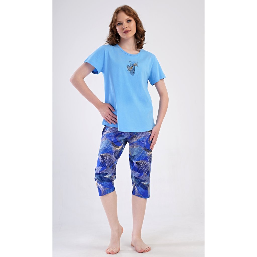 Dámské bavlněné kapri pyžamo Eliza. Dámské pyžamo se skládá z trička s krátkým rukávem a tříčtvrtečních kalhot. Tričko s kulatým výstřihem má na hrudi obrázek s geometrickým vzorem. Tento motiv se opakuje i na kalhotách, které mají v pase gumu a šňůrku na stažení, jsou bez kapes. Použitý bavlněný materiál je příjemný a poddajný na dotek.