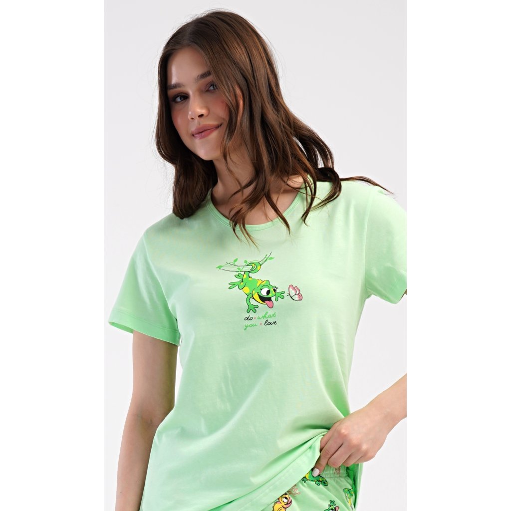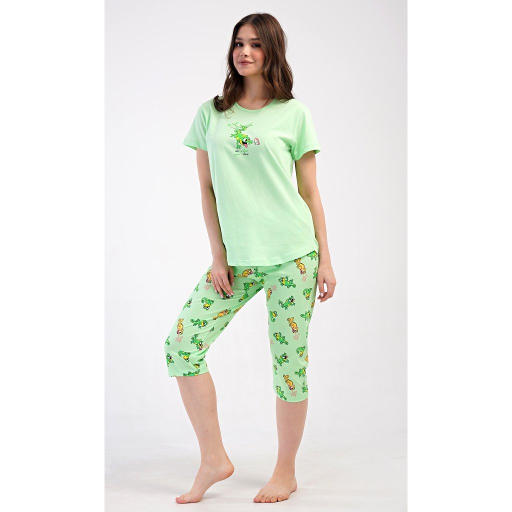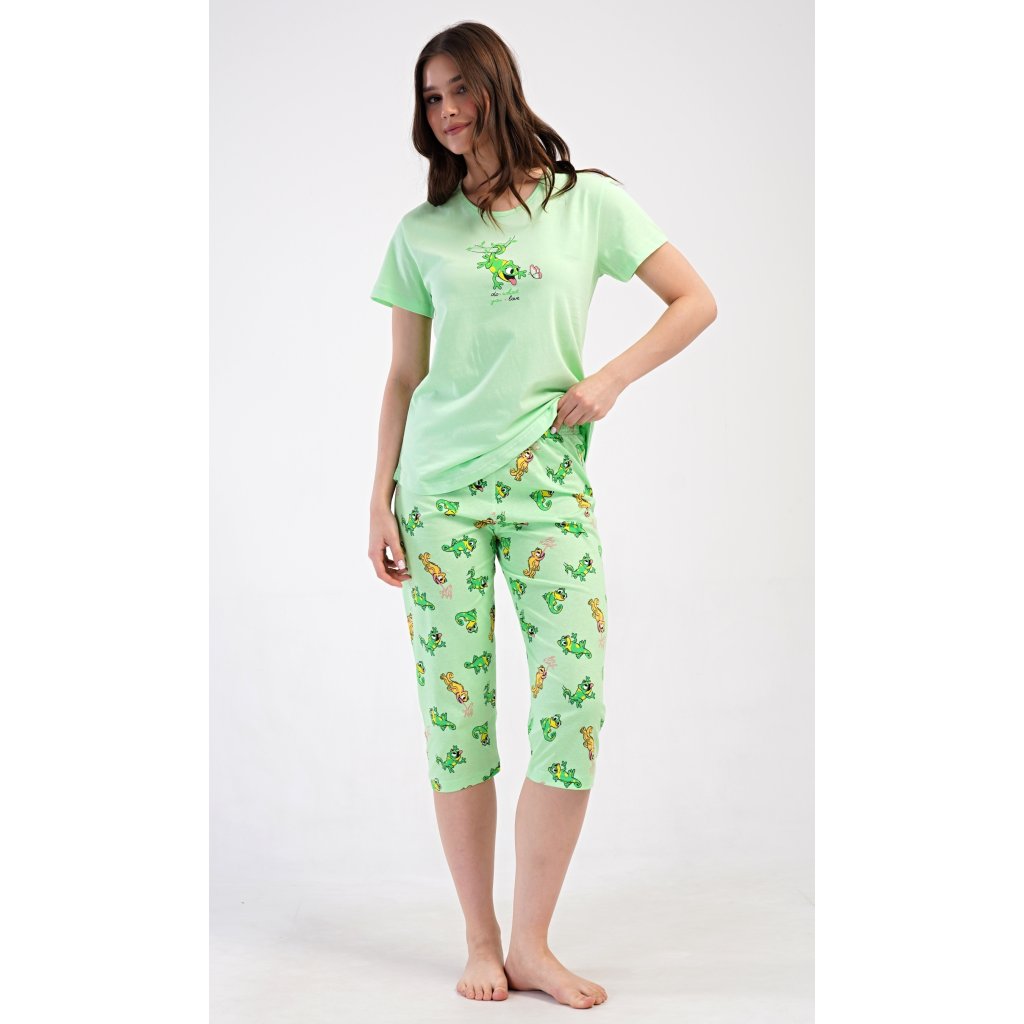 Dámské bavlněné kapri pyžamo Ella. Dámské pyžamo se skládá z trička s krátkým rukávem a tříčtvrtečních kalhot. Tričko s kulatým výstřihem zdobí obrázek veselé ještěrky. Tento motiv se opakuje i na kalhotách, které mají v pase gumu a šňůrku na stažení, jsou bez kapes. Použitý bavlněný materiál je příjemný a poddajný na dotek.