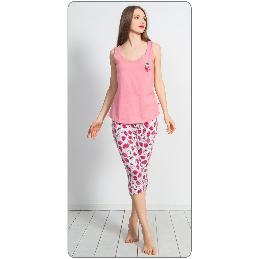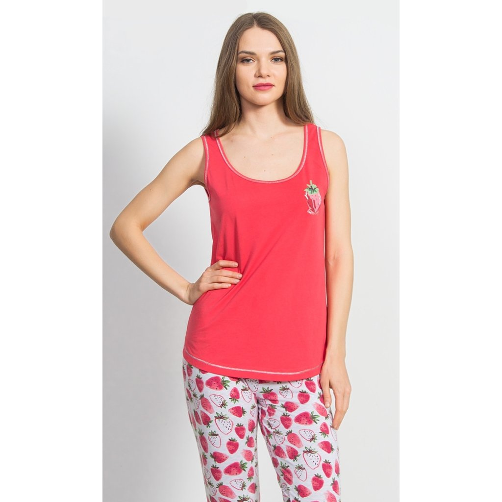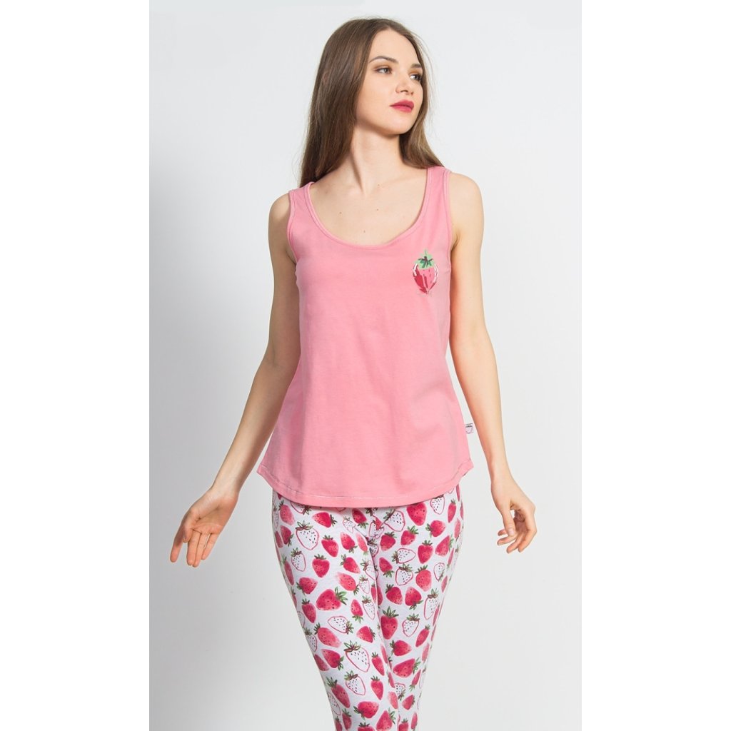 Dámské kapri pyžamo Jahoda. Pyžamo se skládá z tílka se širokými ramínky a tříčtvrtečních elastických kalhot. Na tílku je hezký malý obrázek červené jahody, stejný obrázek se opakuje i na elastických kalhotách. Použitý materiál je příjemný a poddajný na dotek. Obsah bavlny u kalhot je 50% bavlna, 45% polyester a 50% elasten, u trička 100% bavlna.