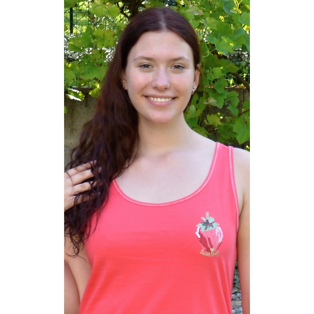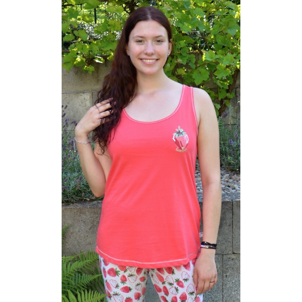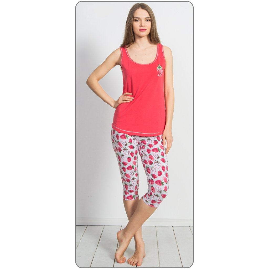 Dámské kapri pyžamo Jahoda. Pyžamo se skládá z tílka se širokými ramínky a tříčtvrtečních elastických kalhot. Na tílku je hezký malý obrázek červené jahody, stejný obrázek se opakuje i na elastických kalhotách. Použitý materiál je příjemný a poddajný na dotek. Obsah bavlny u kalhot je 50% bavlna, 45% polyester a 50% elasten, u trička 100% bavlna.