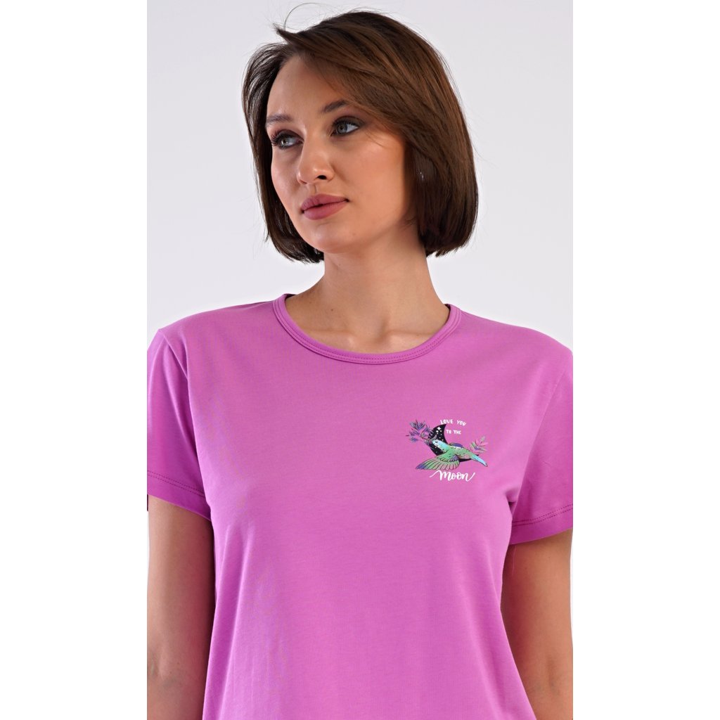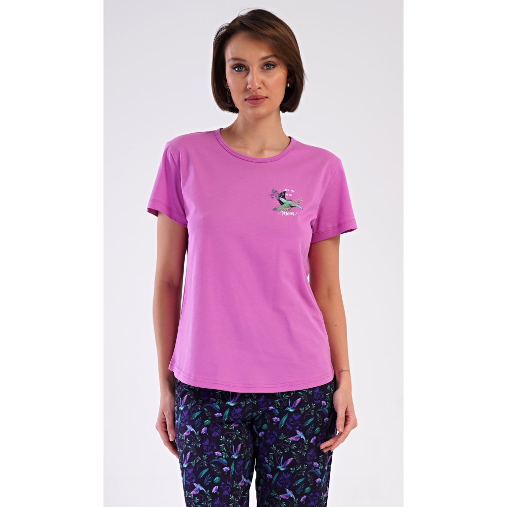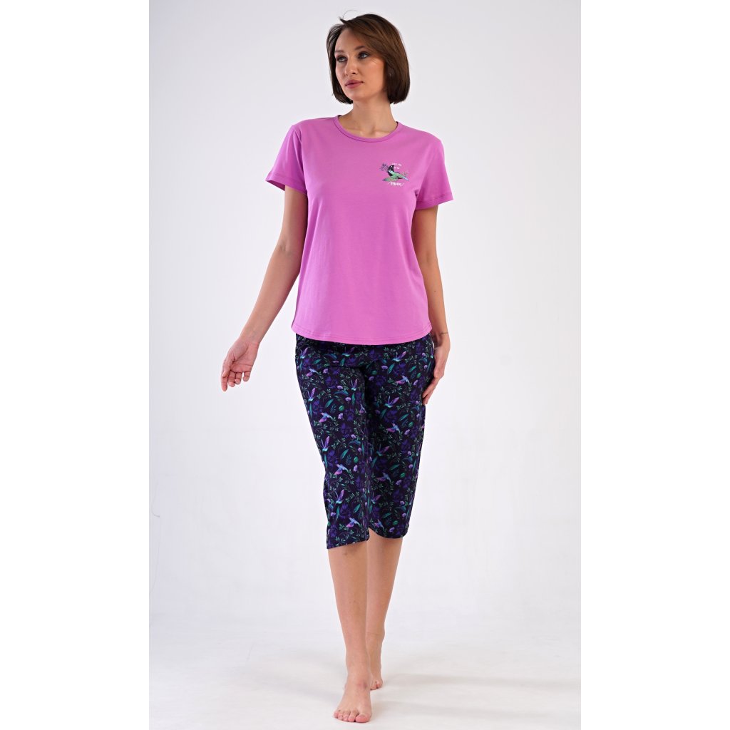 Dámské bavlněné kapri pyžamo Kolibřík. Dámské pyžamo se skládá z trička s krátkým rukávem a tříčtvrtečních kalhot. Tričko s kulatým výstřihem má na hrudi malý obrázek kolibříka. Motiv kolibříků se spolu s květy opakuje i na kalhotách, které mají v pase gumu a šňůrku na stažení, jsou bez kapes. Použitý bavlněný materiál je příjemný a poddajný na dotek.