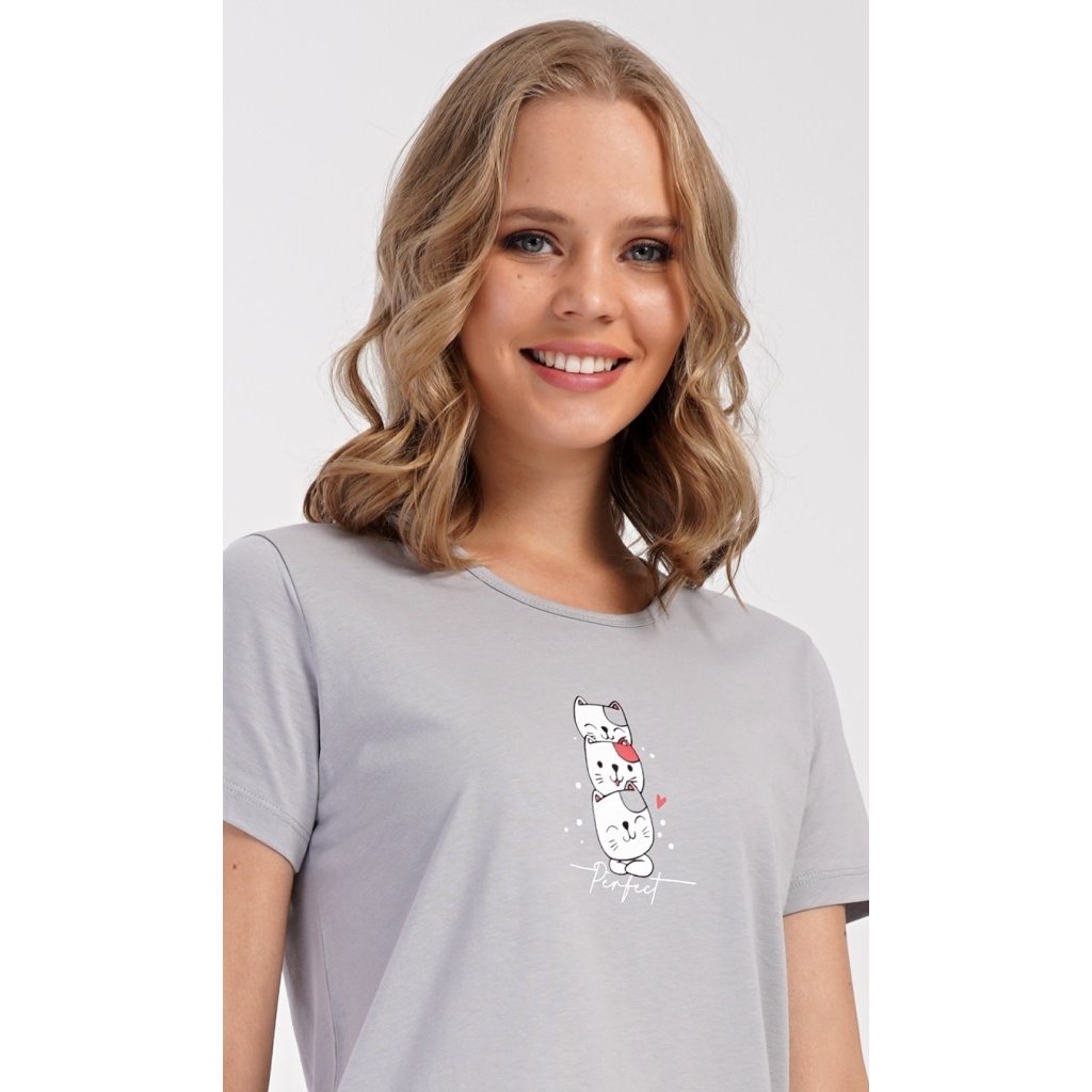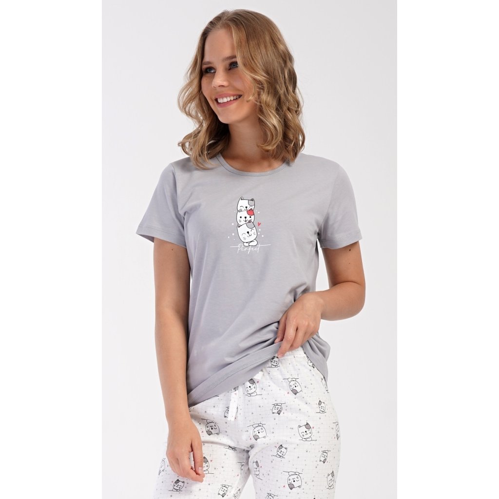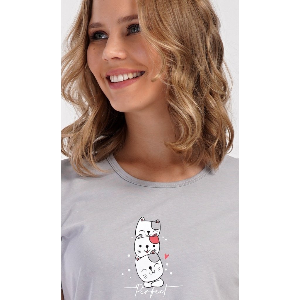 Dámské bavlněné kapri pyžamo Koťata. Dámské pyžamo se skládá z trička s krátkým rukávem a tříčtvrtečních kalhot. Tričko s kulatým výstřihem má na hrudi obrázek tří koťat a nápis 'Perfect'. Kočičí motiv se opakuje i na kalhotách, které mají v pase gumu a šňůrku na stažení, jsou bez kapes. Použitý bavlněný materiál je příjemný a poddajný na dotek.