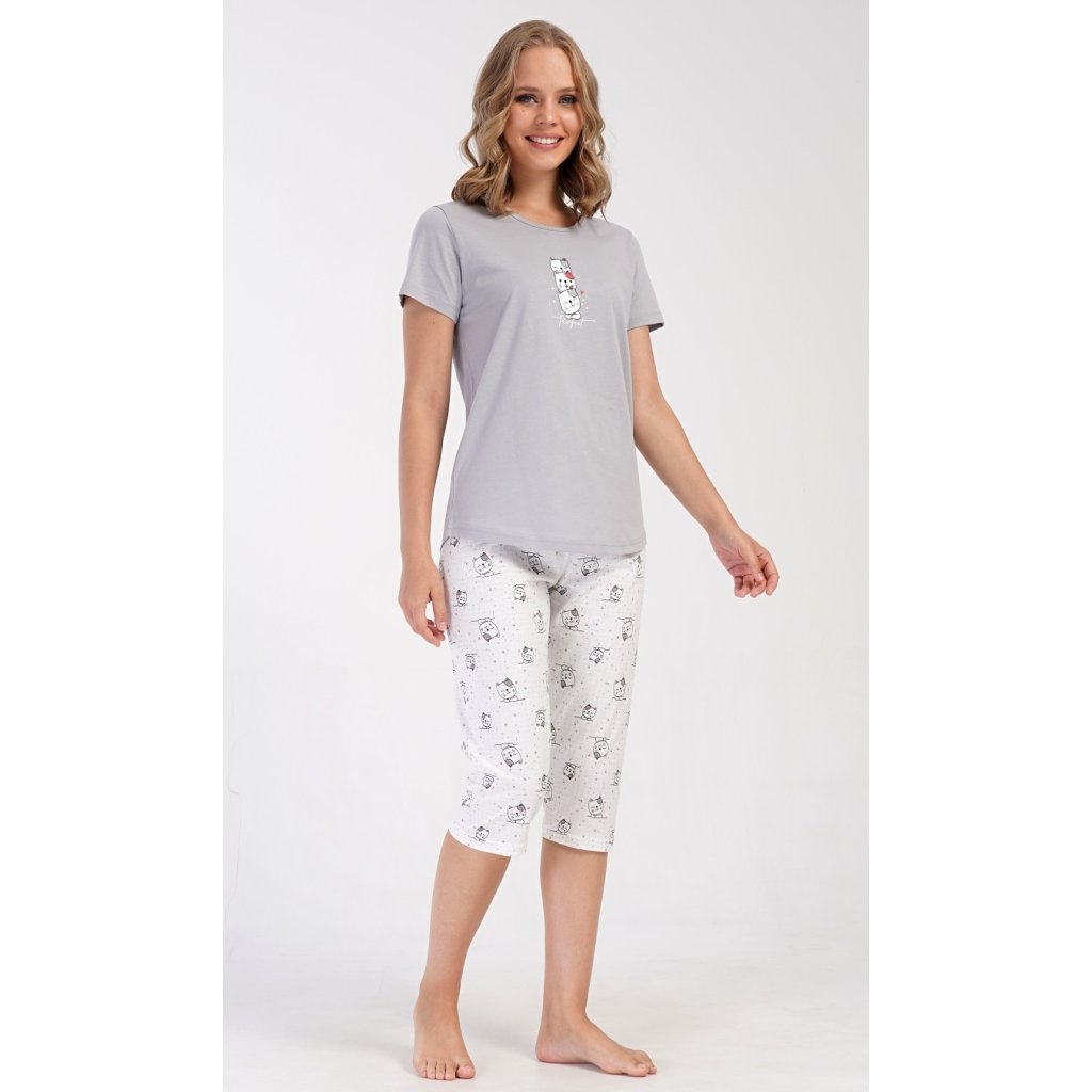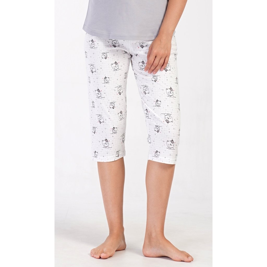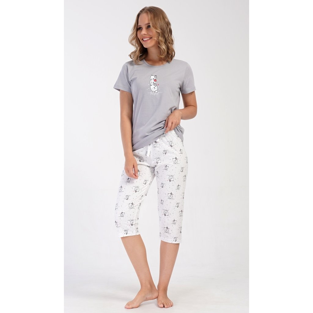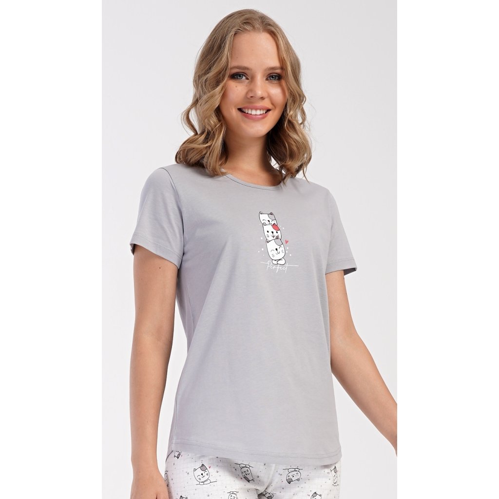 Dámské bavlněné kapri pyžamo Koťata. Dámské pyžamo se skládá z trička s krátkým rukávem a tříčtvrtečních kalhot. Tričko s kulatým výstřihem má na hrudi obrázek tří koťat a nápis 'Perfect'. Kočičí motiv se opakuje i na kalhotách, které mají v pase gumu a šňůrku na stažení, jsou bez kapes. Použitý bavlněný materiál je příjemný a poddajný na dotek.