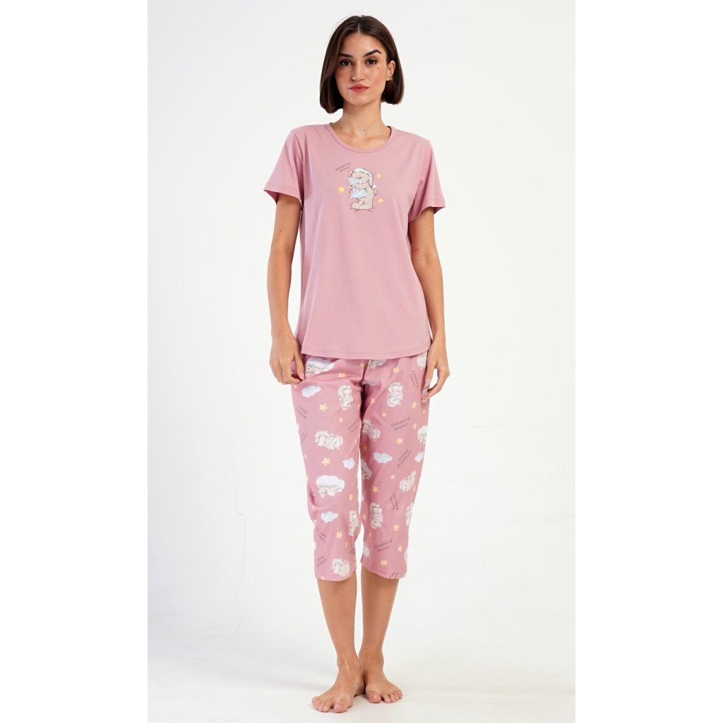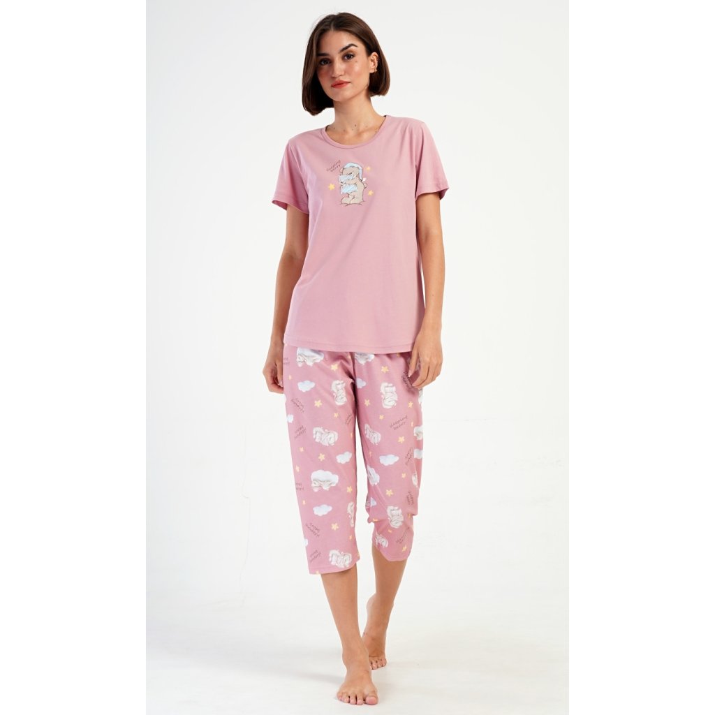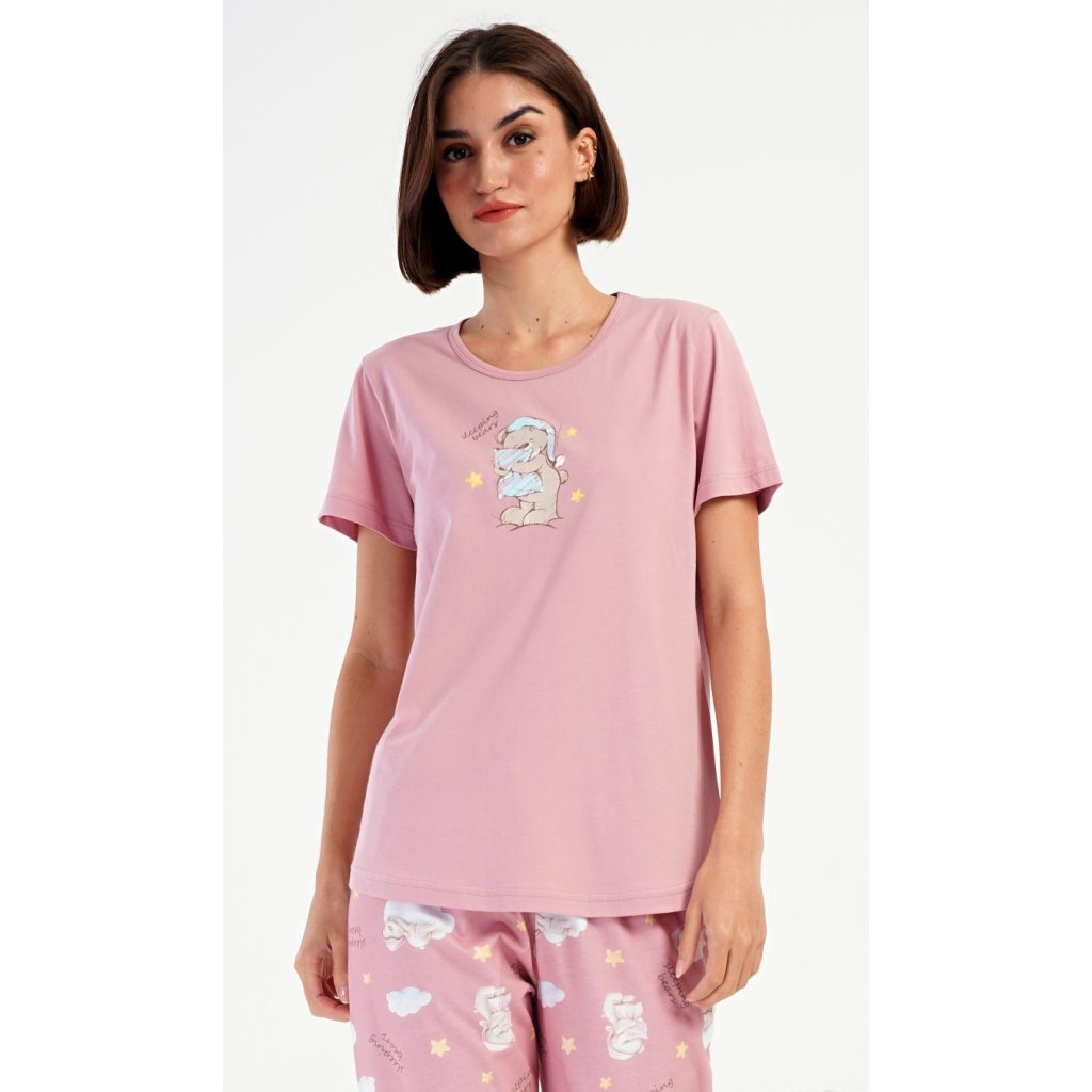 Dámské bavlněné kapri pyžamo Méďa s polštářem. Dámské pyžamo se skládá z trička s krátkým rukávem a tříčtvrtečních kalhot. Tričko s kulatým výstřihem má na hrudi obrázek medvídka s polštářem a čepičkou. Tento motiv se opakuje i na kalhotách, které mají v pase gumu a šňůrku na stažení, jsou bez kapes. Použitý bavlněný materiál je příjemný a poddajný na dotek.