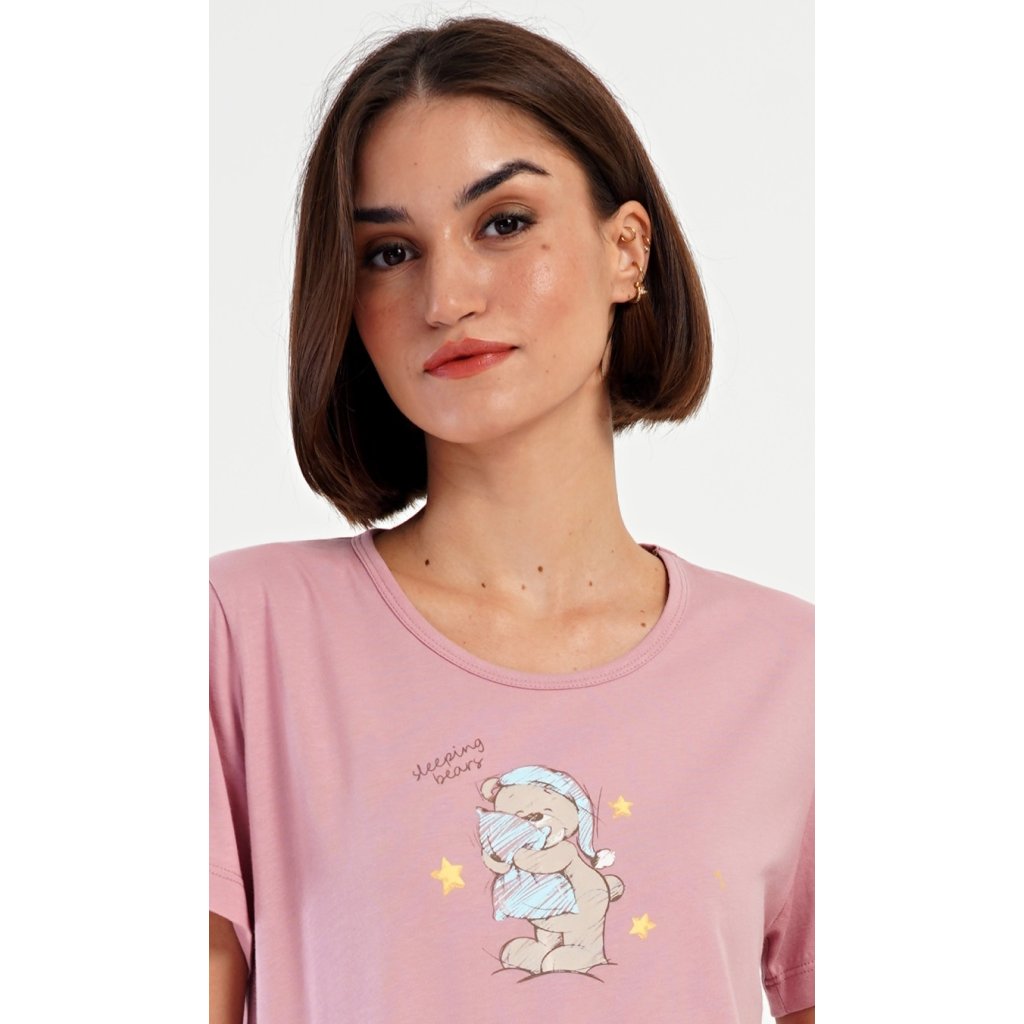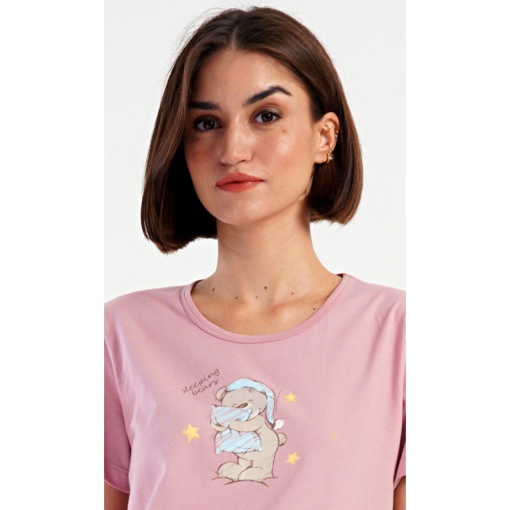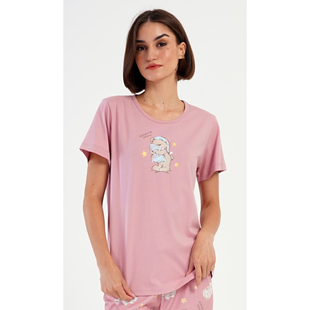 Dámské bavlněné kapri pyžamo Méďa s polštářem. Dámské pyžamo se skládá z trička s krátkým rukávem a tříčtvrtečních kalhot. Tričko s kulatým výstřihem má na hrudi obrázek medvídka s polštářem a čepičkou. Tento motiv se opakuje i na kalhotách, které mají v pase gumu a šňůrku na stažení, jsou bez kapes. Použitý bavlněný materiál je příjemný a poddajný na dotek.