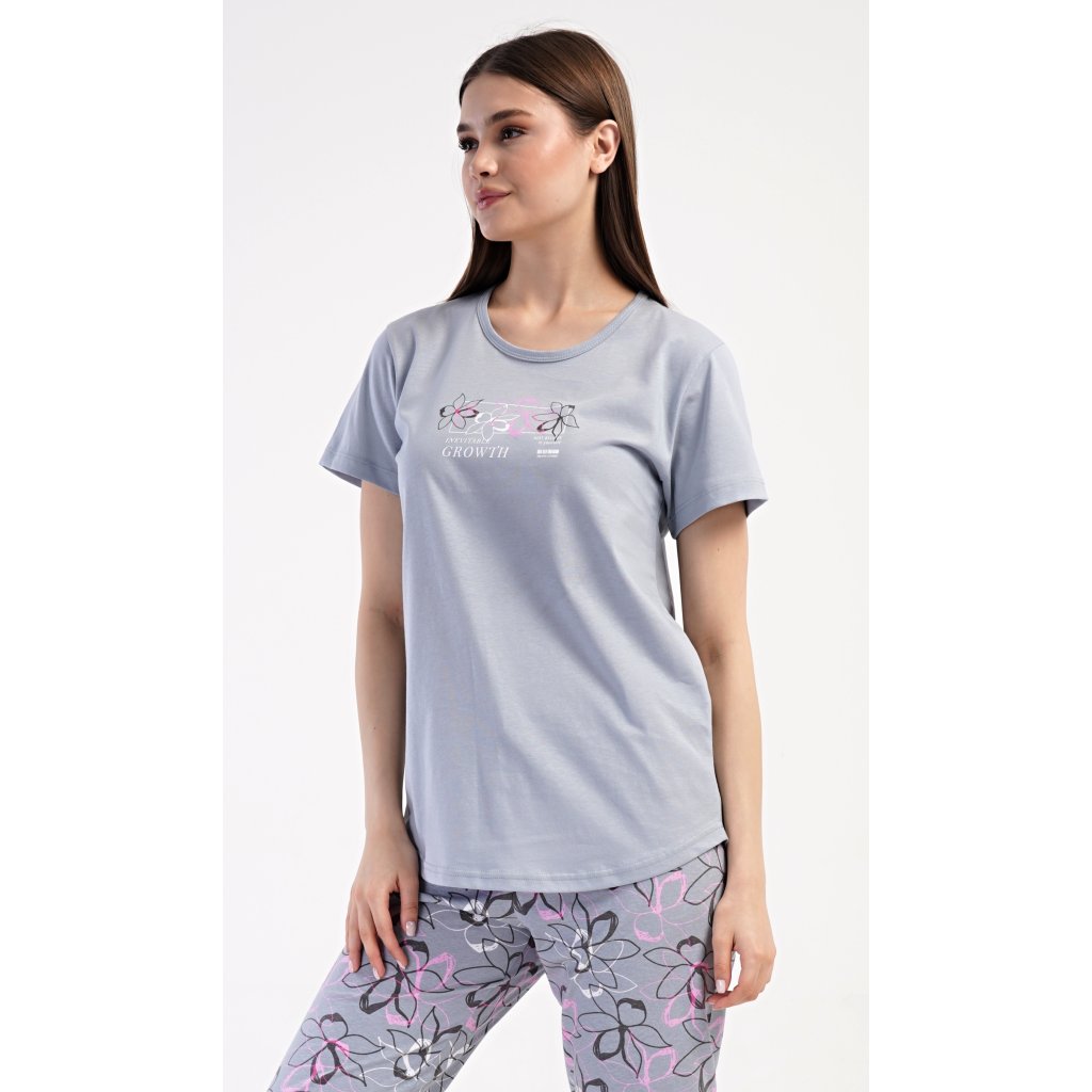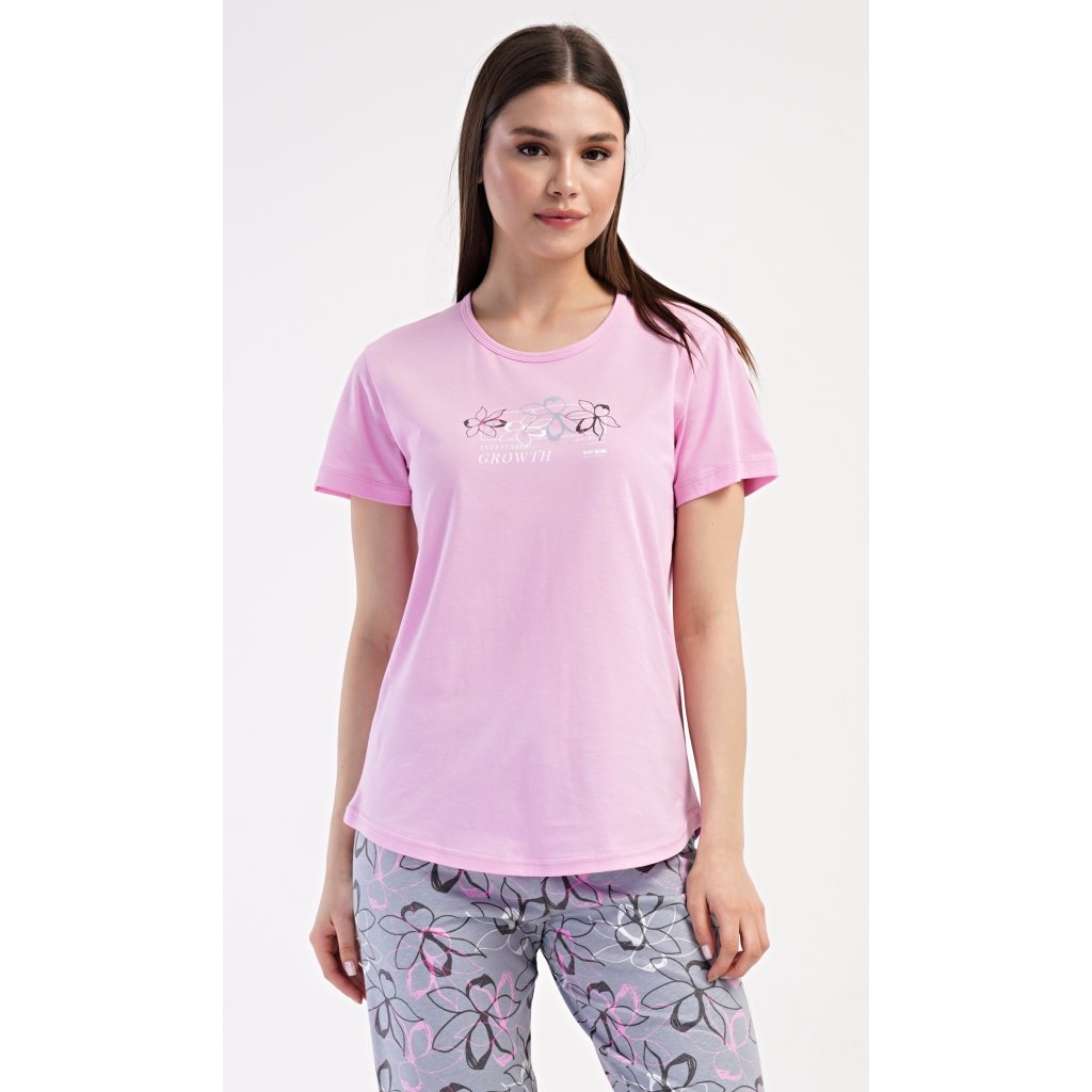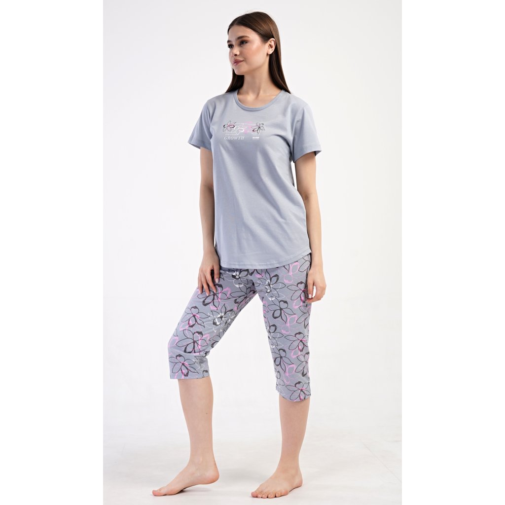 Dámské bavlněné kapri pyžamo Mia. Dámské pyžamo se skládá z trička s krátkým rukávem a tříčtvrtečních kalhot. Tričko s kulatým výstřihem zdobí na hrudi obrázek květin. Tento motiv se opakuje i na kalhotách, které mají v pase gumu a šňůrku na stažení, jsou bez kapes. Použitý bavlněný materiál je příjemný a poddajný na dotek.