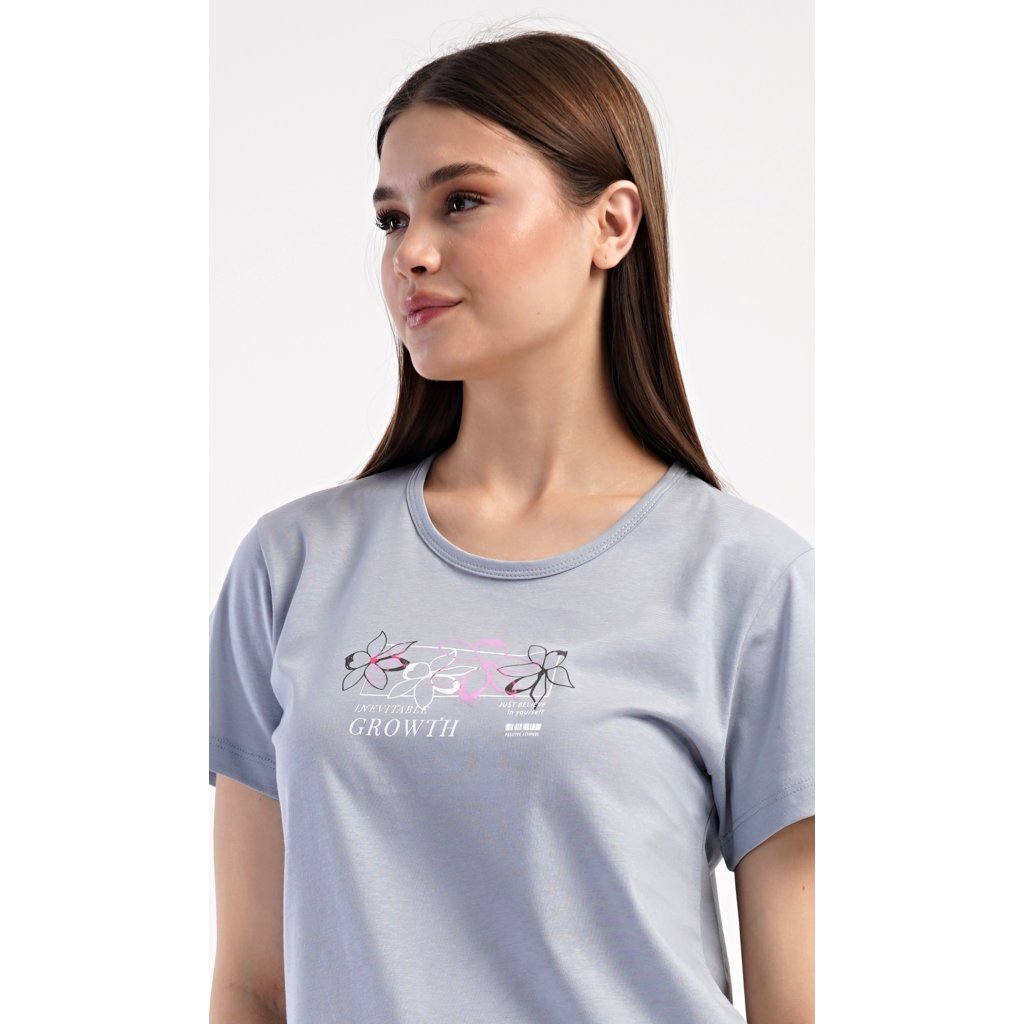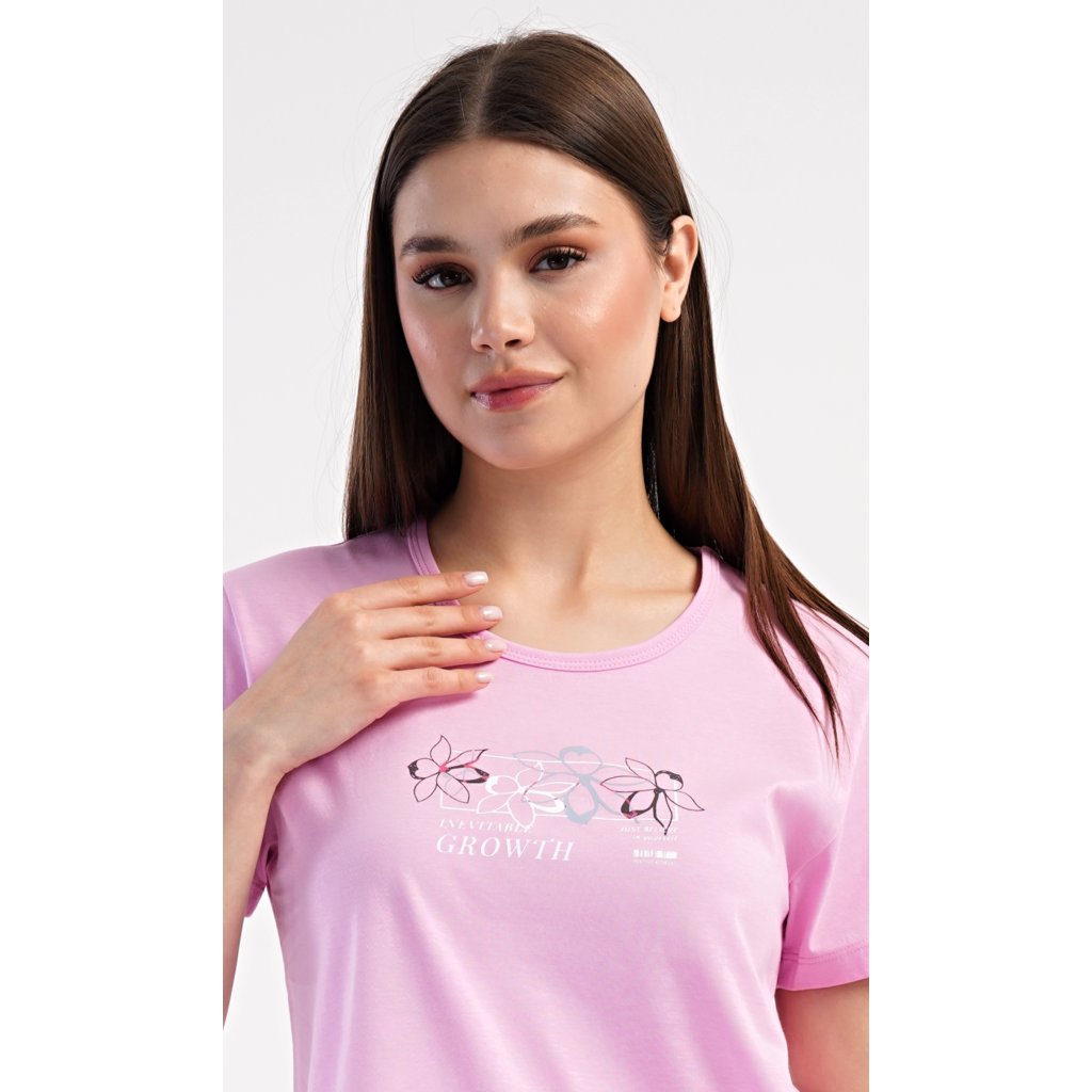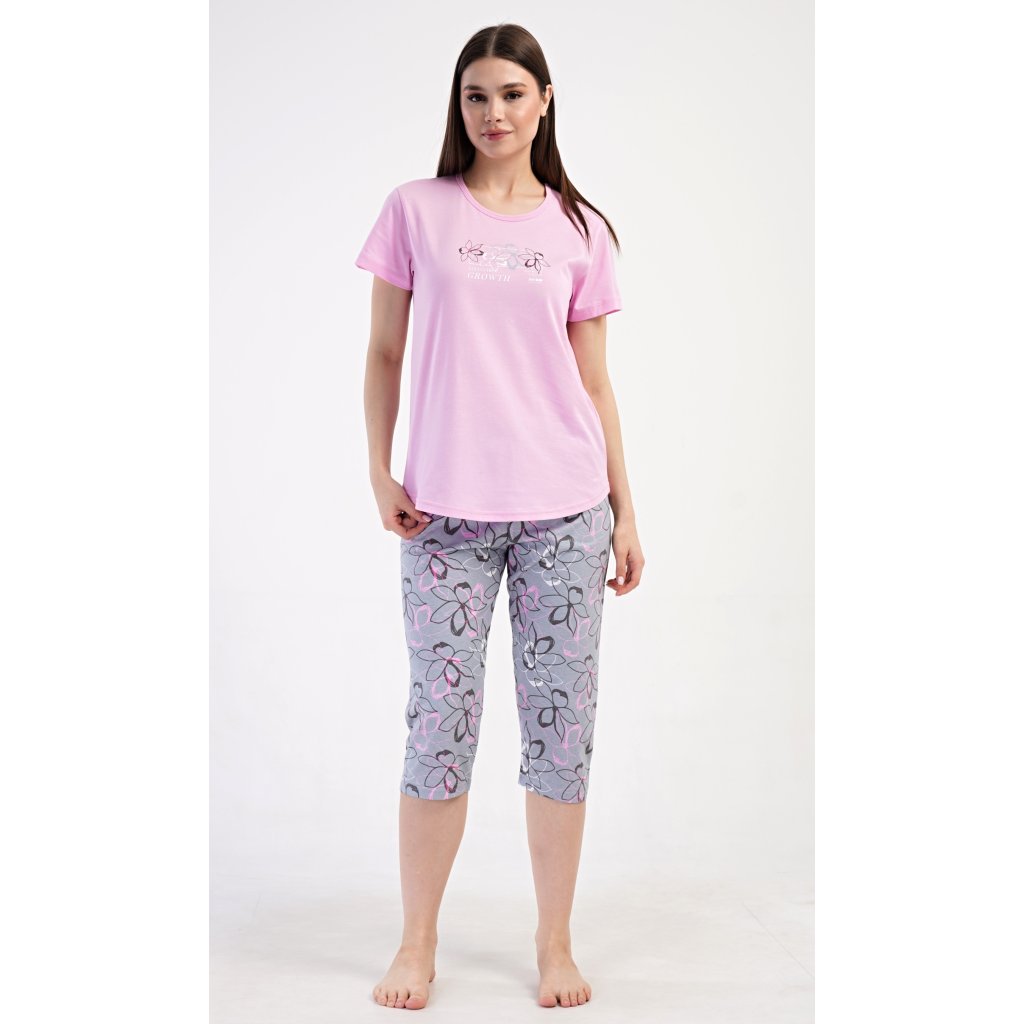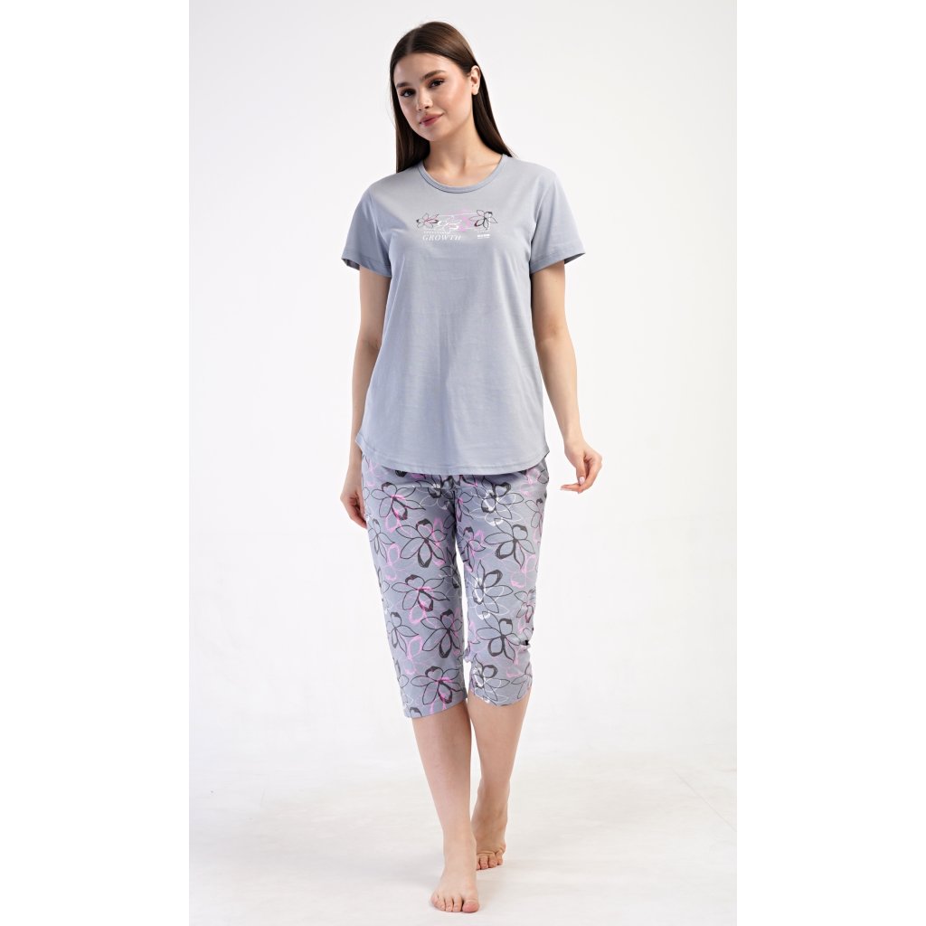 Dámské bavlněné kapri pyžamo Mia. Dámské pyžamo se skládá z trička s krátkým rukávem a tříčtvrtečních kalhot. Tričko s kulatým výstřihem zdobí na hrudi obrázek květin. Tento motiv se opakuje i na kalhotách, které mají v pase gumu a šňůrku na stažení, jsou bez kapes. Použitý bavlněný materiál je příjemný a poddajný na dotek.