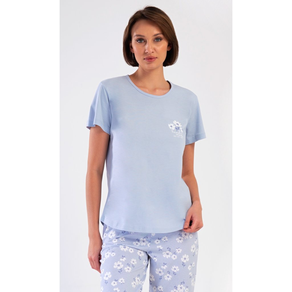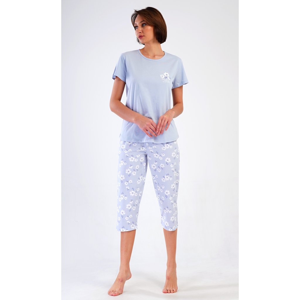 Dámské bavlněné kapri pyžamo Nature. Dámské pyžamo se skládá z trička s krátkým rukávem a tříčtvrtečních kalhot. Tričko s kulatým výstřihem má na hrudi obrázek květu. Tento motiv se opakuje i na kalhotách, které mají v pase gumu a šňůrku na stažení, jsou bez kapes. Použitý bavlněný materiál je příjemný a poddajný na dotek.