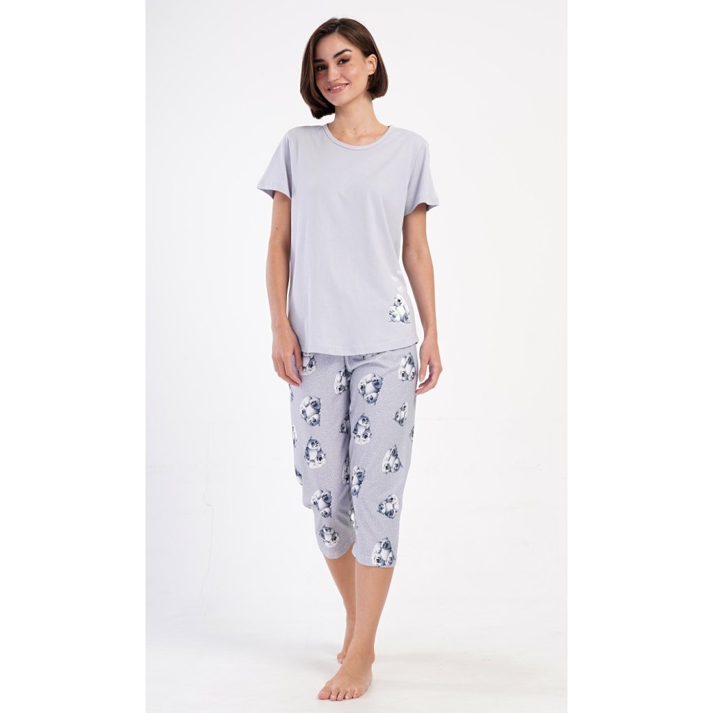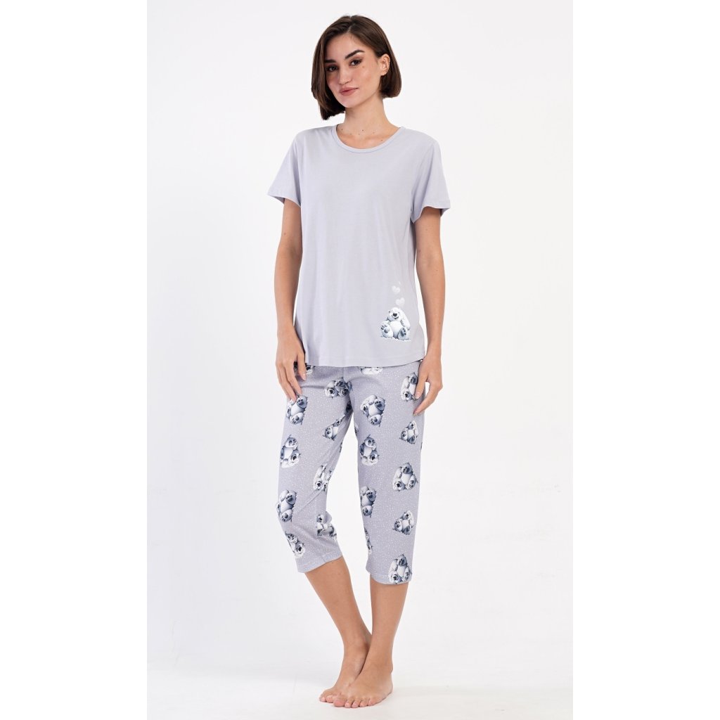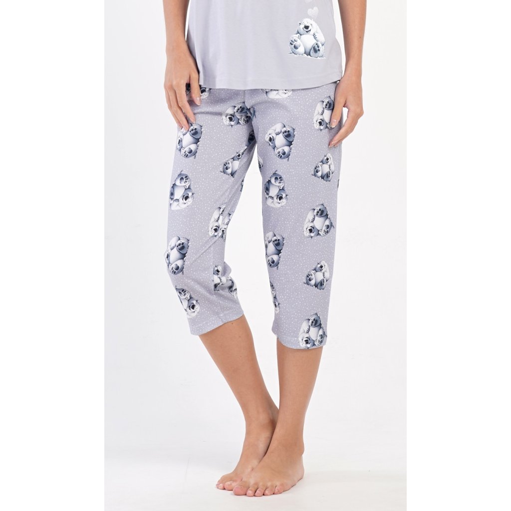 Dámské bavlněné kapri pyžamo Polar bear. Dámské pyžamo se skládá z trička s krátkým rukávem a tříčtvrtečních kalhot. Tričko s kulatým výstřihem zdobí obrázek ledního medvěda. Tento motiv se opakuje i na tříčtvrtečních kalhotách, které mají v pase gumu a šňůrku na stažení, jsou bez kapes. Použitý bavlněný materiál je příjemný a poddajný na dotek.