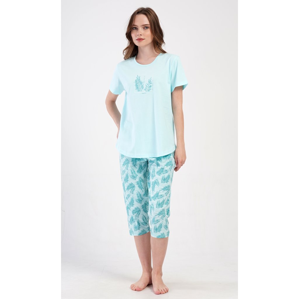 Dámské bavlněné kapri pyžamo Simona. Dámské pyžamo se skládá z trička s krátkým rukávem a tříčtvrtečních kalhot. Tričko s kulatým výstřihem má na hrudi obrázek větvičky a drobný nápis. Motiv větviček se opakuje i na kalhotách, které mají v pase gumu a šňůrku na stažení, jsou bez kapes. Použitý bavlněný materiál je příjemný a poddajný na dotek.