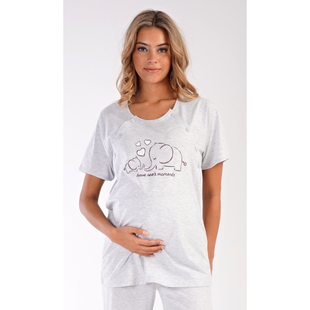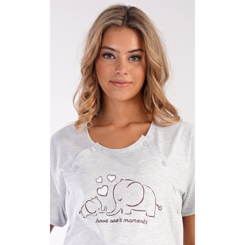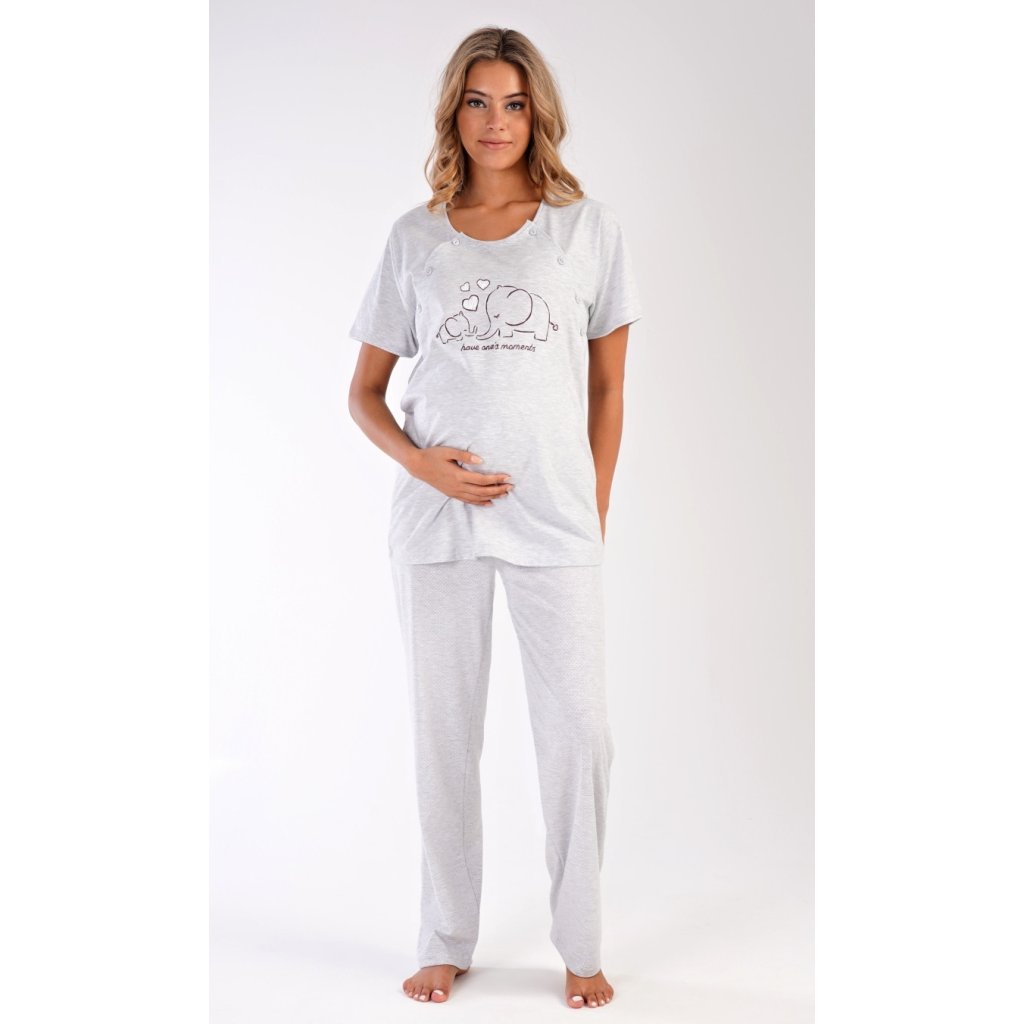Dámské mateřské pyžamo Slůně. Pyžamo se skládá z trička s krátkým rukávem a dlouhých kalhot. Tričko je volněnjší, má kulatý výstřih a praktické průstřihy na kojení, které se zapínají na knoflíčky. Zdobí ho obrázek sloní maminky se slůnětem. Kalhoty jsou volnější v pase, mají gumu a šňůrku ke stažení a jsou potištěny jemnými puntíky. Toto pyžamko je vhodné do porodnice a po dobu kojení. U lososové barvy je podíl bavlny 100%, u šedé 70%. Materiál je příjemný a poddajný na dotek.