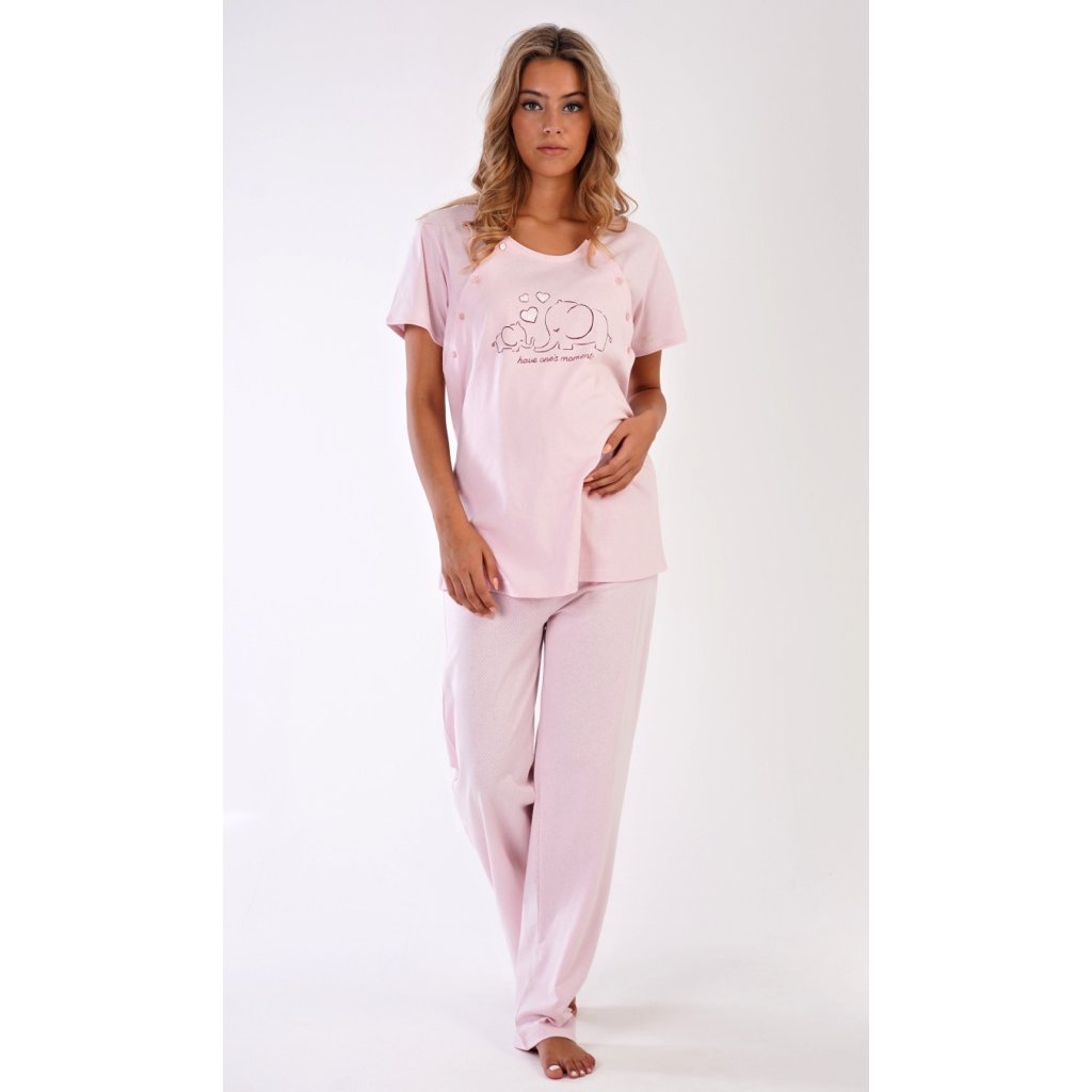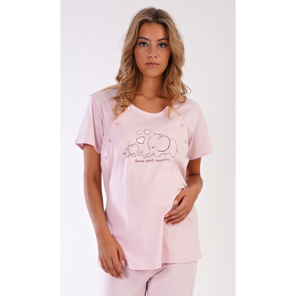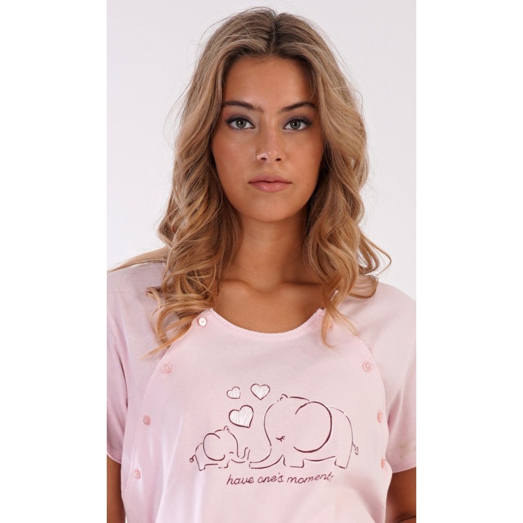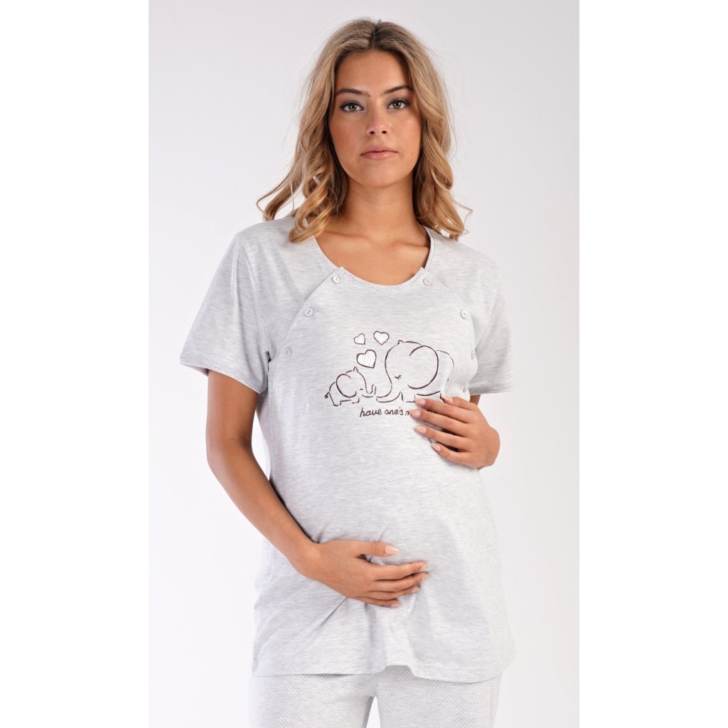 Dámské mateřské pyžamo Slůně. Pyžamo se skládá z trička s krátkým rukávem a dlouhých kalhot. Tričko je volněnjší, má kulatý výstřih a praktické průstřihy na kojení, které se zapínají na knoflíčky. Zdobí ho obrázek sloní maminky se slůnětem. Kalhoty jsou volnější v pase, mají gumu a šňůrku ke stažení a jsou potištěny jemnými puntíky. Toto pyžamko je vhodné do porodnice a po dobu kojení. U lososové barvy je podíl bavlny 100%, u šedé 70%. Materiál je příjemný a poddajný na dotek.