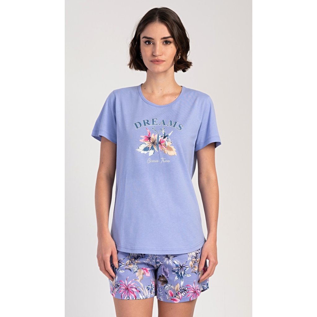 Dámské bavlněné pyžamo šortky Alžběta. Dámské pyžamo se skládá z trička s krátkým rukávem a šortkových kalhot. Na jednobarevném tričku je obrázek květů ve tvaru motýla a nápis 'Dreams come true'. Šortky s potiskem exotických květů mají v pase gumu a šňůrku na stáhnutí, jsou bez kapes. Použitý bavlněný materiál je příjemný a poddajný na dotek.