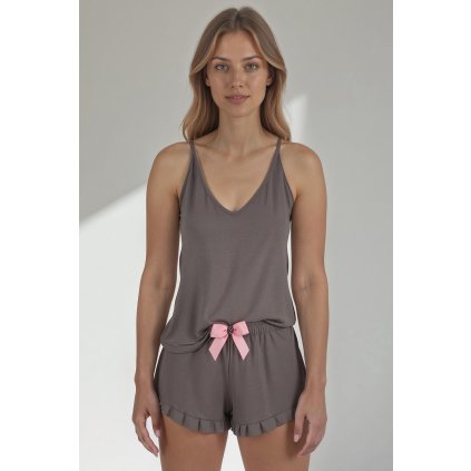 Dámské bavlněné pyžamo šortky Ellie. Dámské šortkové pyžamo se skládá z trika s krátkým rukávem a krátkých kalhot. Triko je jemně zdobené obrysem velkého květu a šortky jsou na světlém podkladu také květinové. Šortky jsou v pase do gumy a mají praktickou šňůrku v pase, nemají kapsy. Použitý bavlněný materiál je poddajný a příjemný na dotek.