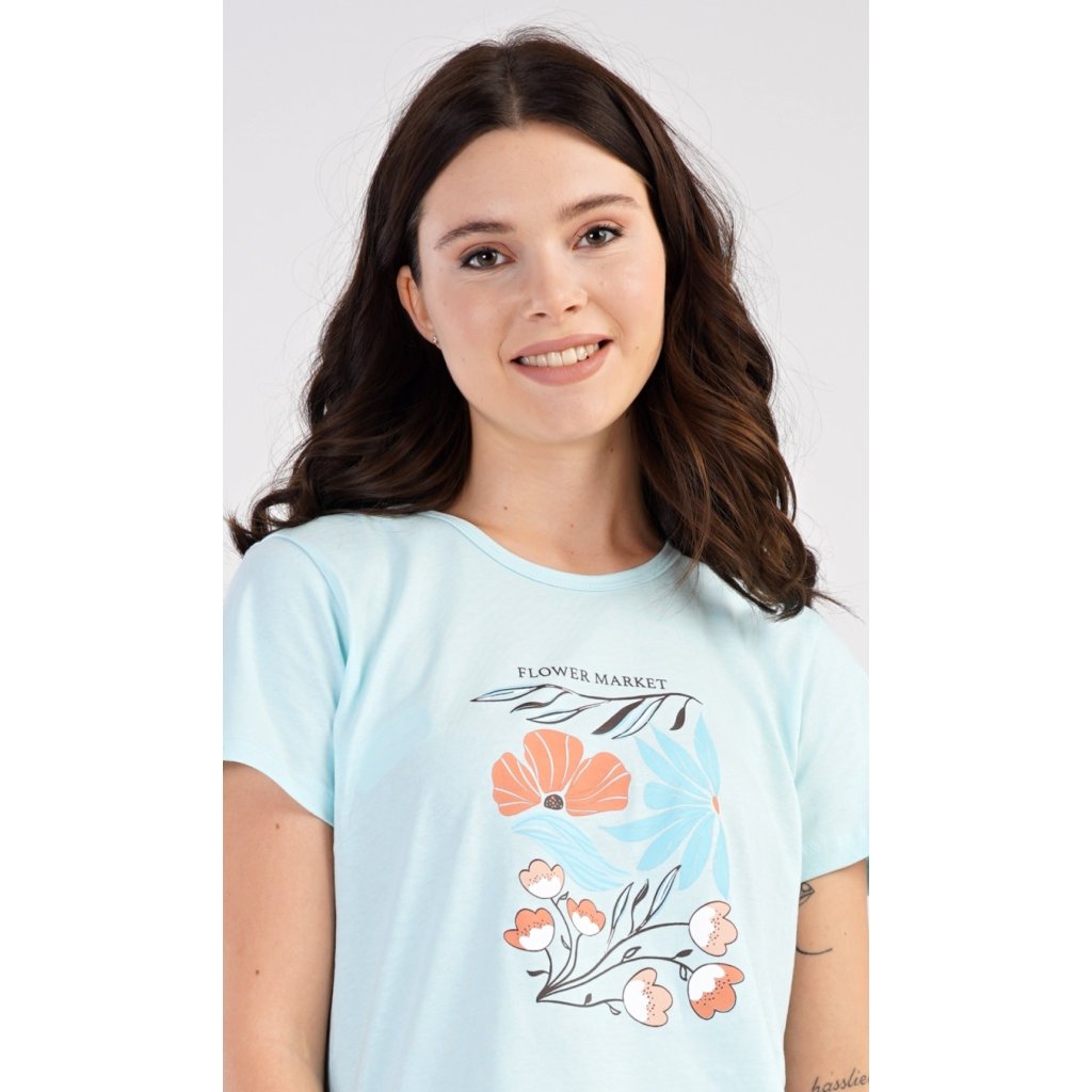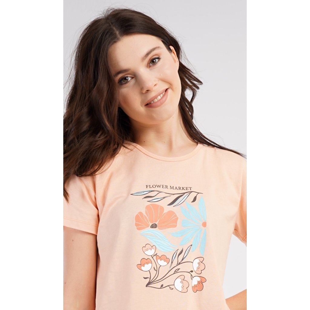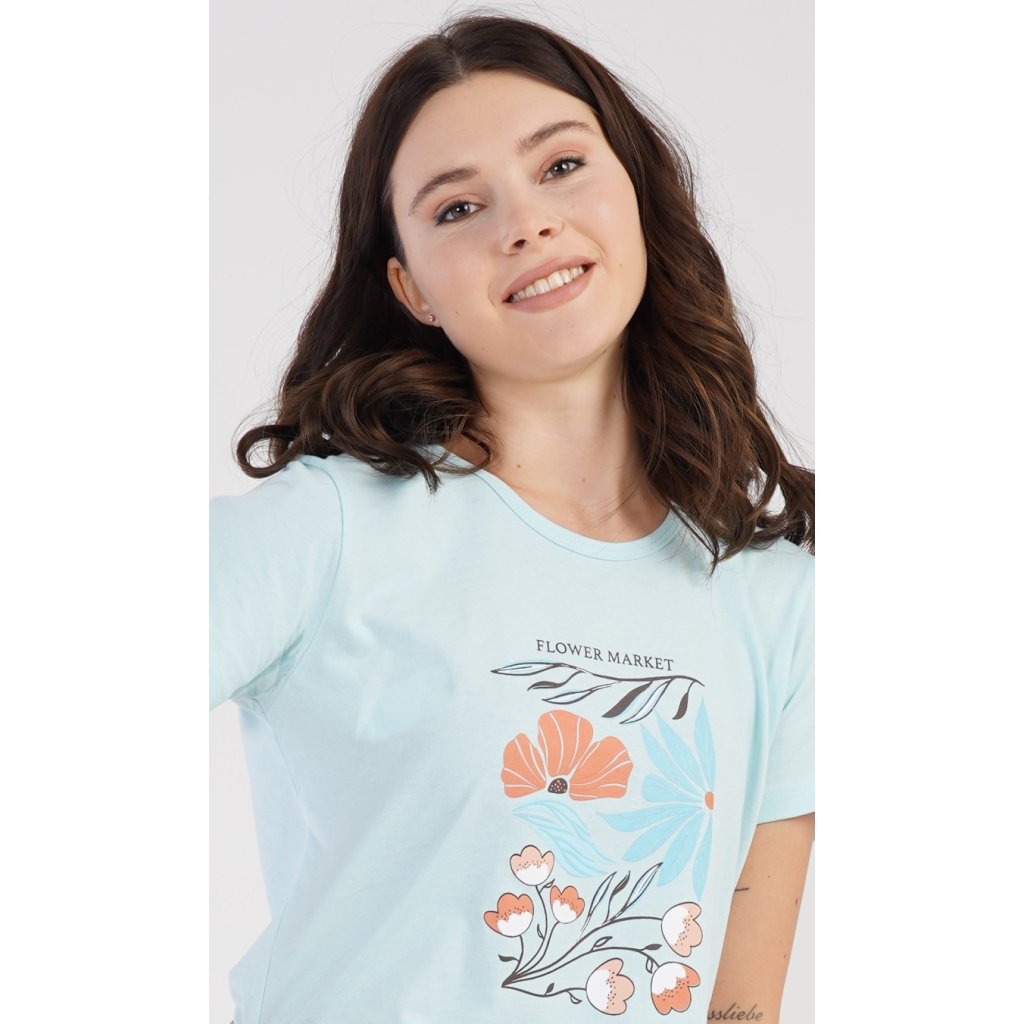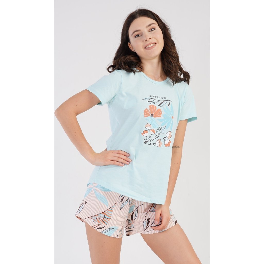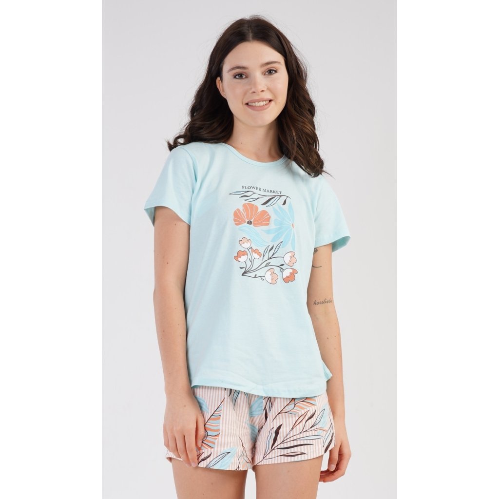 Dámské bavlněné pyžamo šortky Melissa. Dámské pyžamo se skládá z trička s krátkým rukávem a šortkových kalhot. Na jednobarevném tričku je obrázek skládající se z květů, listů a větviček. Stejný motiv se opakuje i na šortkách. Šortky mají v pase gumu a šňůrku na stáhnutí, jsou bez kapes. Použitý bavlněný materiál je příjemný a poddajný na dotek.