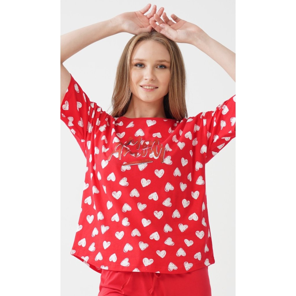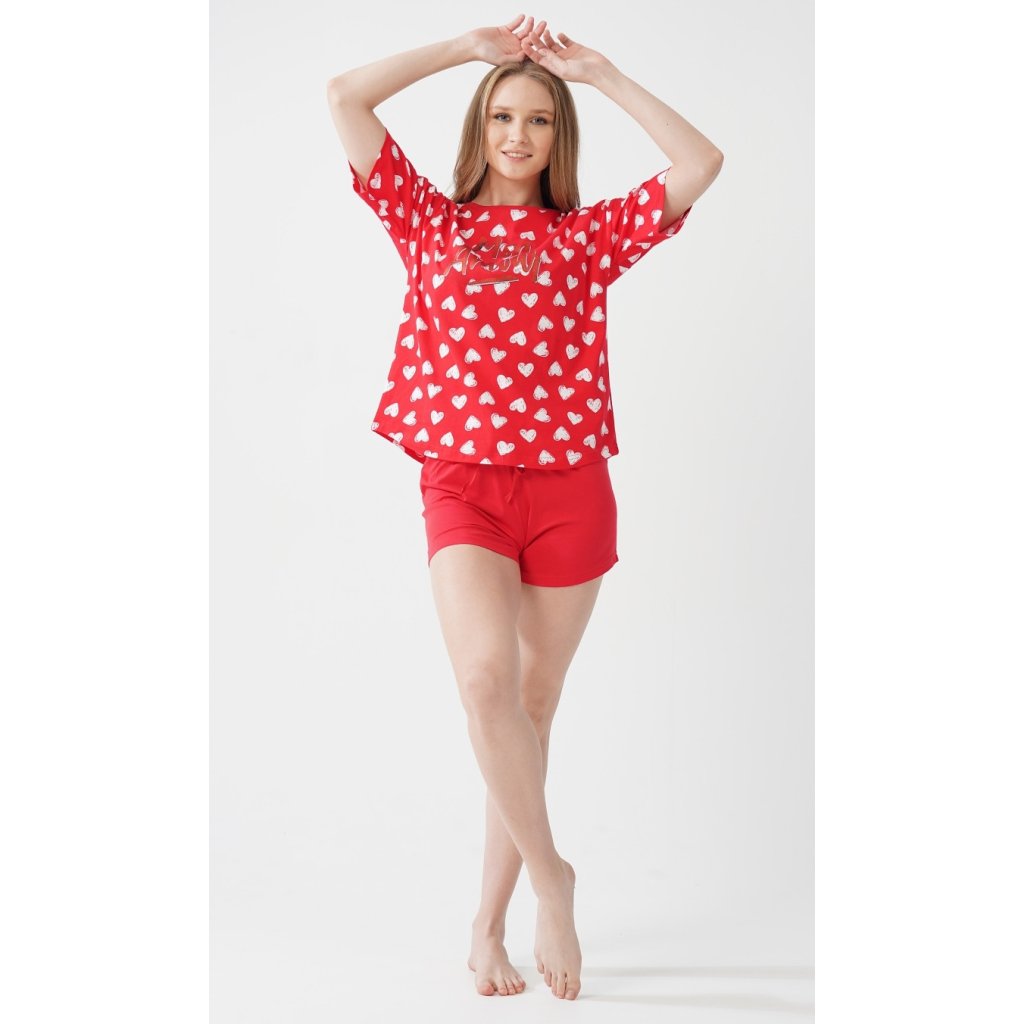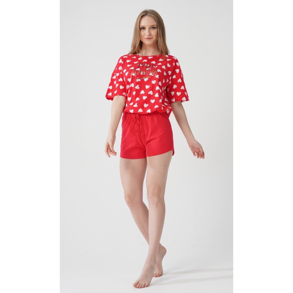 Dámské bavlněné pyžamo šortky Mon amour. Dámské pyžamo šortky se skládá z trička s krátkým rukávem a krátkých šortkových kalhot. Červené tričko je potištěno bílými srdíčky, zdobí ho nápis MON AMOUR. Výrazné tričko vhodně doplňují jednobarevné červené šortky s gumou a šňůrkou ke stažení v pase. Použitý bavlněný materiál je příjemný a poddajný na dotek.