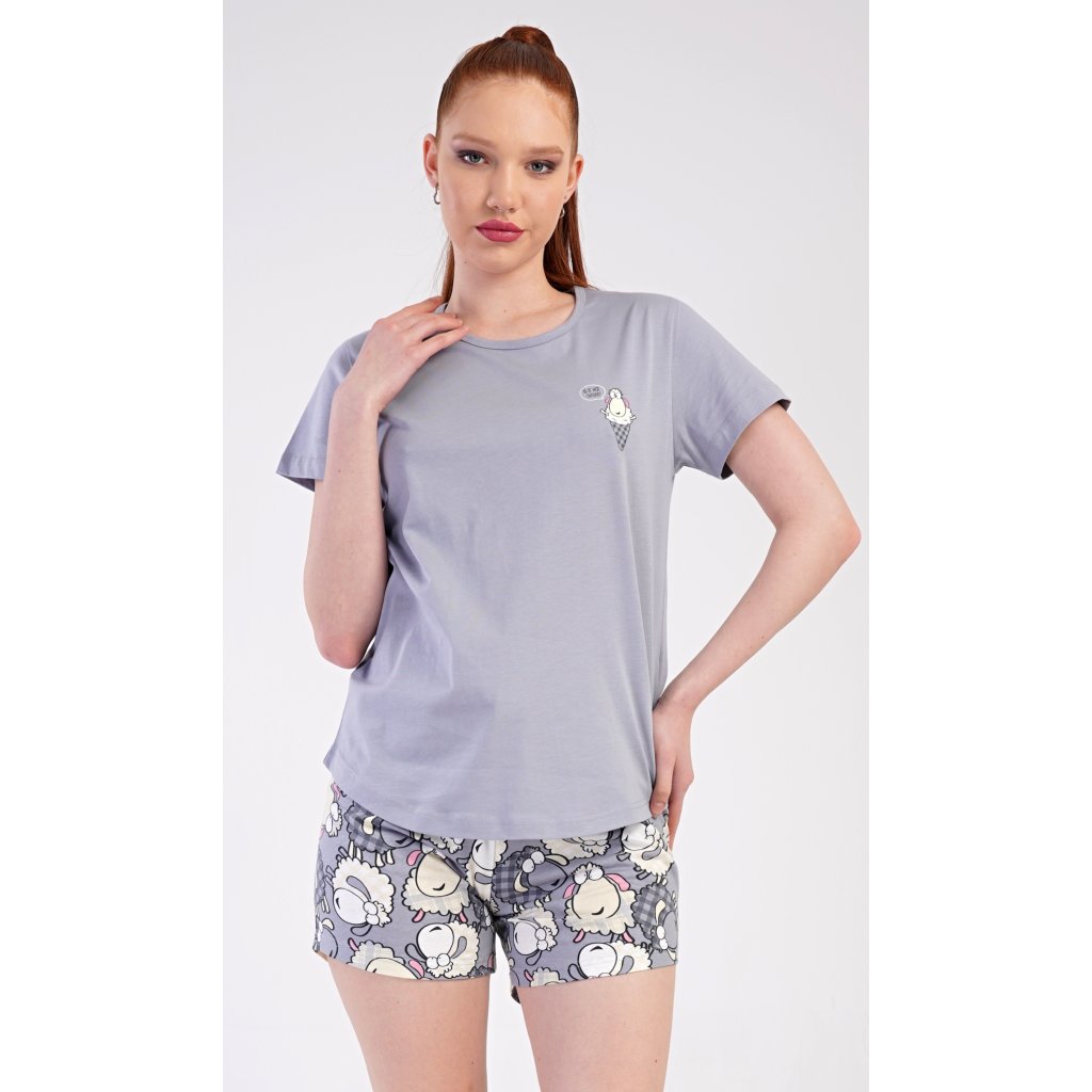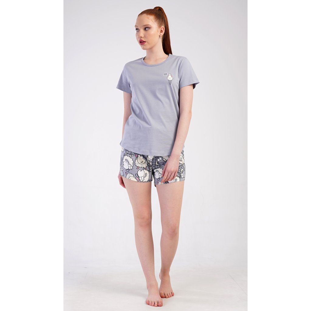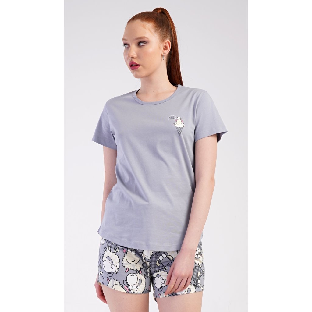 Dámské bavlněné šortkové pyžamo Ovečky. Dámské pyžamo se skládá z trička s krátkým rukávem a šortkových kalhot. Jednobarevné tričko zdobí obrázek veselé ovečky. Tento motiv se opakuje i na šortkách, které mají v pase gumu a šňůrku na stáhnutí, jsou bez kapes. Použitý bavlněný materiál je příjemný a poddajný na dotek.