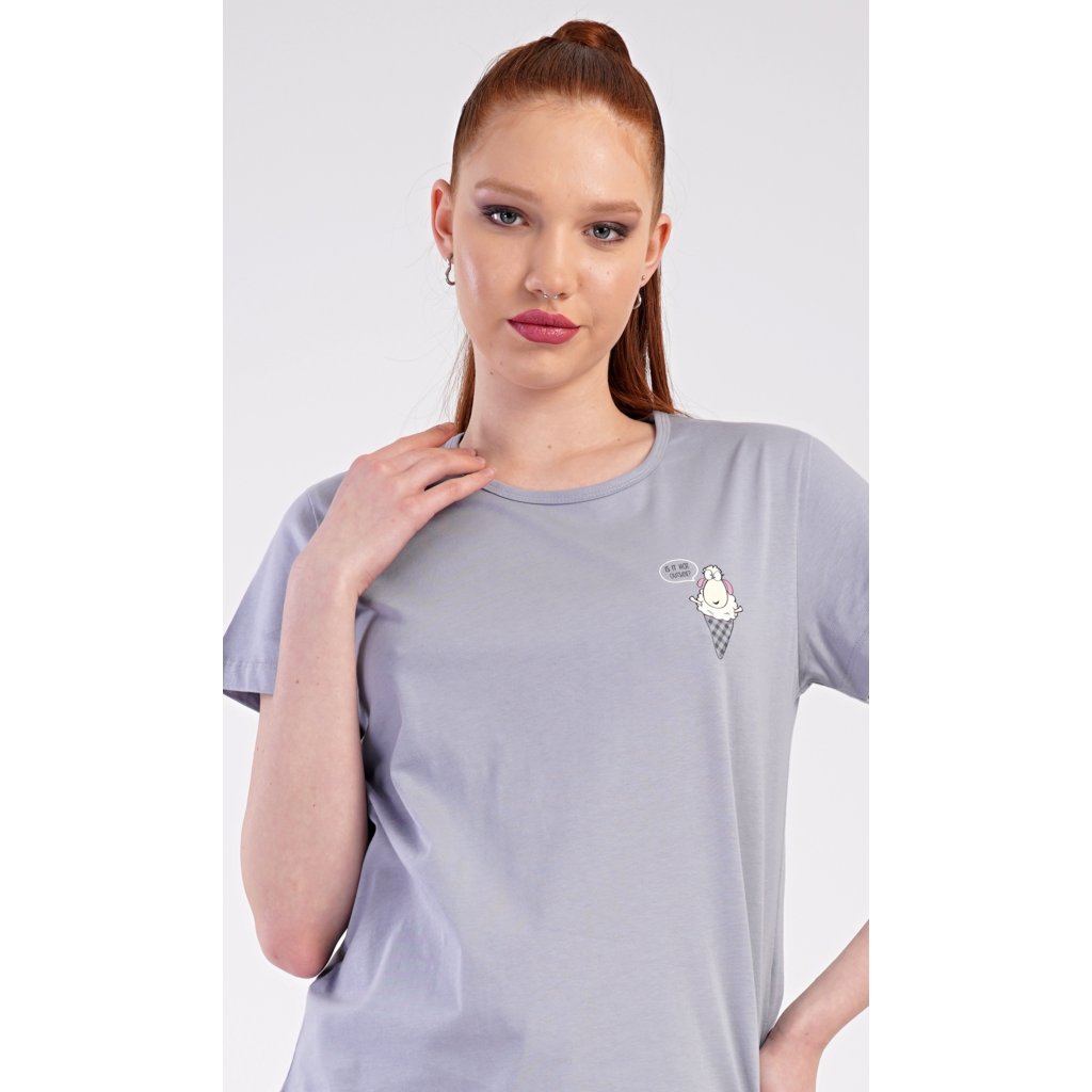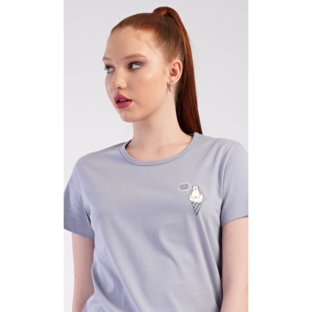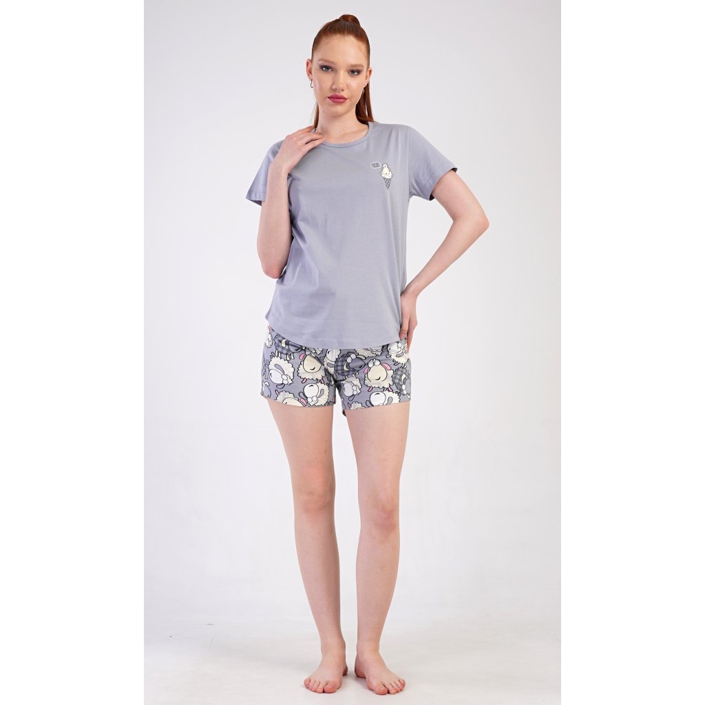 Dámské bavlněné šortkové pyžamo Ovečky. Dámské pyžamo se skládá z trička s krátkým rukávem a šortkových kalhot. Jednobarevné tričko zdobí obrázek veselé ovečky. Tento motiv se opakuje i na šortkách, které mají v pase gumu a šňůrku na stáhnutí, jsou bez kapes. Použitý bavlněný materiál je příjemný a poddajný na dotek.