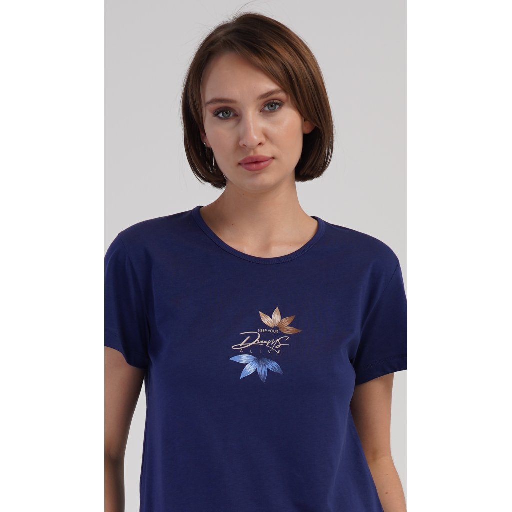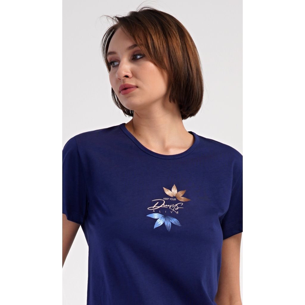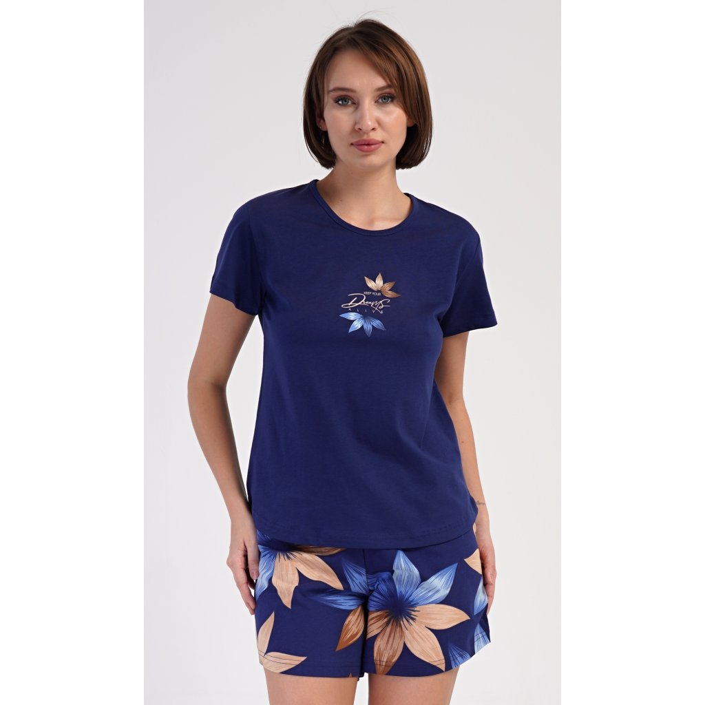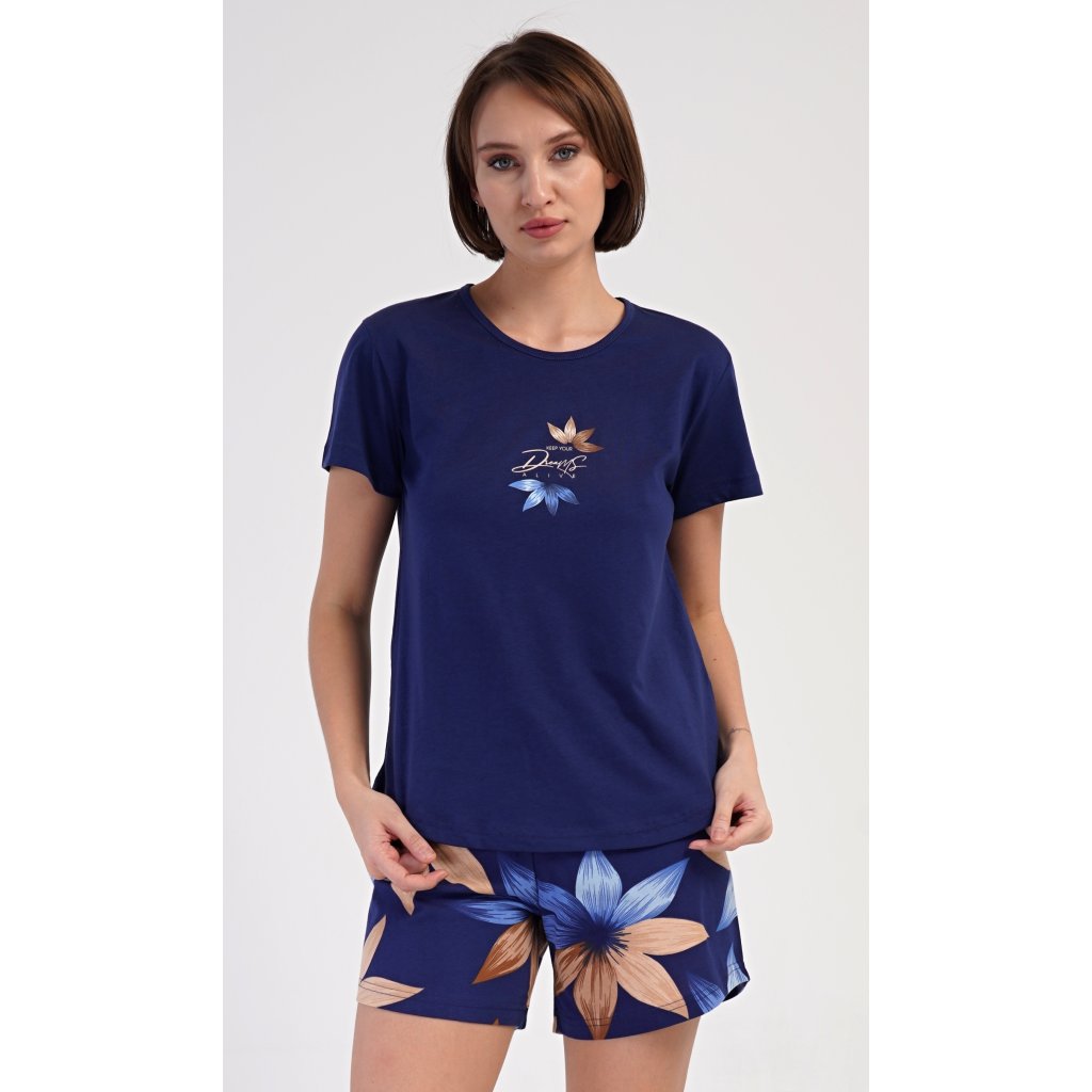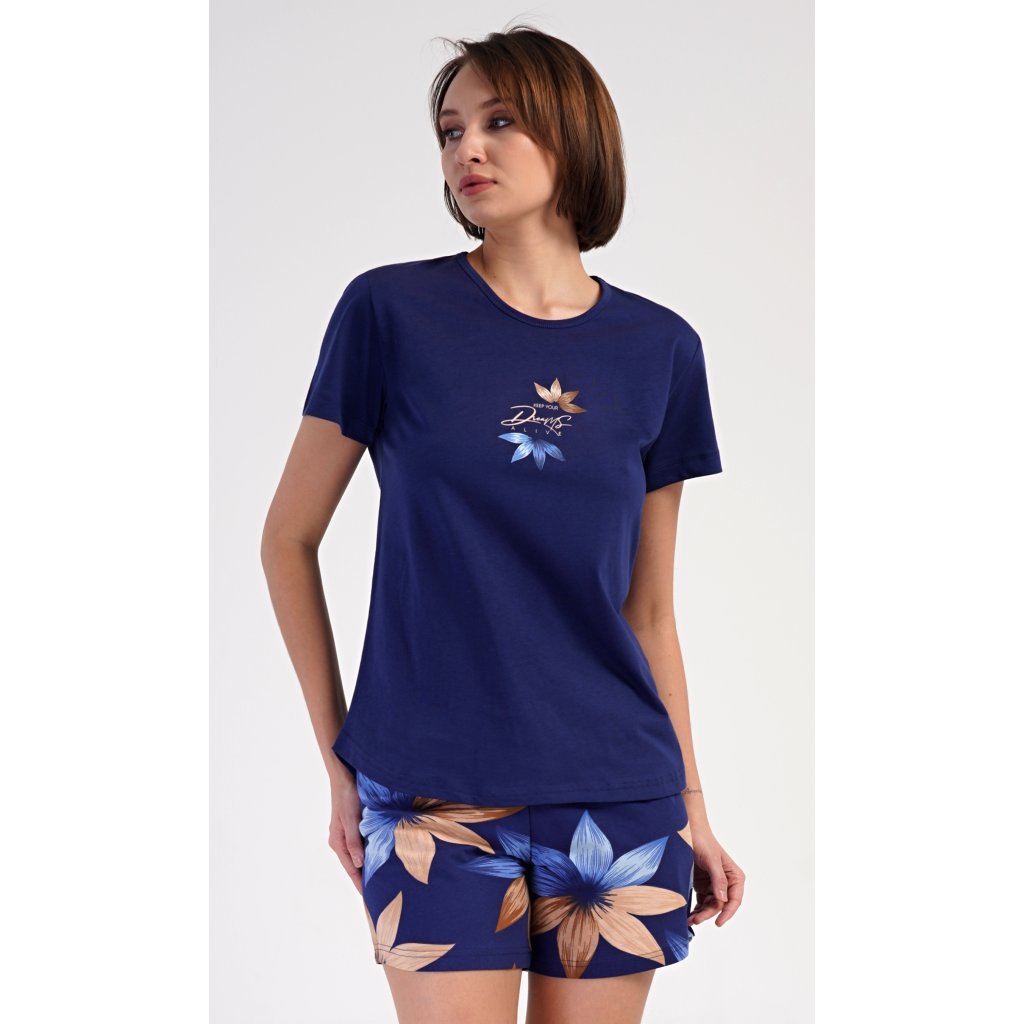 Dámské bavlněné šortkové pyžamo Sára. Dámské pyžamo se skládá z trička s krátkým rukávem a šortkových kalhot. Jednobarevné tričko zdobí obrázek květu. Květinový motiv se opakuje i na šortkách, které mají v pase gumu a šňůrku na stáhnutí, jsou bez kapes. Použitý bavlněný materiál je příjemný a poddajný na dotek.