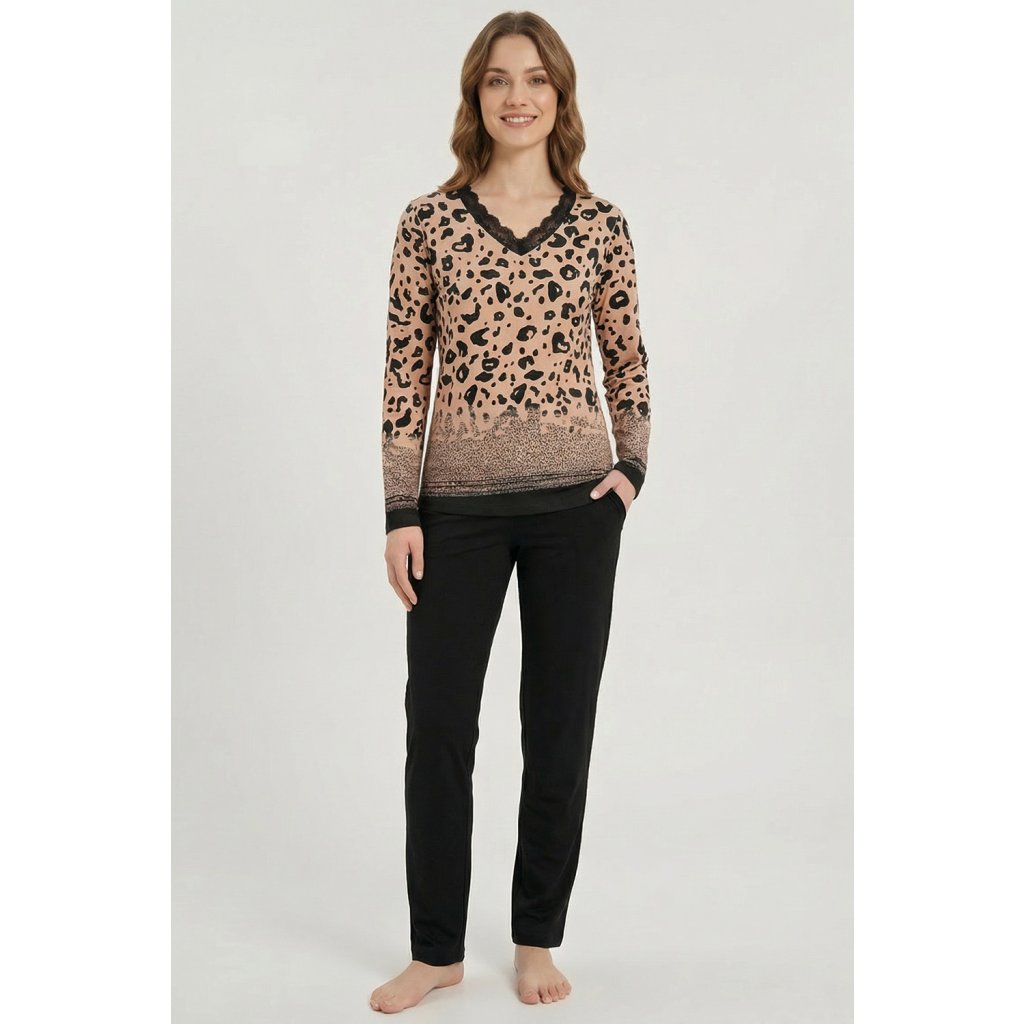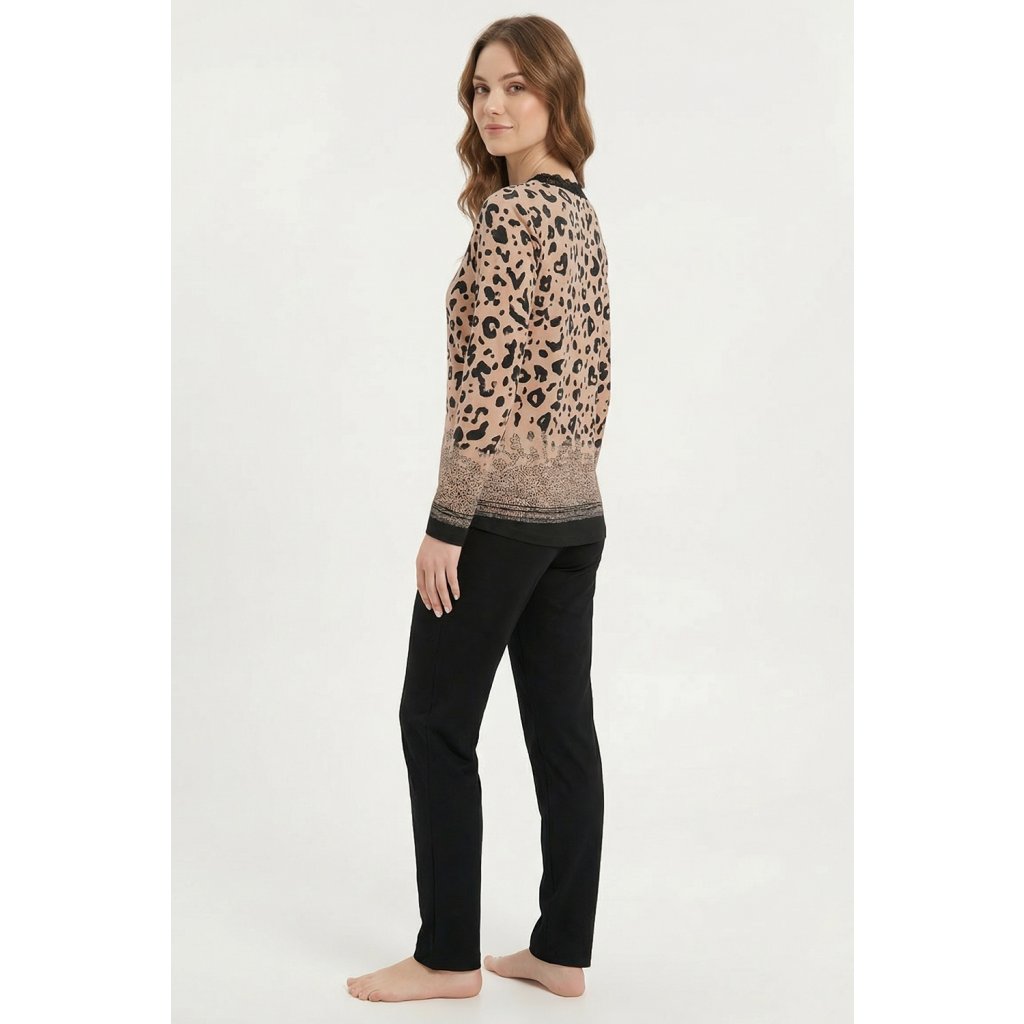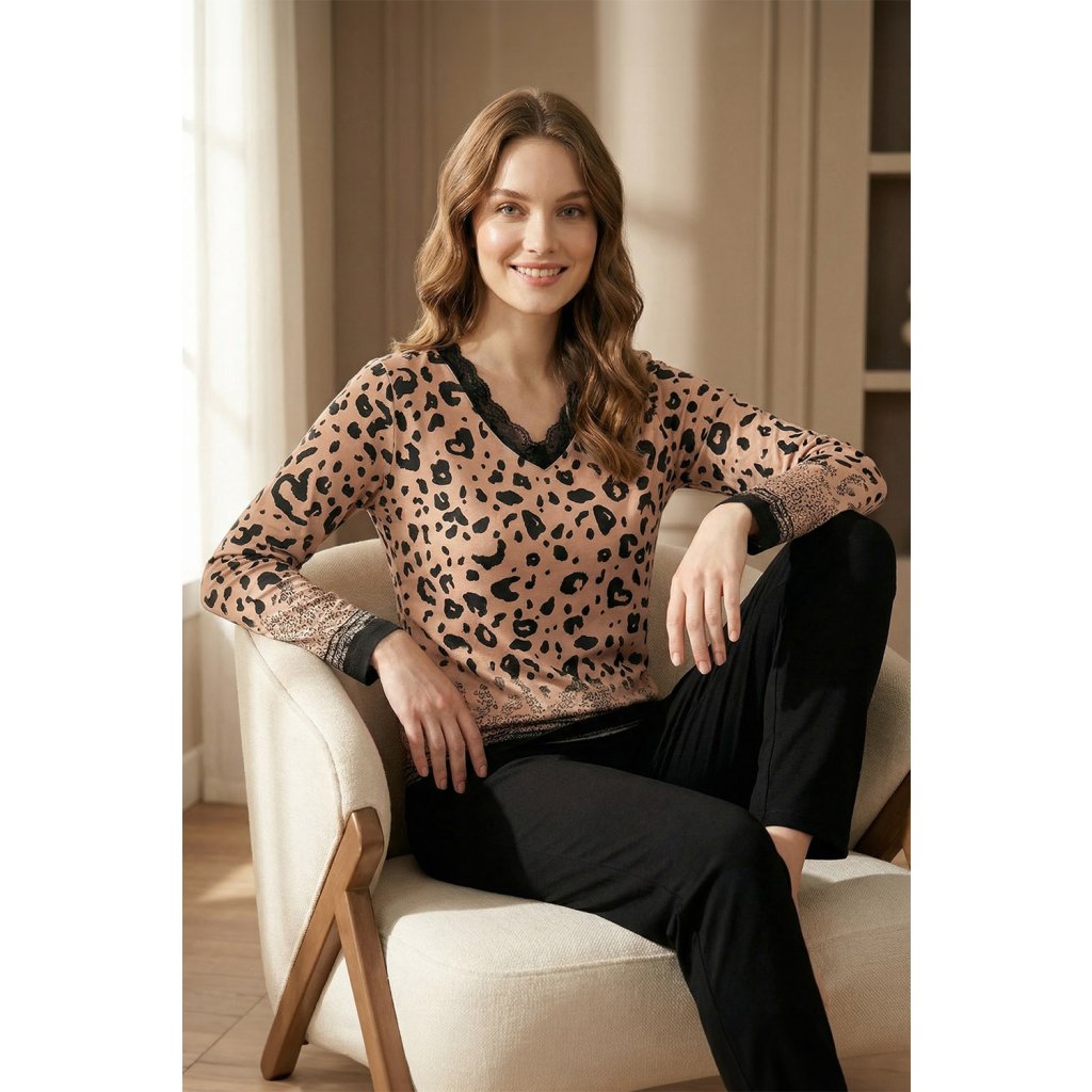 Vivisence 2061 je pyžamová sada, která kombinuje měkkost modalu a bavlny a poskytuje prodyšný a pohodlný pocit. Vrchní díl tvoří halenka s dlouhým rukávem a leopardím vzorem a výstřih do V je decentně lemován krajkou, která dodává kousku jemný, ženský nádech. Volný střih umožňuje neomezený pohyb, zatímco hladké a pečlivé zakončení zvyšuje pohodlí. Dlouhé kalhoty mají volný, rovný střih nohavic a praktické boční kapsy. Pohodlný elastický pas podporuje pohodlí během spánku a relaxace doma. Měkký úplet je příjemný na dotek, přizpůsobí se tělu a je vhodný pro celoroční nošení. Toto je volba pro ty, kteří si cení pohodlí, přirozeného stylu a estetických detailů.Halenka s leopardím vzorem a výstřihem do V