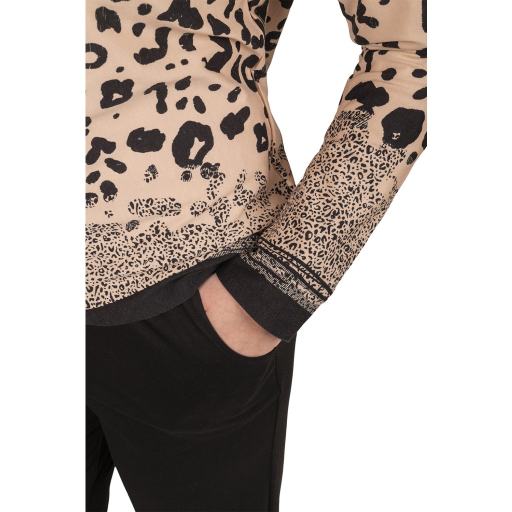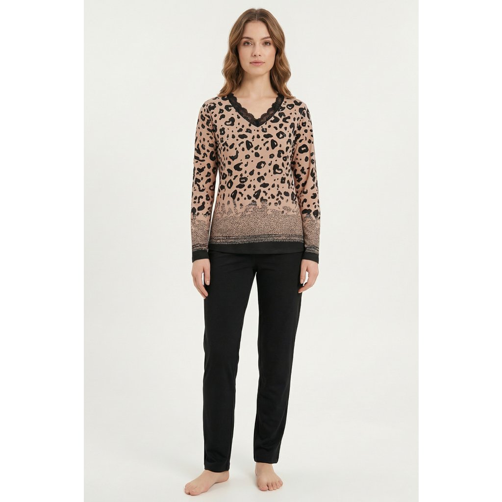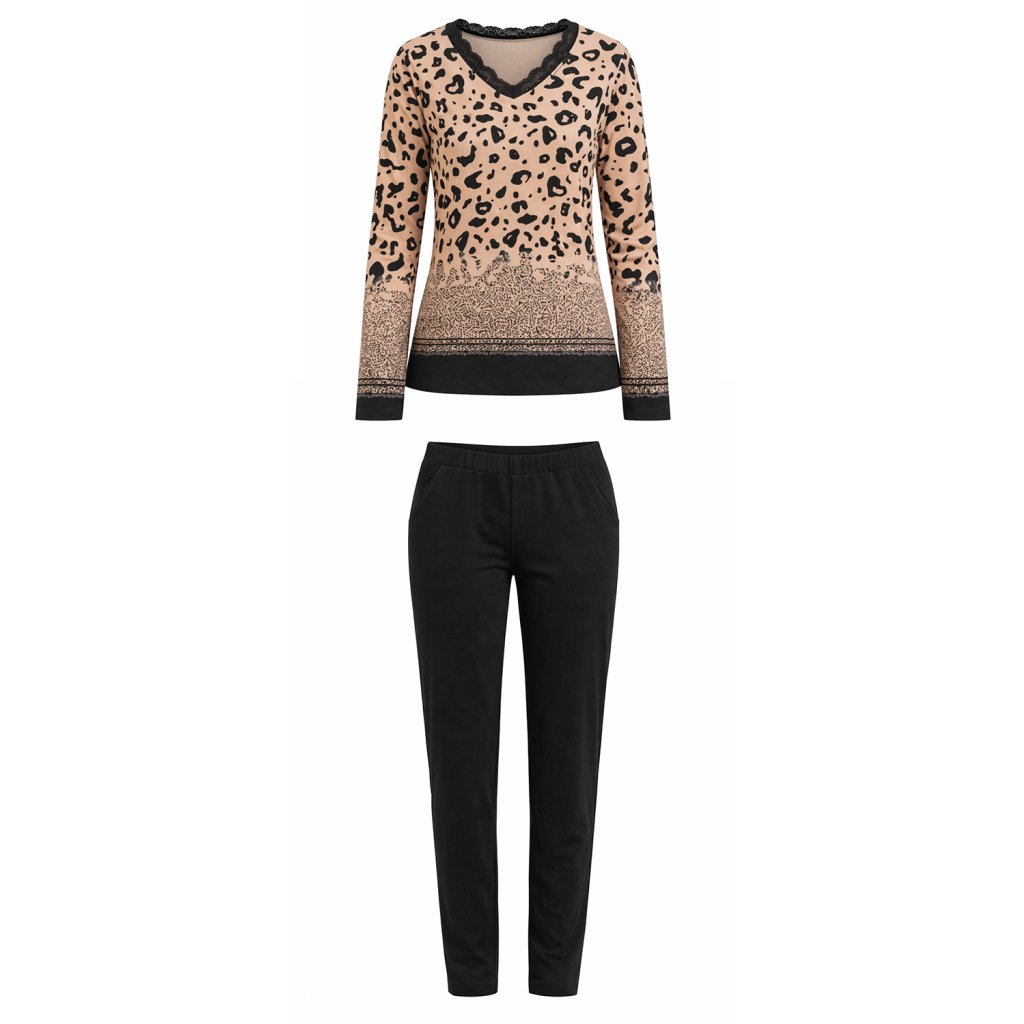 Vivisence 2061 je pyžamová sada, která kombinuje měkkost modalu a bavlny a poskytuje prodyšný a pohodlný pocit. Vrchní díl tvoří halenka s dlouhým rukávem a leopardím vzorem a výstřih do V je decentně lemován krajkou, která dodává kousku jemný, ženský nádech. Volný střih umožňuje neomezený pohyb, zatímco hladké a pečlivé zakončení zvyšuje pohodlí. Dlouhé kalhoty mají volný, rovný střih nohavic a praktické boční kapsy. Pohodlný elastický pas podporuje pohodlí během spánku a relaxace doma. Měkký úplet je příjemný na dotek, přizpůsobí se tělu a je vhodný pro celoroční nošení. Toto je volba pro ty, kteří si cení pohodlí, přirozeného stylu a estetických detailů.Halenka s leopardím vzorem a výstřihem do V
