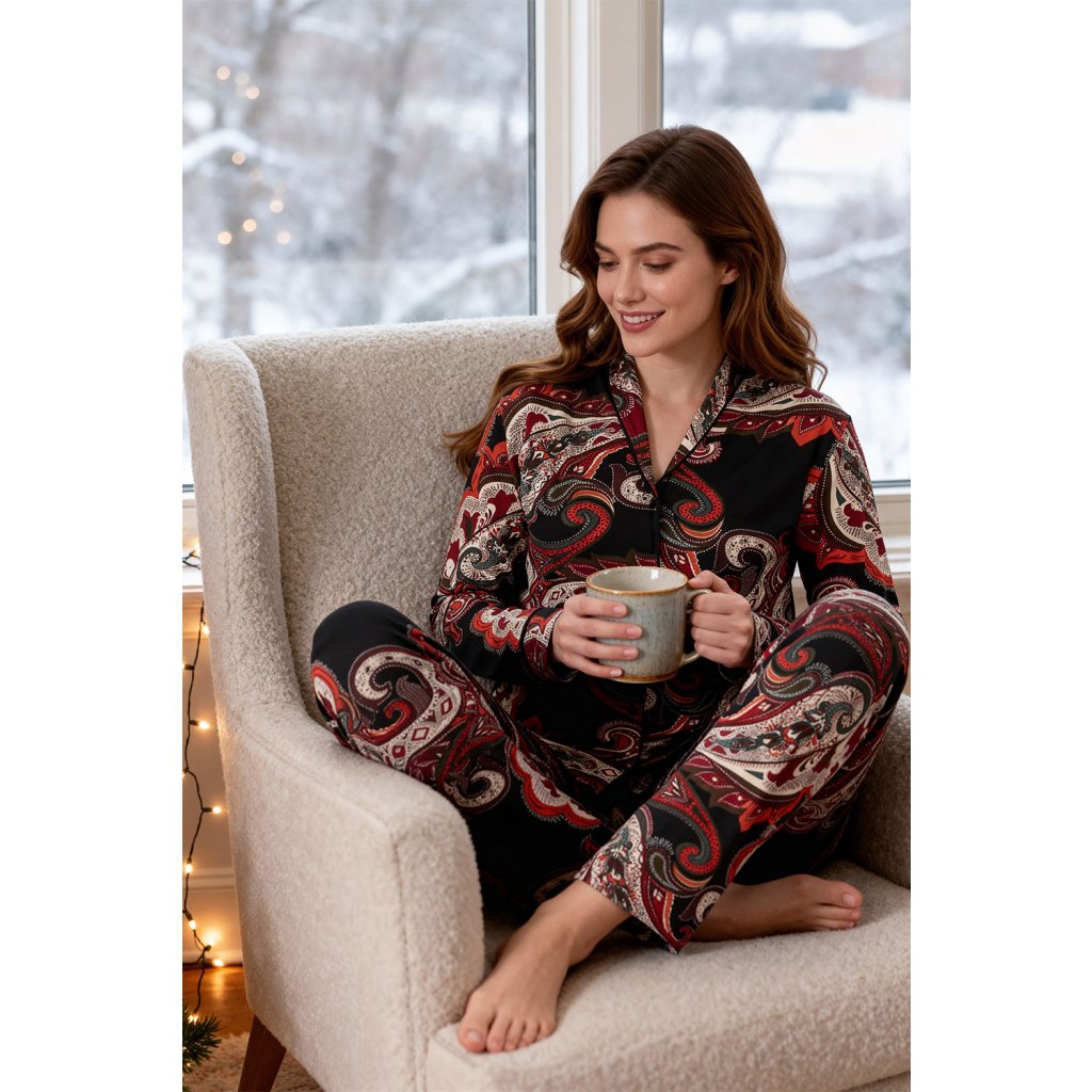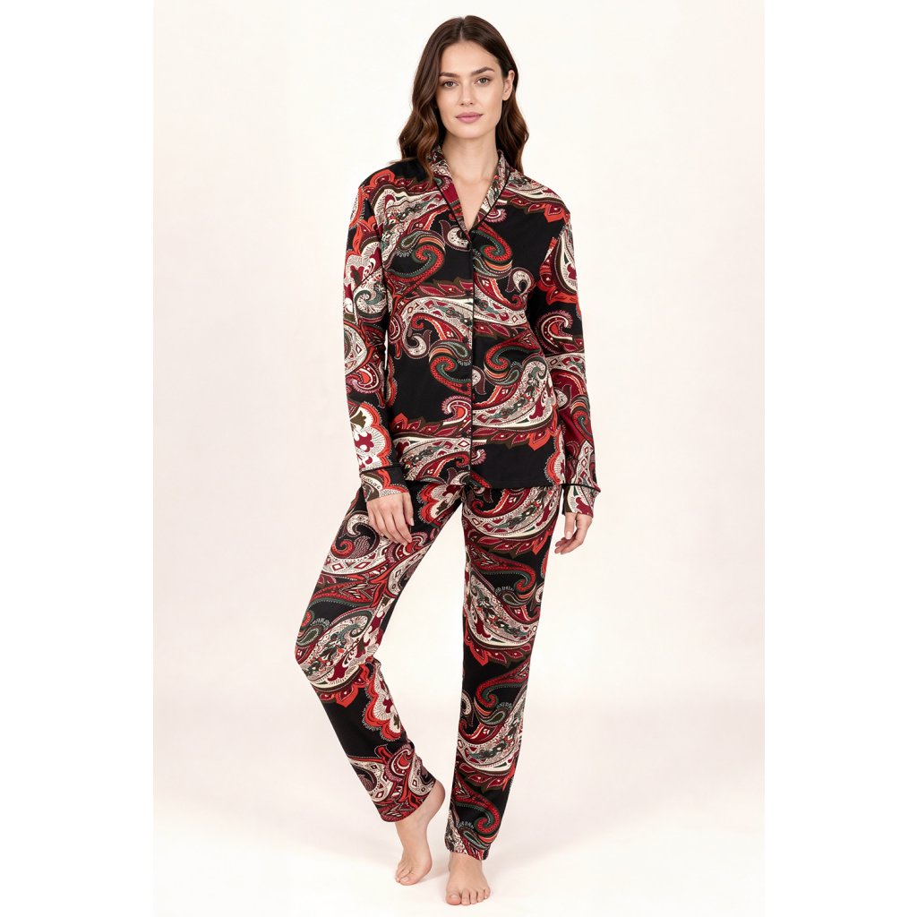 Pyžamo Vivisence 2063 kombinuje měkkost viskózy s elasticitou a zajišťuje pohodlí od prvního doteku. Vrchní díl má klasický košilový střih se zapínáním na knoflíky a výstřih do V, který decentně zvýrazňuje krk. Látka se vyznačuje elegantním dekorativním vzorem, který dodává pyžamu nadčasový nádech. Dlouhé rukávy jsou ideální pro chladnější večery a pečlivé zpracování zvyšuje pohodlí. Kalhoty jsou dlouhé a mají elastický pas, který zajišťuje pohodlné nošení a zabraňuje škrtení během spánku. Praktické kapsy zvyšují funkčnost soupravy pro domácí rituály. Látka je měkká na dotek a přizpůsobí se tělu, čímž usnadňuje volnost pohybu. Je to skvělá volba pro každodenní relaxaci, večerní čtení a dobrý noční spánek. Pokud si ceníte jednoduché elegance, klasického stylu a měkkých materiálů, je tento styl perfektní volbou.Měkký viskózový úplet s elastanem